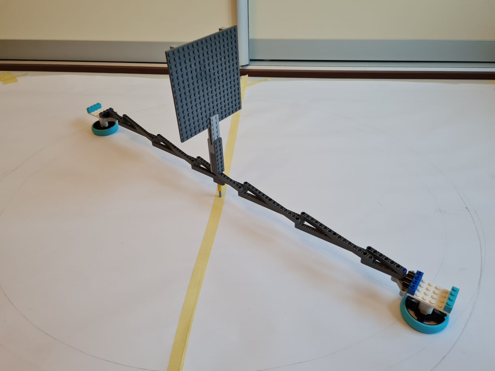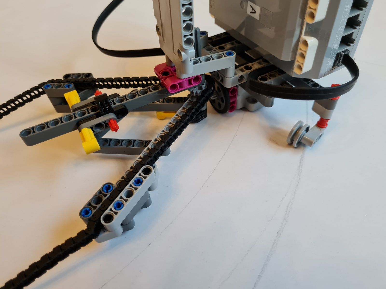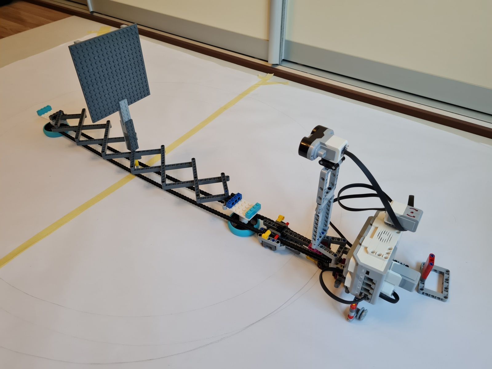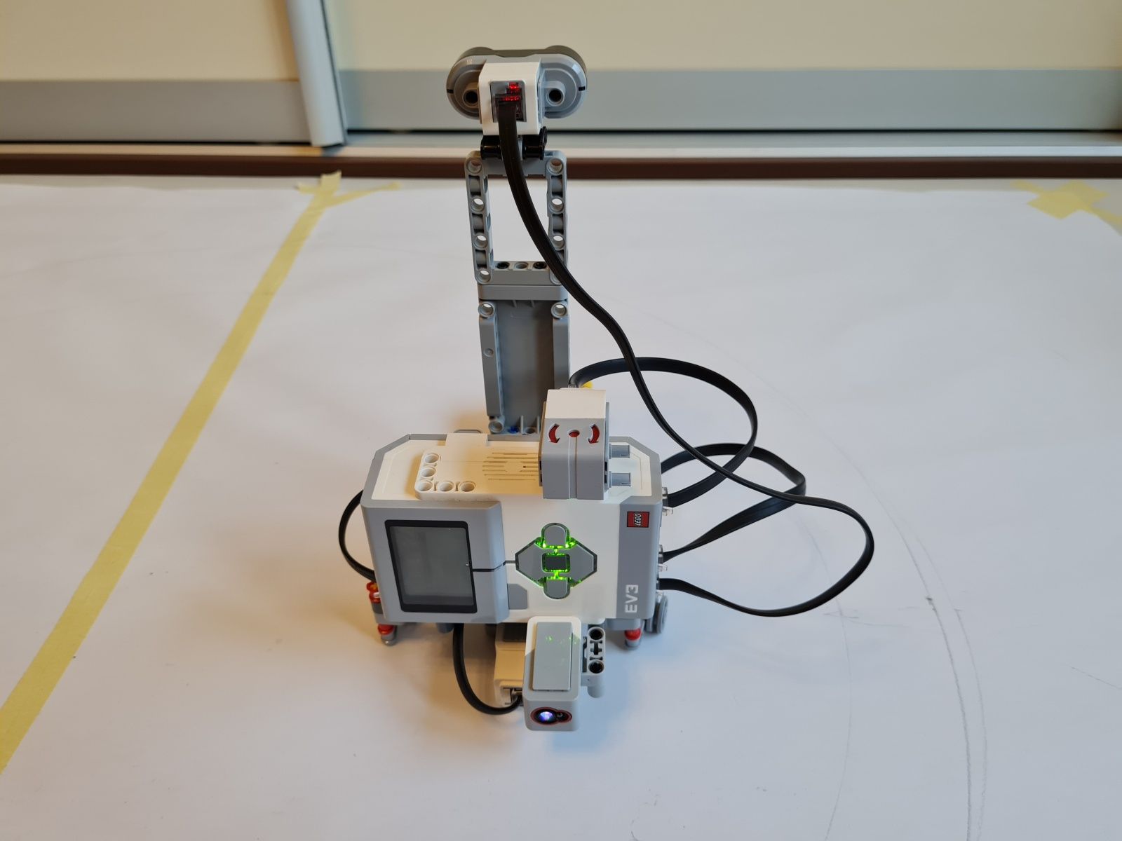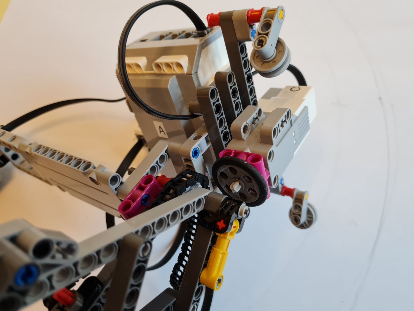 K riadiacej jednotke EV3 je pripojený stredný EV3 motor, ktorý slúži na pohyb, ultrazvukový snímač pre meranie vzdialenosti od stredu medzi ohniskami k okraju v najširšom mieste elipsy, gyroskopický snímač mal sledovať či už došlo k plnému otočeniu robota okolo osi – toto riešenie nefungovalo správne, preto bolo nahradené snímačom farby a červenou značkou, ktorá určuje, že robot vykonal jeden obeh okolo ohnísk elipsy. Uhol natočenia robota k ohniskám elipsy riadia vodiace ramená, cez ktoré prechádza reťaz. Grafit z ceruzky je umiestnený priamo pod uložením vodiaceho kolieska reťaze na robotovi.