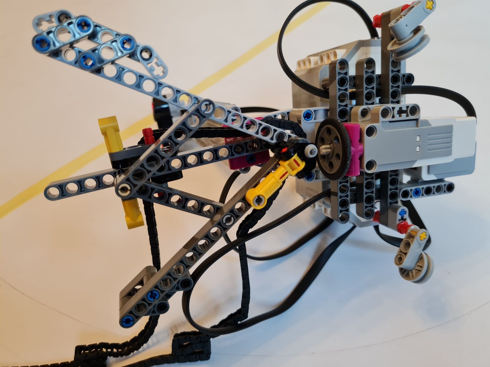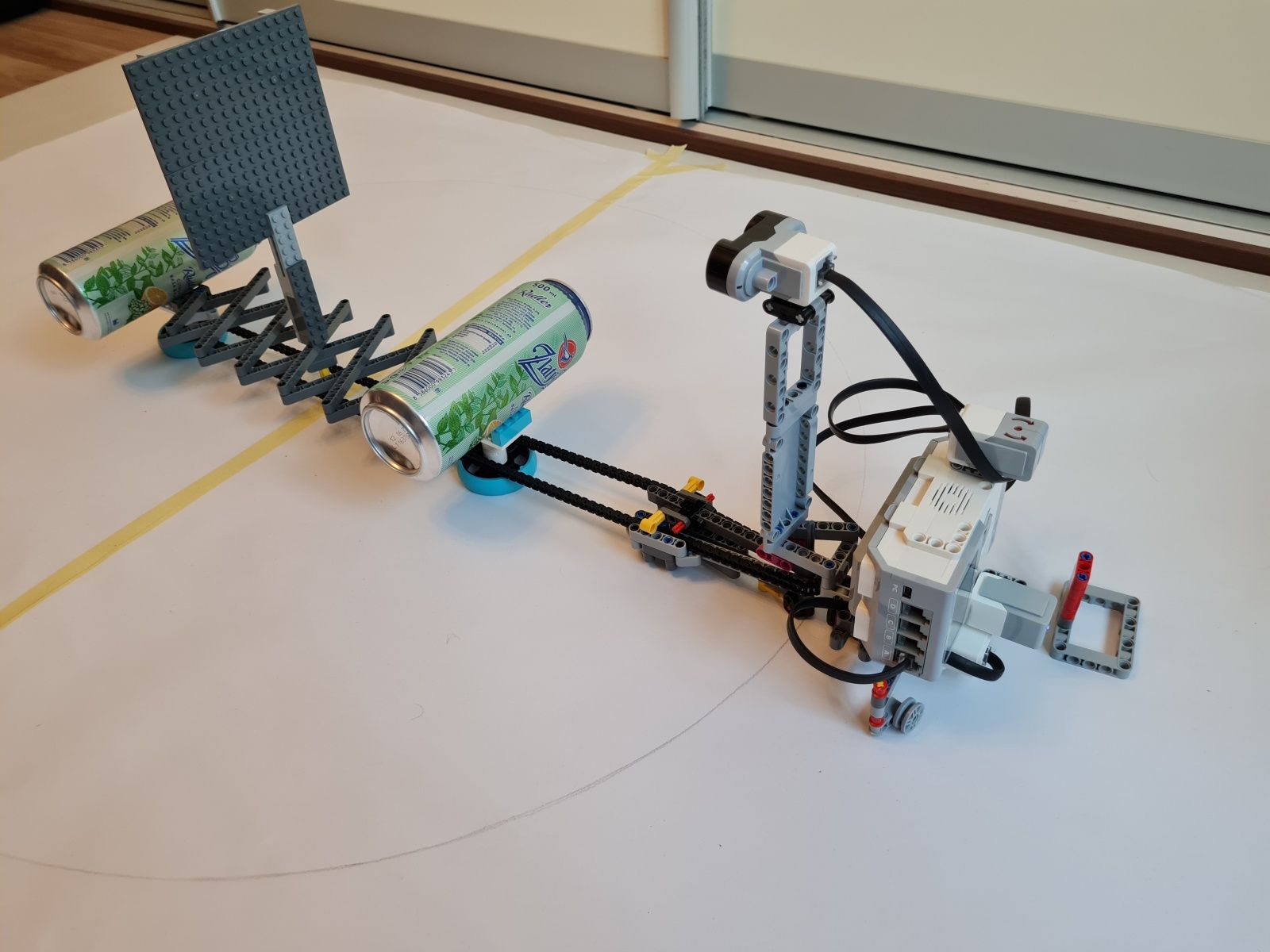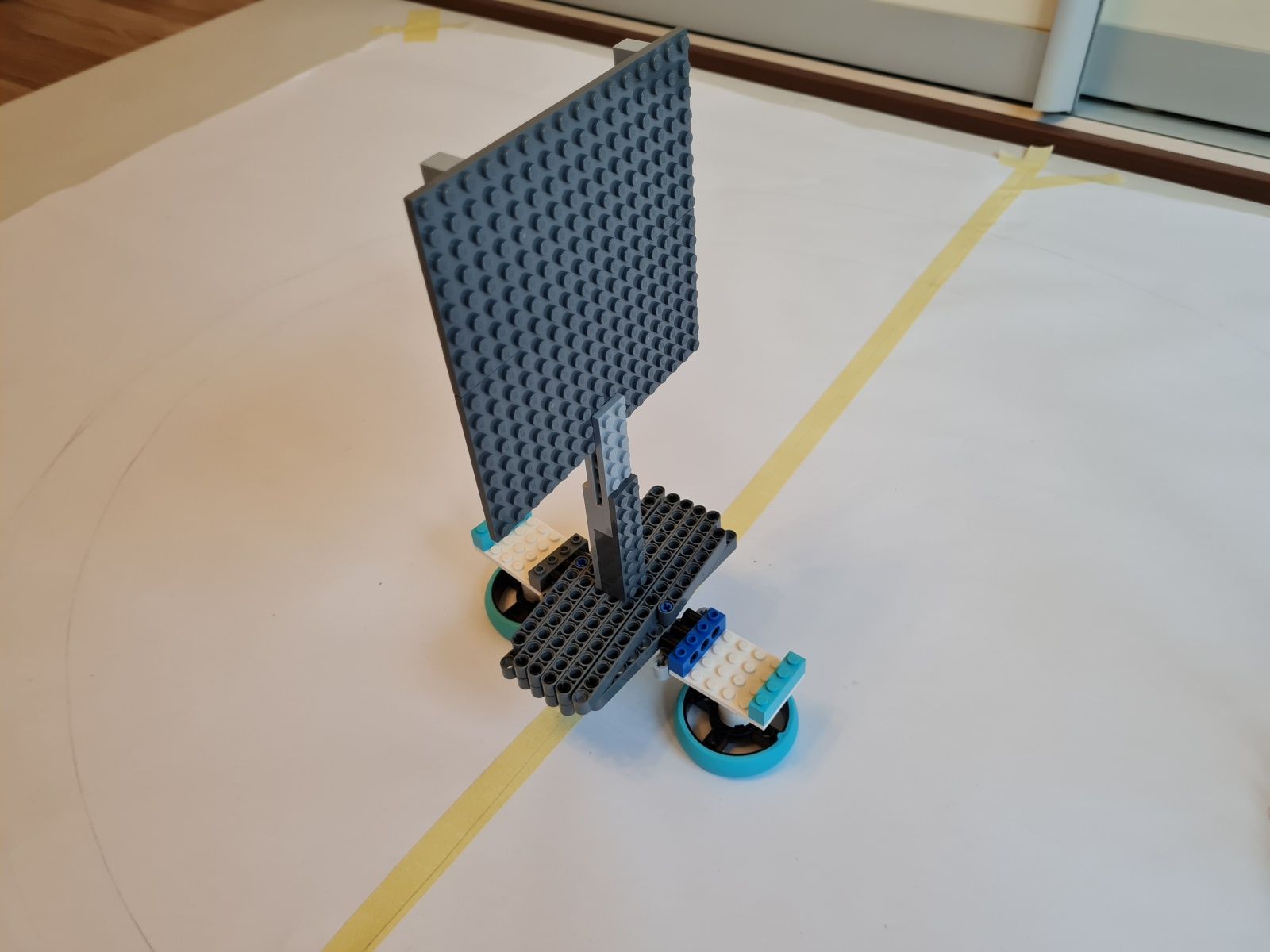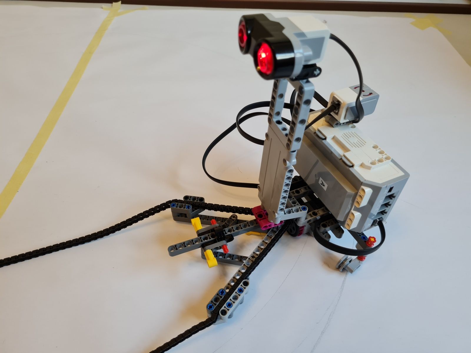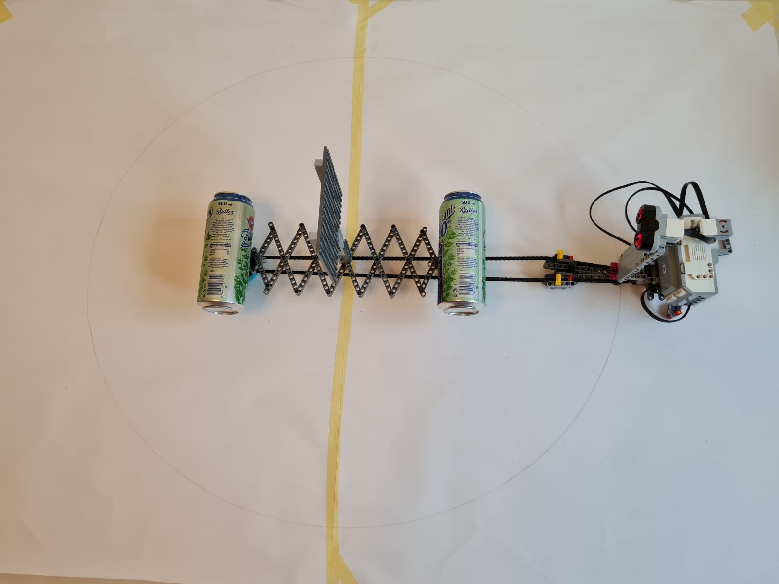 K riadiacej jednotke EV3 je pripojený stredný EV3 motor, ktorý slúži na pohyb, ultrazvukový snímač pre meranie vzdialenosti od stredu medzi ohniskami k okraju v najširšom mieste elipsy, gyroskopický snímač mal sledovať či už došlo k plnému otočeniu robota okolo osi – toto riešenie nefungovalo správne, preto bolo nahradené snímačom farby a červenou značkou, ktorá určuje, že robot vykonal jeden obeh okolo ohnísk elipsy. Uhol natočenia robota k ohniskám elipsy riadia vodiace ramená, cez ktoré prechádza reťaz. Grafit z ceruzky je umiestnený priamo pod uložením vodiaceho kolieska reťaze na robotovi.