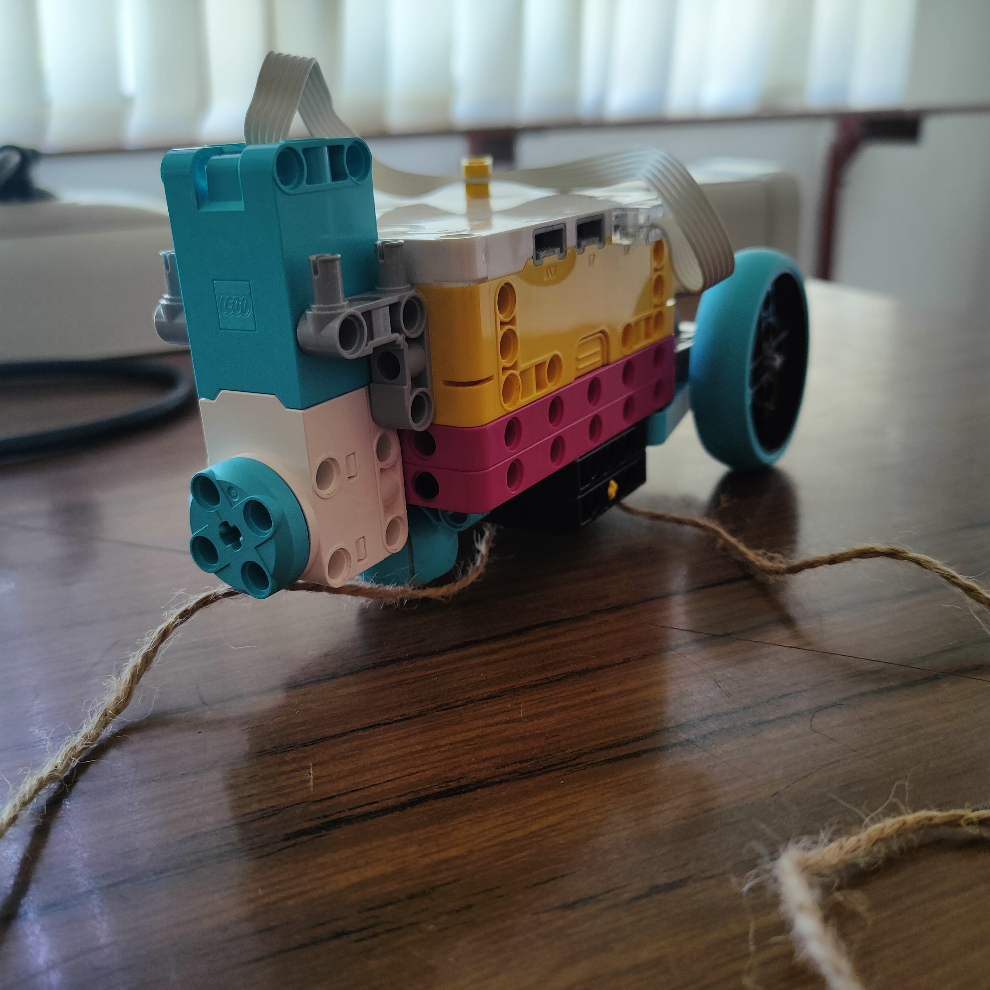 Autíčko sa skladá z riadiacej jednotky, na ktorú je zozadu napojený diferenciál. Spredu je na riadiacu jednotku pripojený motorček, ktorý pomocou prevodovky poháňa kolesá. Elipsu sme sa najprv pokúsili spraviť na papier. Najprv sme sa pokúsili použiť naše prsty ako ohniská ale zlyhali sme. Ďalej sme ako ohniská použili ihly zapichnuté v zošite, ale to tiež nefungovalo, tak sme ich zabili do stola, ale to takisto stále nefungovalo, potom sme sa pokúsili nakresliť elipsu tak že sme ihly zabili do podlahy, ale to taktiež zlyhalo. Nakoniec sme použili skrutky zašrubované do dosky, a to už fungovalo.