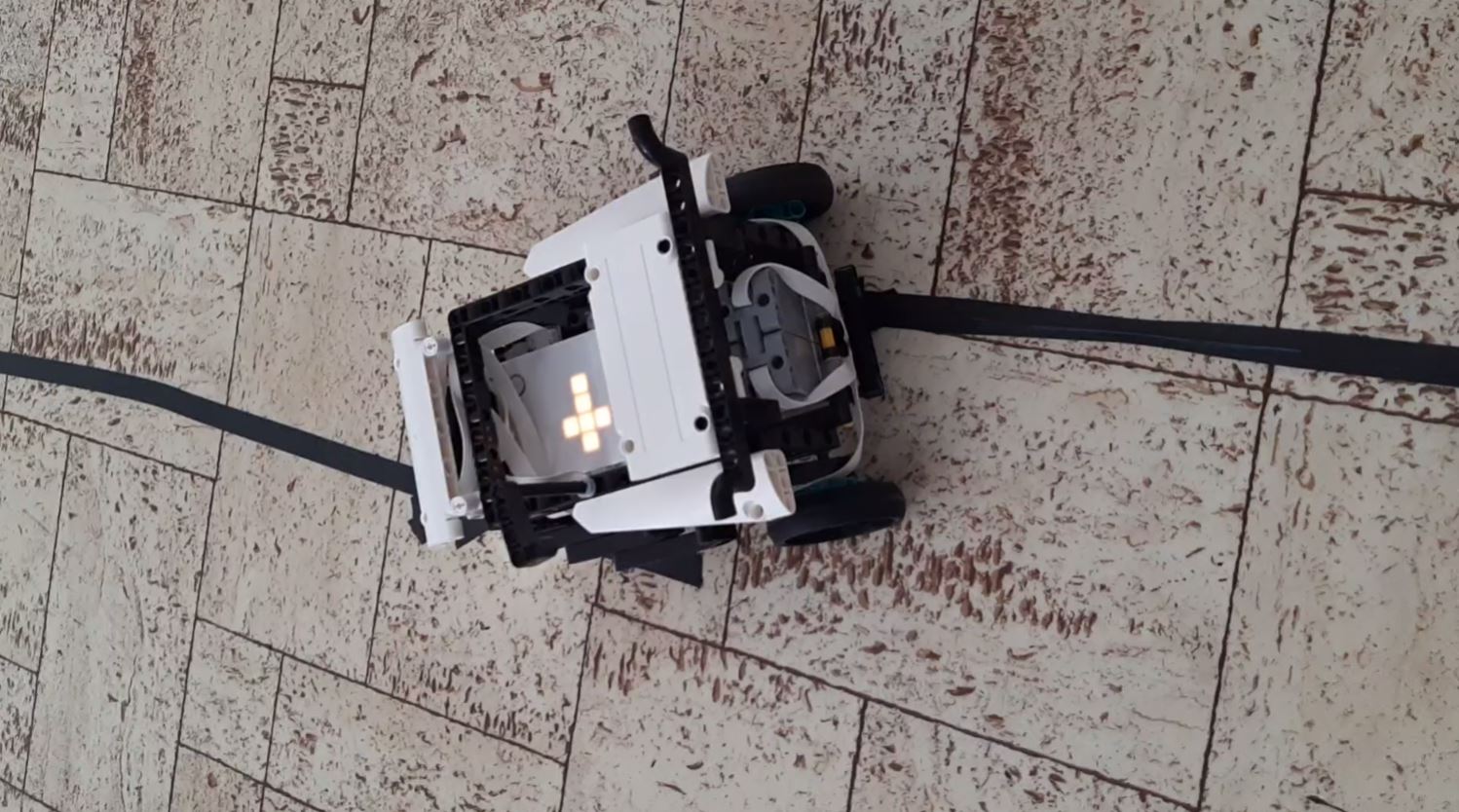 Robota sme naučili sledovať čiaru. V programe je rozpísané, ako bude robot správať podľa senzorov farby. Snaží sa ísť vždy uprostred. Pri zákrute sa spomalí, aby ju zvládol. A potom pokračuje ďalej po čiare rovno.