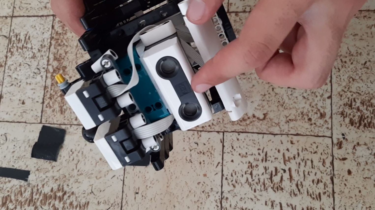 Náš robot sa pozostáva z troch senzorov, z dvoch veľkých kolies, z jedného malého kolesa a z dvoch motorov.