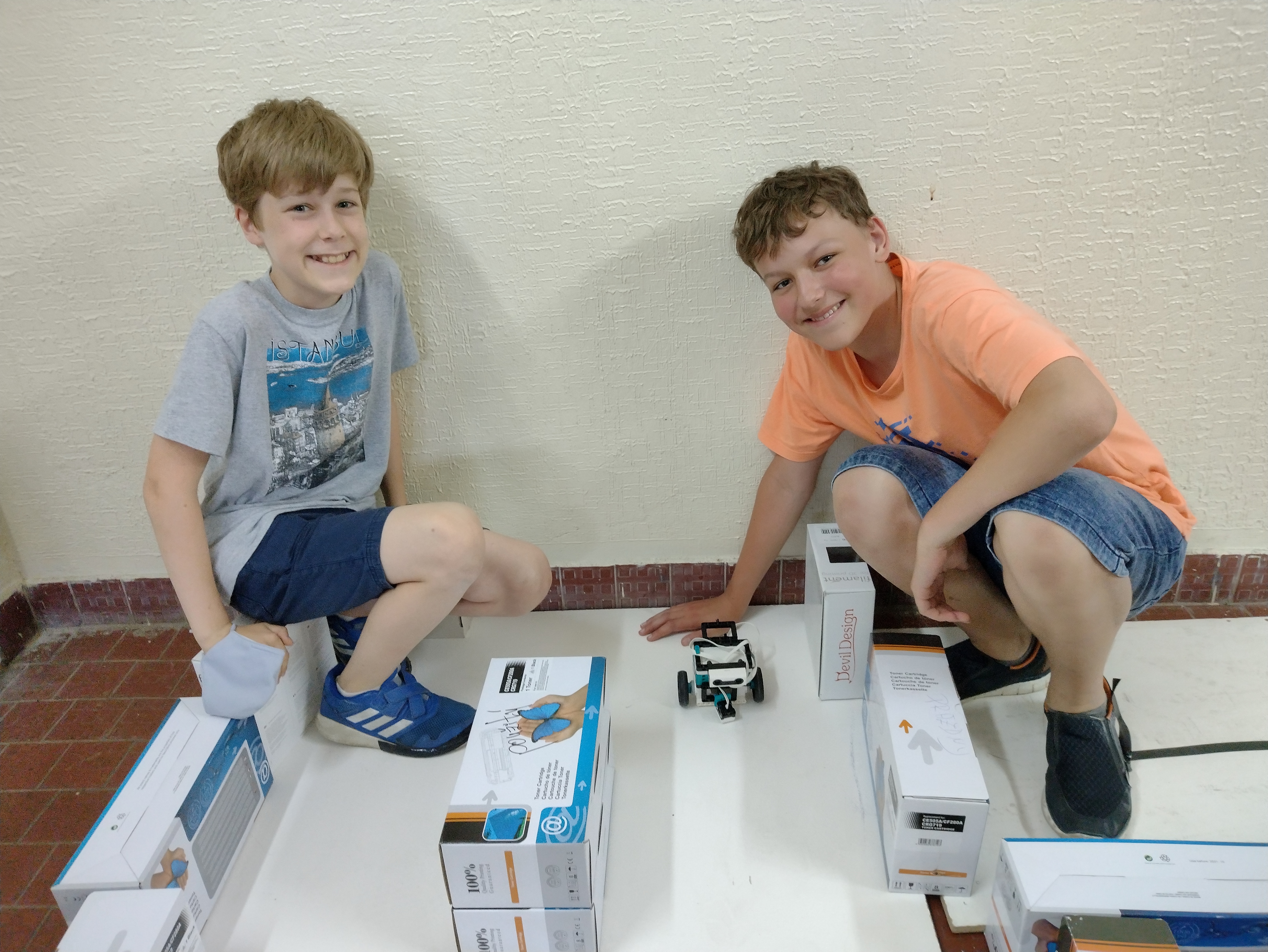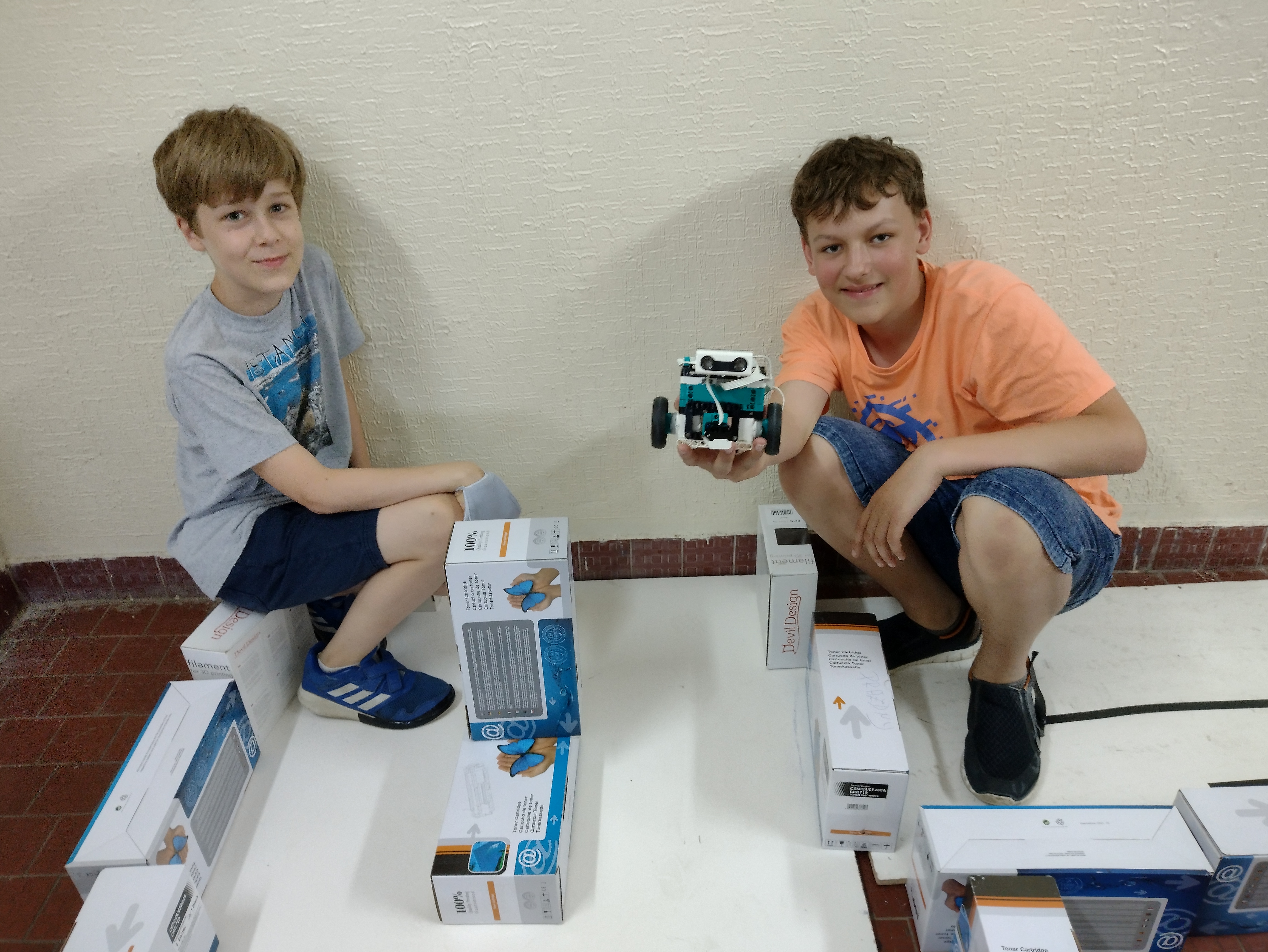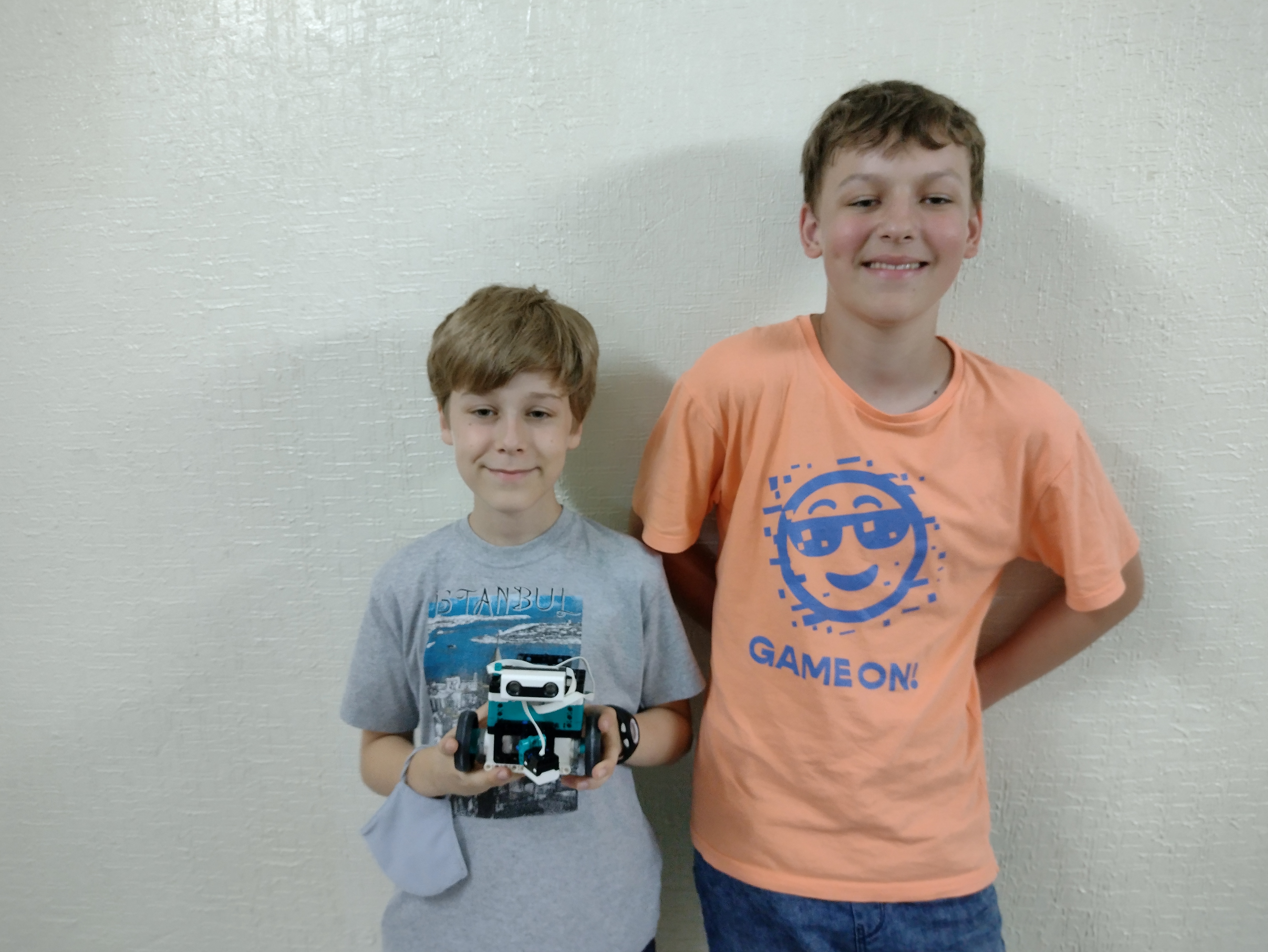 1. Páči sa mi komentované video a obrovské množstvo fotiek :) Je vidieť, že vás úloha bavila a vytvorili ste rôzne úlohy. 2. Veľmi pekné riešenie, takto nejako som si to aj predstavoval. Naozaj robot na začiatku nevie ako sa má správať a postupným učením sa to naučí. Trocha príliš krátke video, mohlo tam byť ukázaných aj viac situácií. 3. Ahojte Dubáci, pekné ste opísali váš model. Super, že ste sa snažili aj konštrukciu koliesok vylepšiť .... časom to pôjde určite lepšie :) Prvá ukážka, ako učíte robota bola dobrá. Keby ste ho naučili dva rôzne pohyby, bola ešte skvelejšia. A druhú ukážku - chodenie po čiare nehodnotím až tak dobre, lebo ste jasne nevysvetlili, čo ho učíte a čo už vie. 4. Krásne riešenie. Môjmu programátorskému oku by ulahodilo, keby sa aj ten riadok dal z tých nameraných hodnôt vypočítať, ale aj takáto metóda funguje. Škoda, že sa nepodarilo rozchodiť to jazdenie po čiare, ale úloha je (takmer) splnená (až na tú vetu "Naučte takýmto spôsobom robota aspoň tri rôzne správania"). Operačný systém sa vám tam trochu zaplietol. :-)) A viete vôbec, čo to operačný systém je? Nemyslím na raňajky. :-) Obávam sa, že v tejto riadiacej jednotke žiaden operačný systém nie je, alebo žeby predsa? Páči sa mi, že ste odprezentovali aj to, čo ste skúšali, ale nepodarilo sa. Môžete sa aj zamyslieť prečo sa to nepodarilo, čo presne ste chceli dosiahnuť a aké boli prekážky? Želáme pekné prázdniny!
