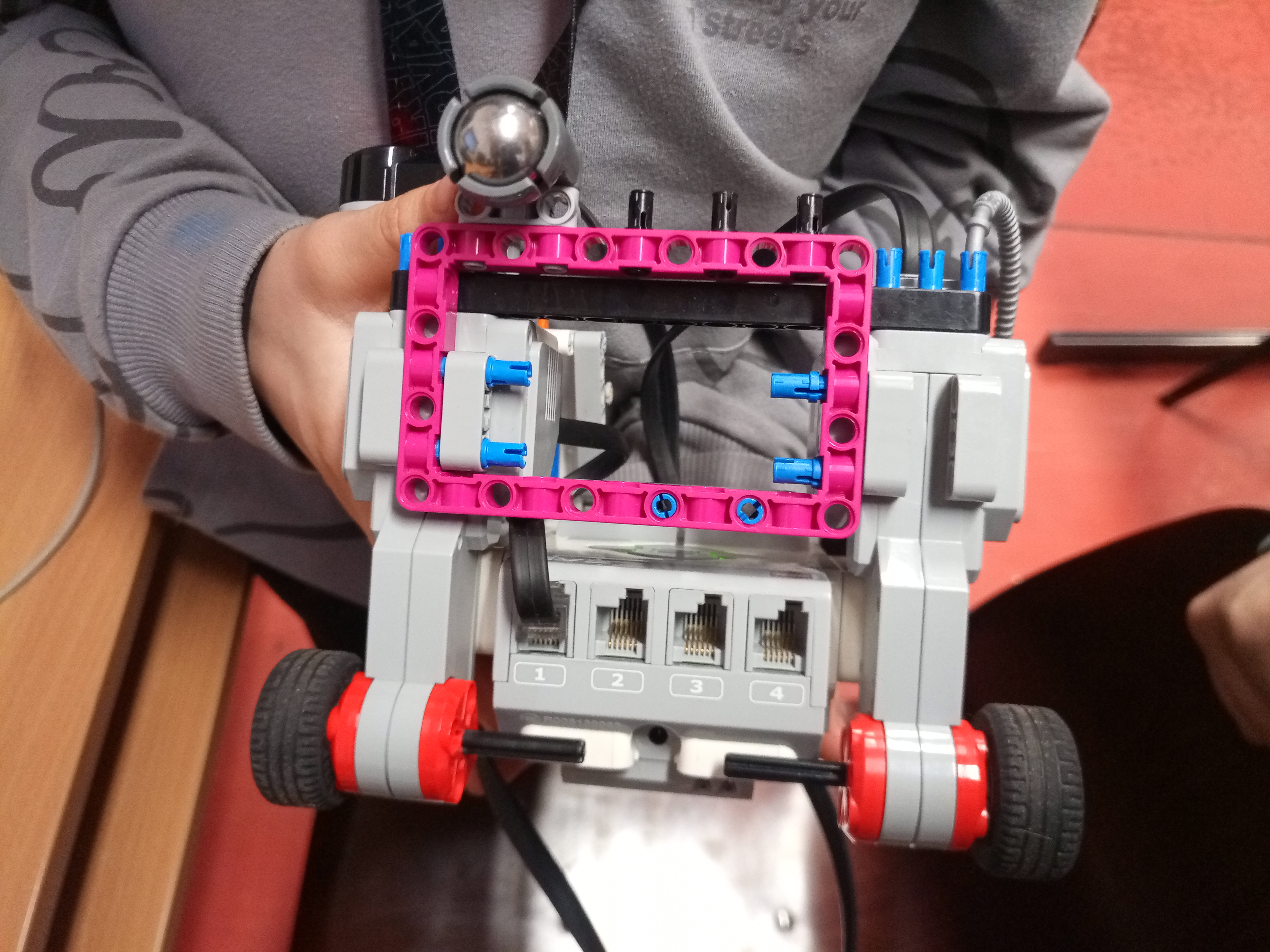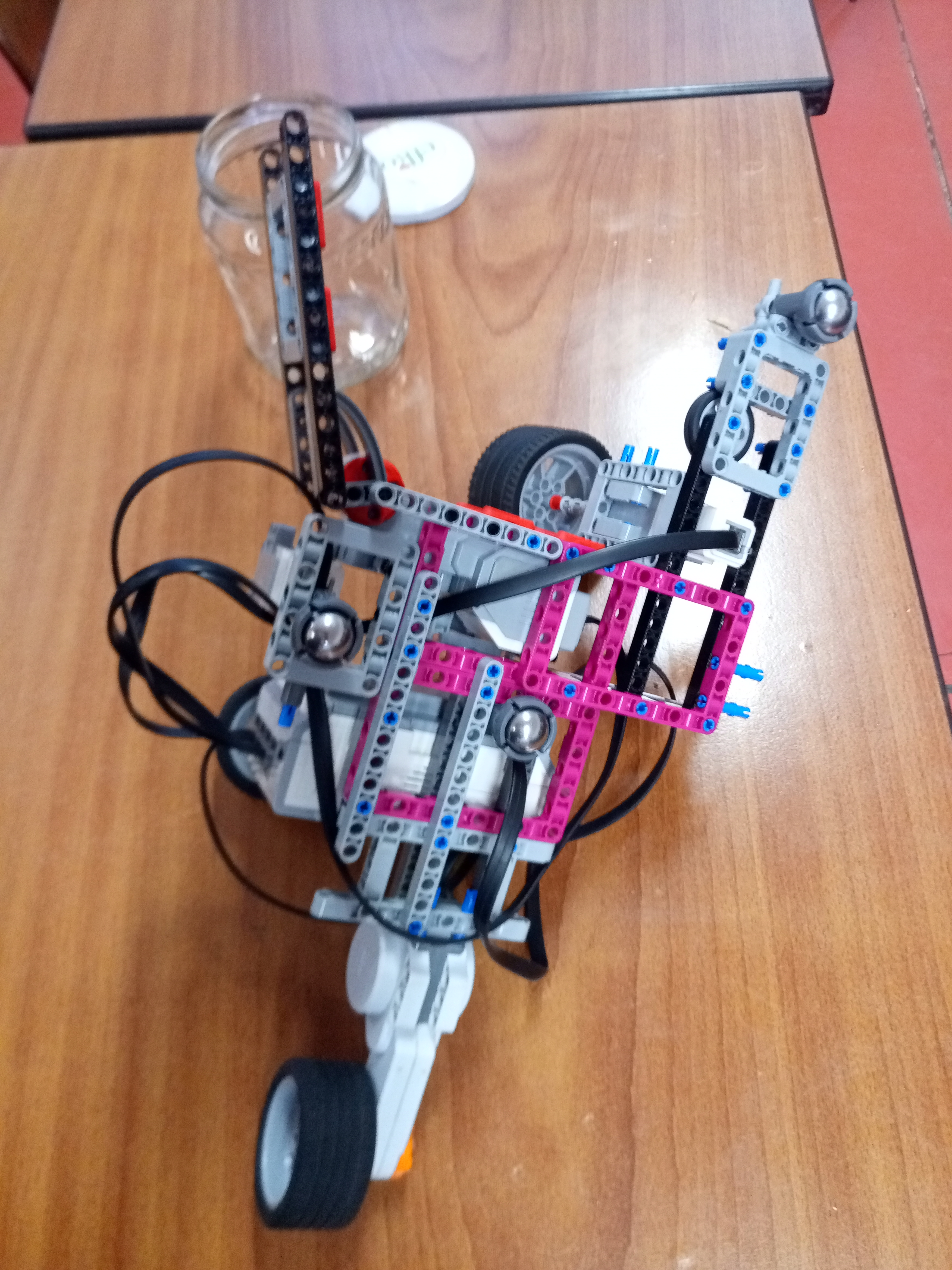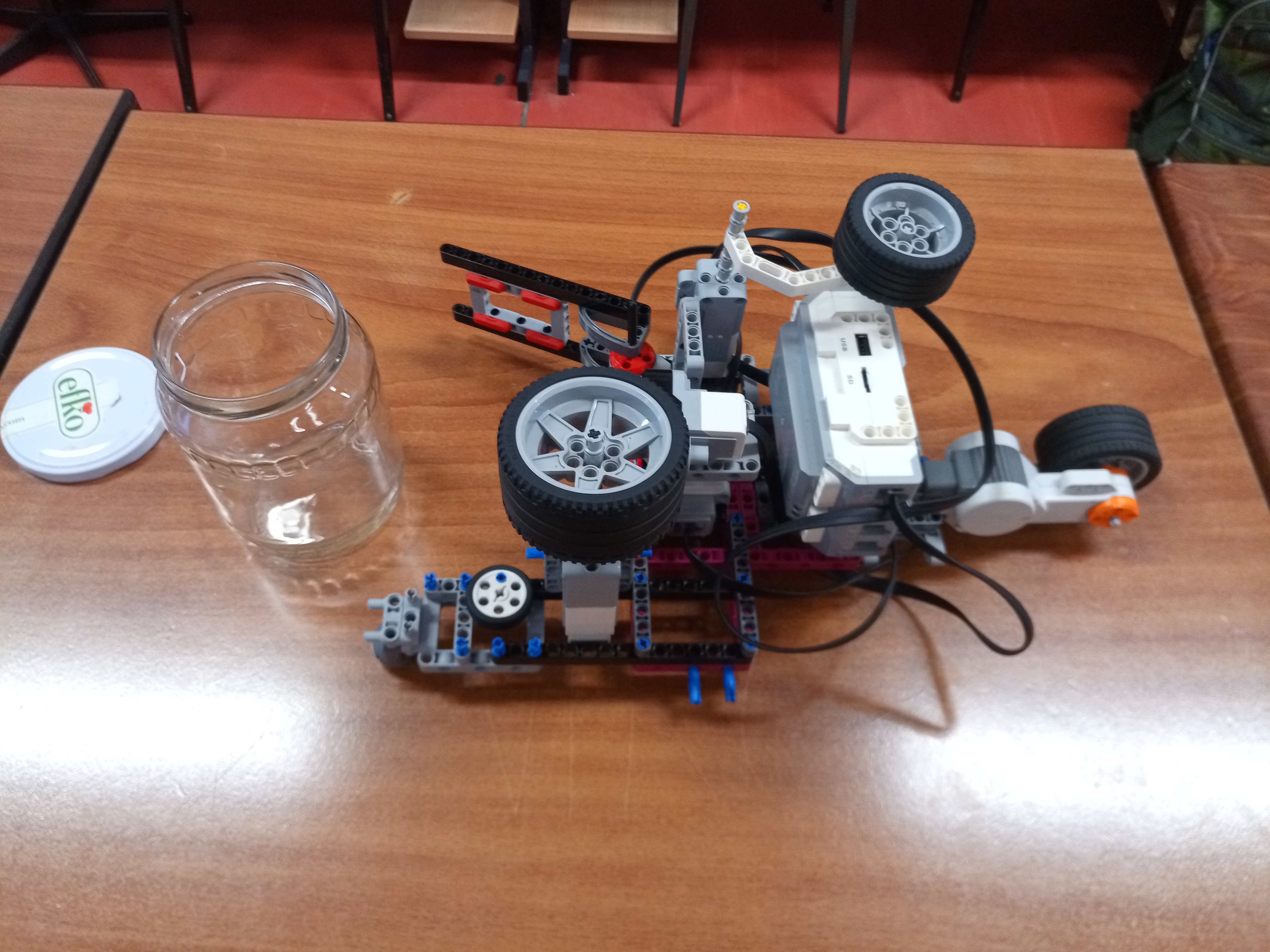 Najprv sme chceli zhodiť vrchnák jemne a na druhom motore bola hadička, ktorá bola jemná ale nefungovala. tak sme na ten druhý motor dali veľké gumené koleso, ktoré dáva pecku, ale aspoň vrchnák zhodí.