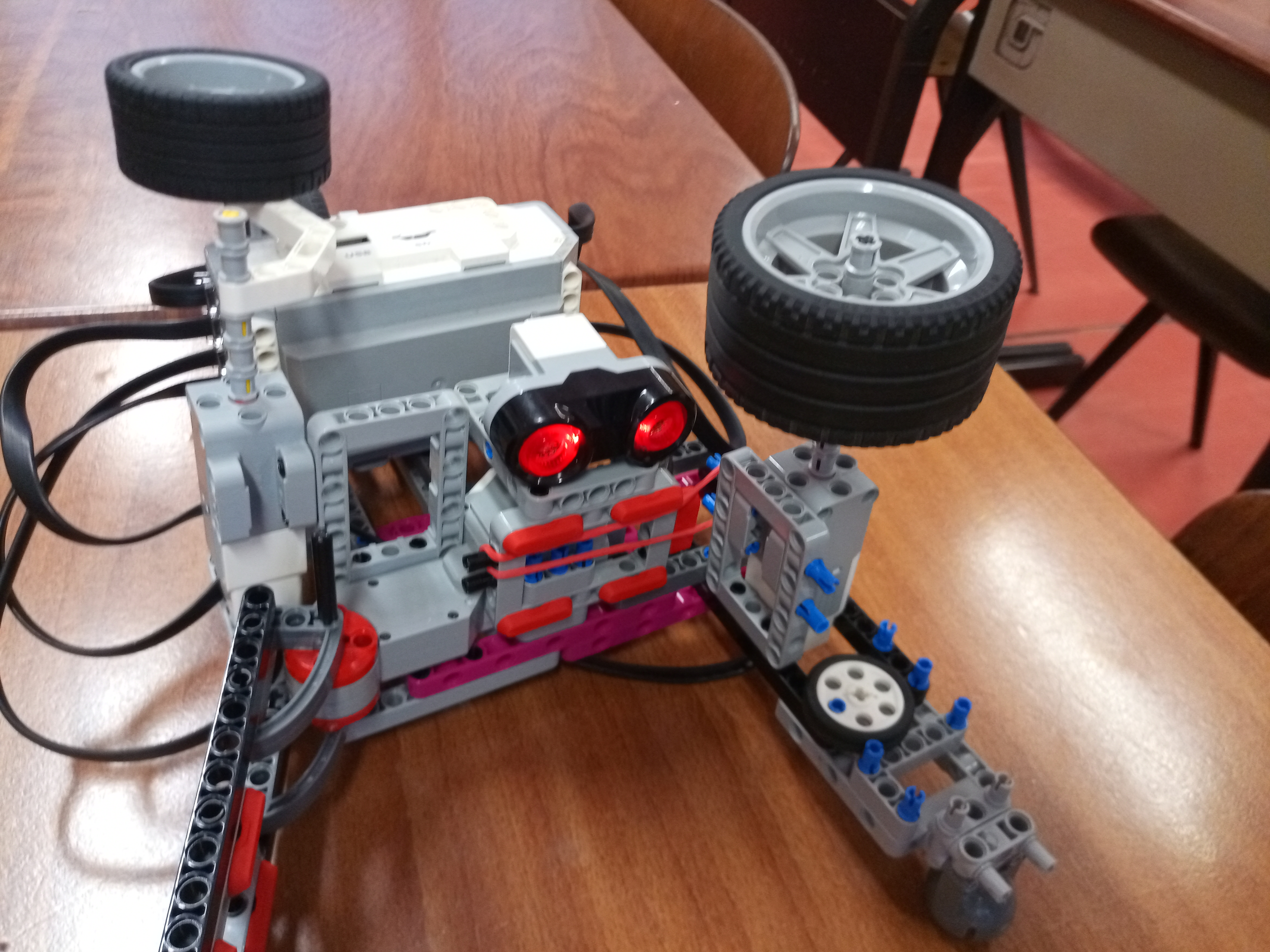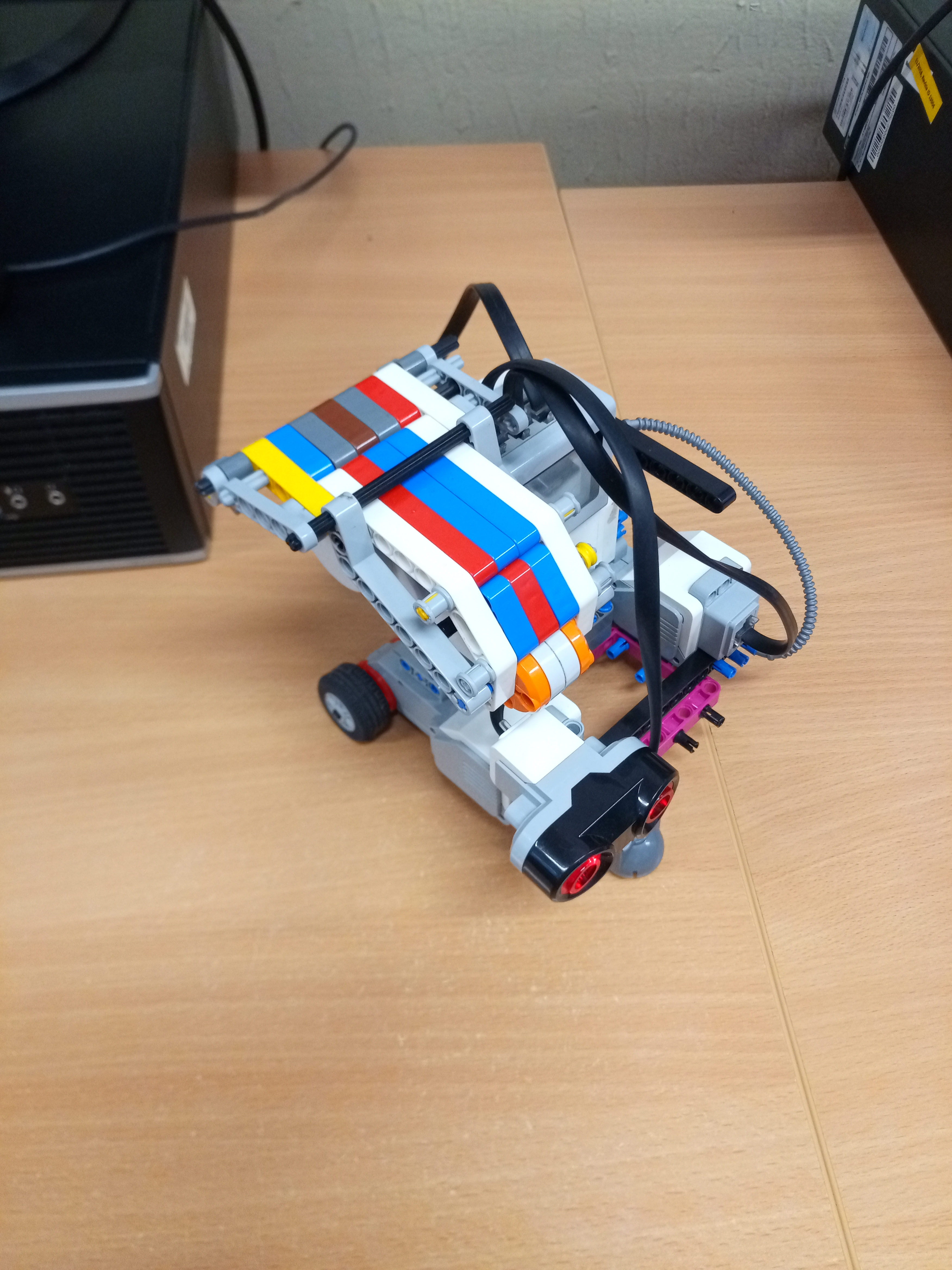 Náš robot sa skladá z kocky EV3, z 3 veľkých motorov a z 1 usg senzora. 2 motory slúžia na pohyb a 1 na vyklopenie hasiacej látky.