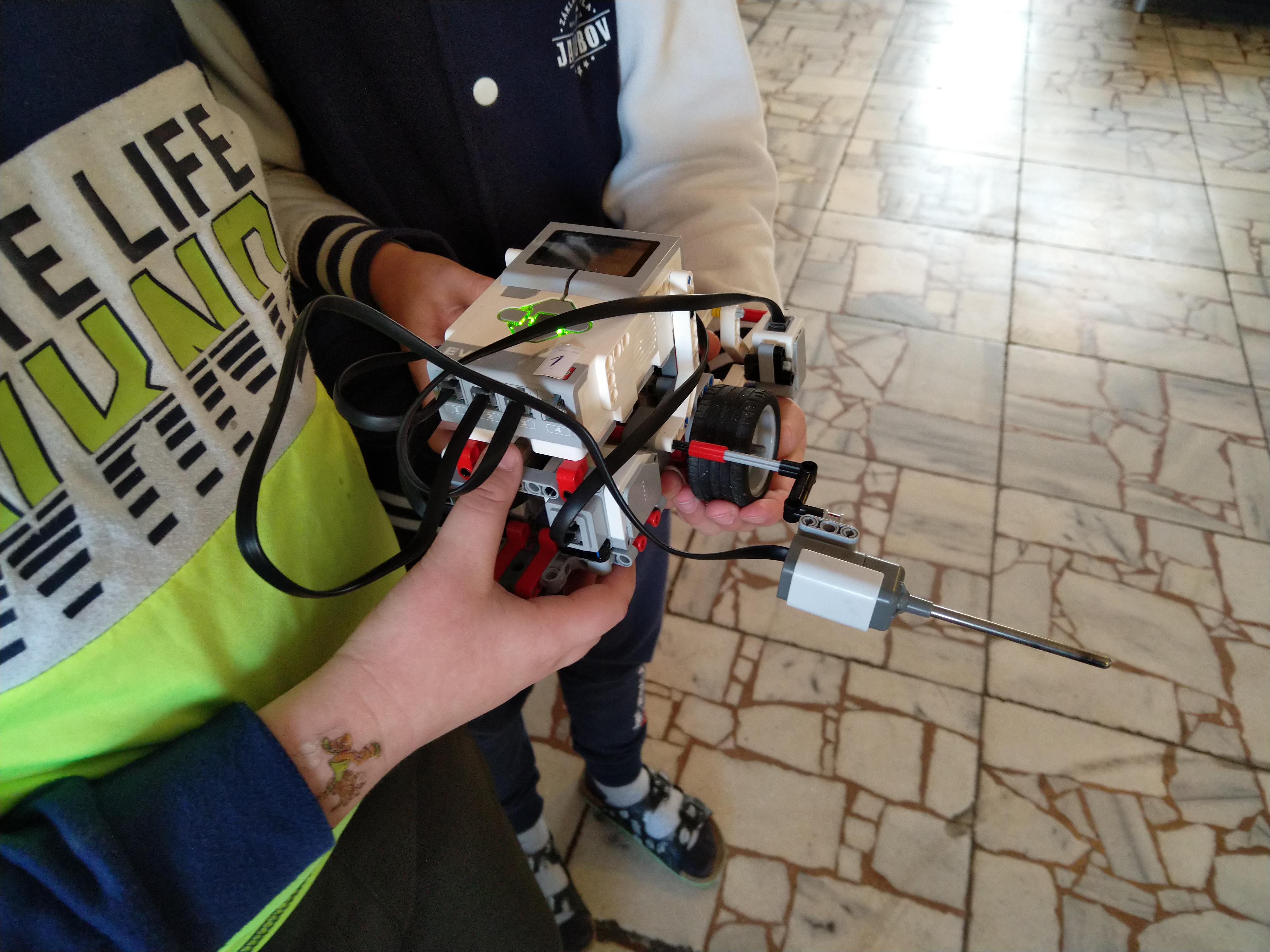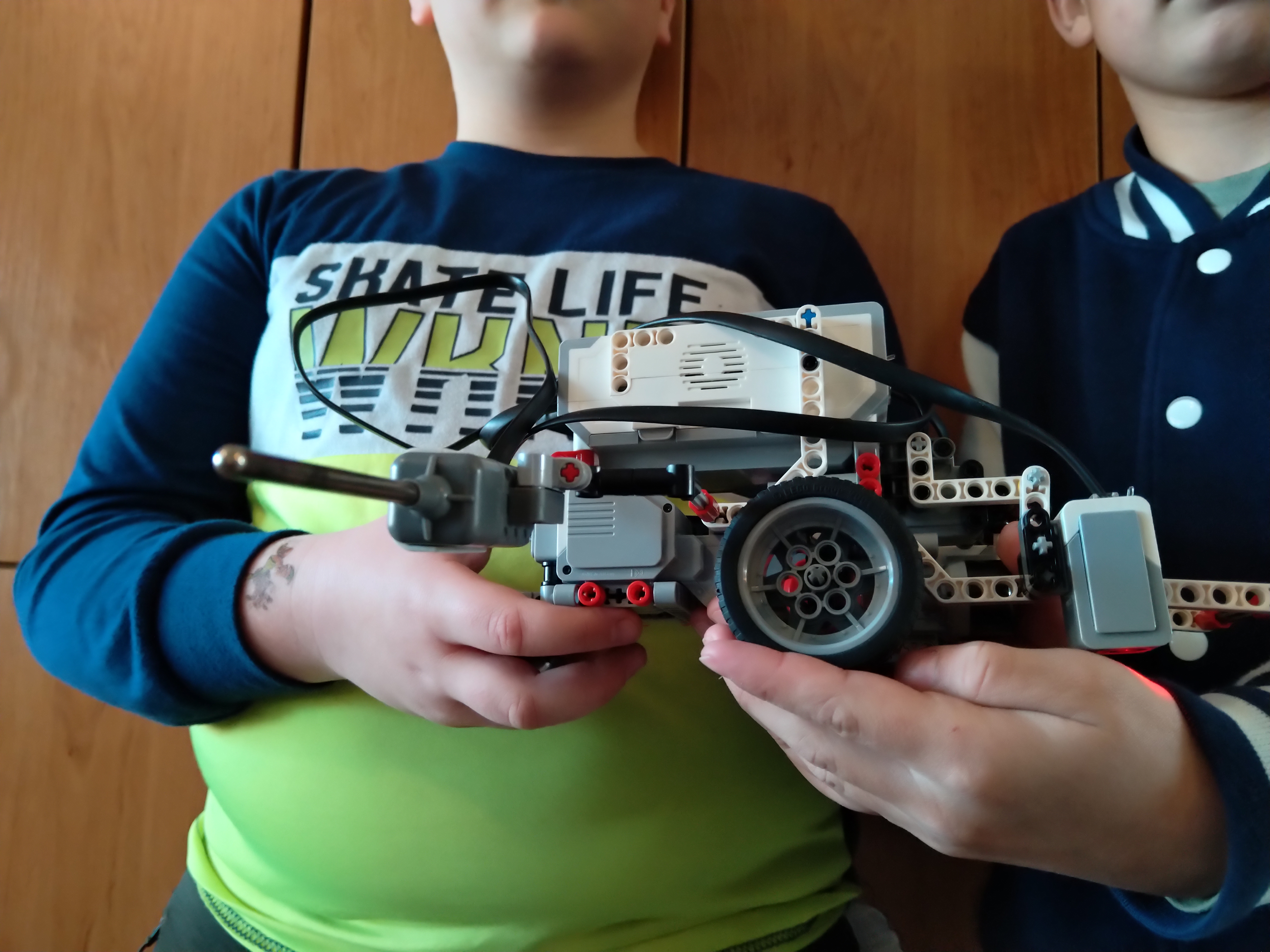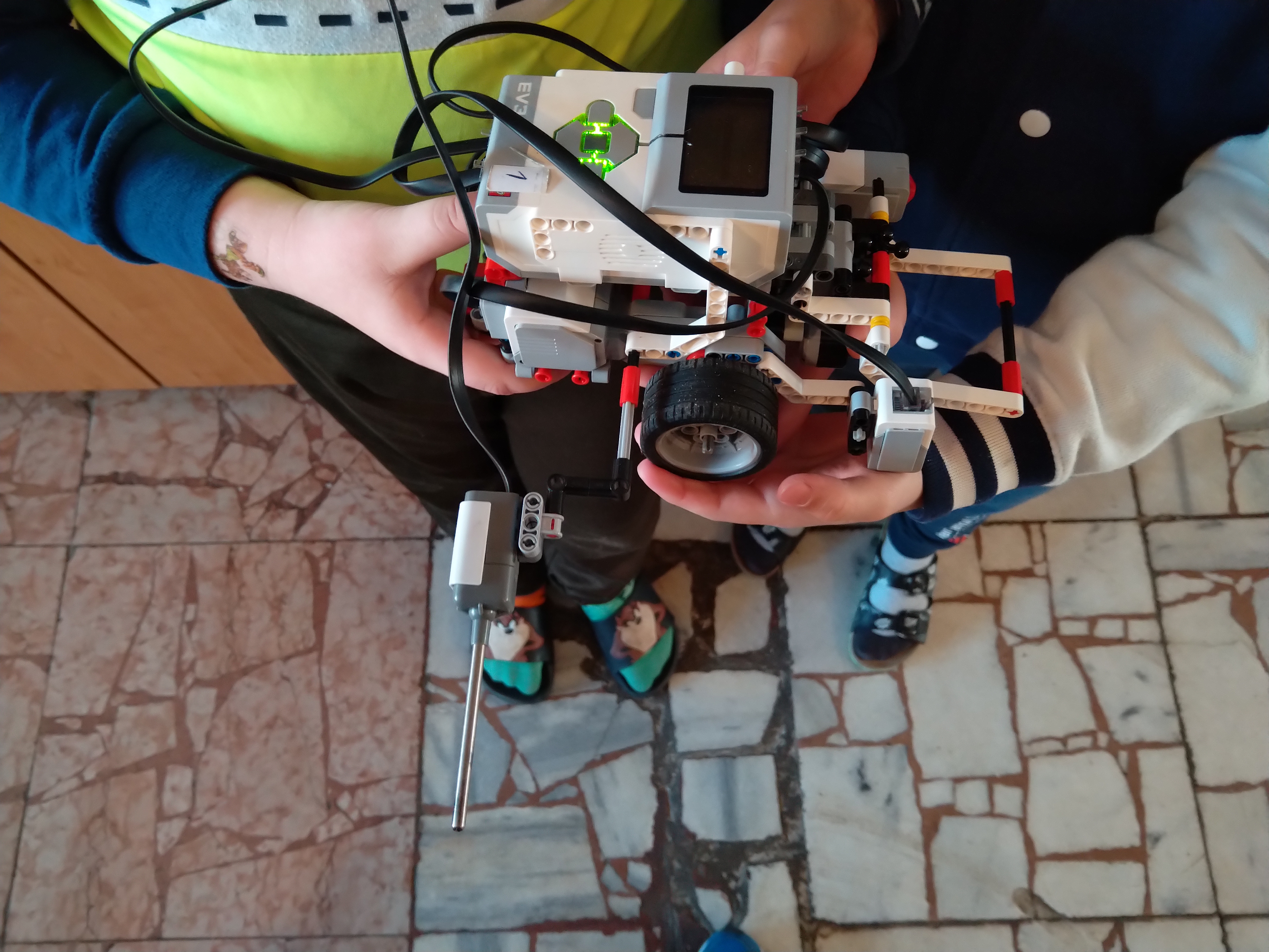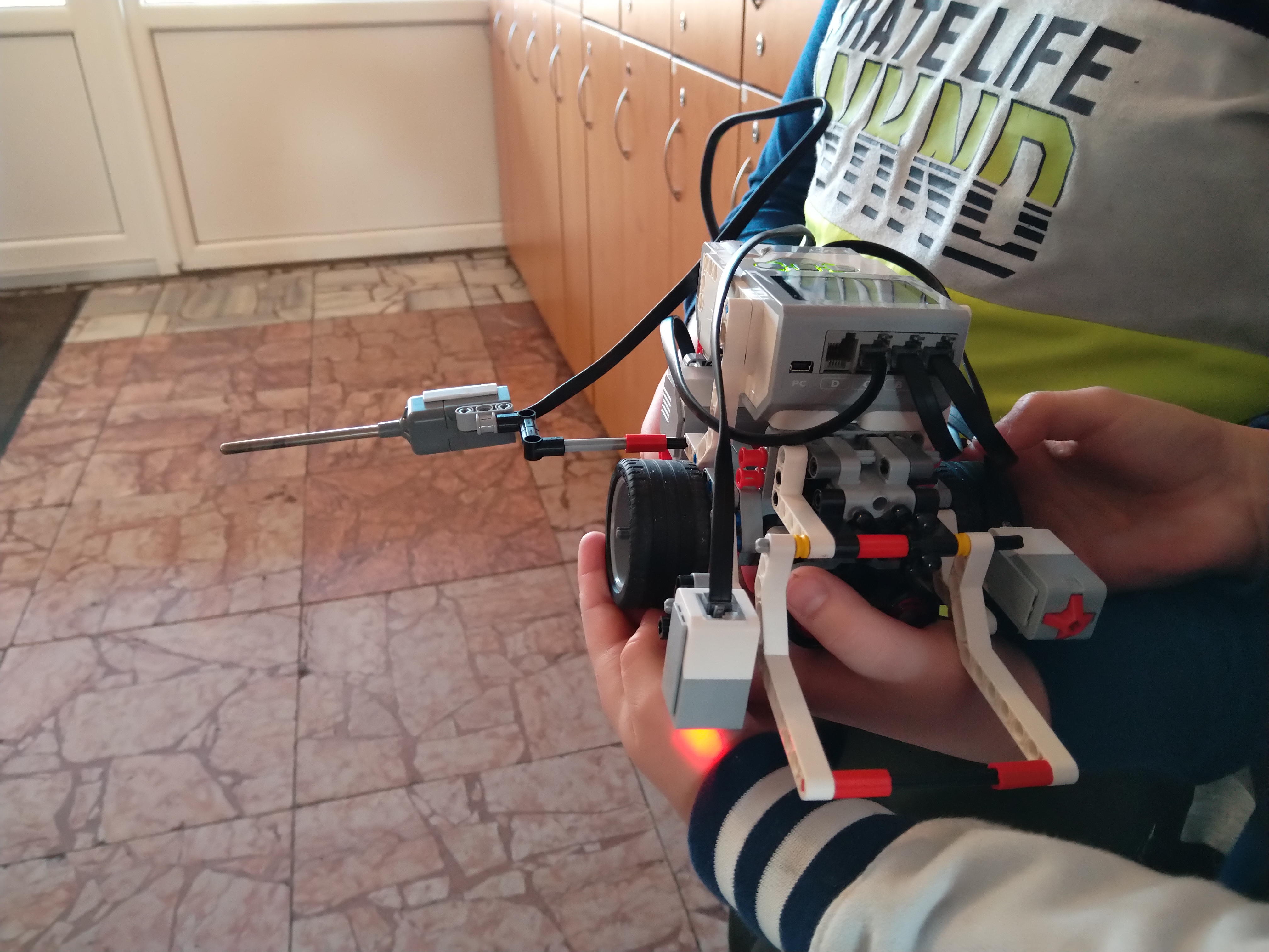 Robot je postavení podľa návodu (https://education.lego.com/v3/assets/blt293eea581807678a/blt9f94cc95ebe17900/5f8801dd69efd81ab4debf02/ev3-medium-motor-driving-base.pdf), ale má pridaný teplotní senzor. Má dve kolesá a jedno malé koleso vzadu. Má jeden svetelní, ultrasonický a dotykový senzor, ale nemajú využitie.