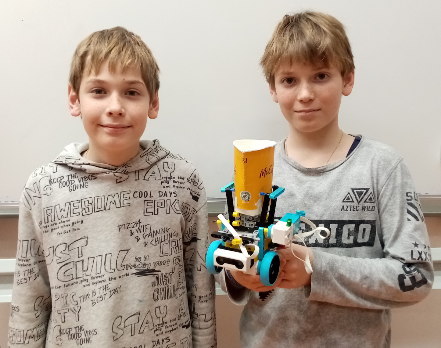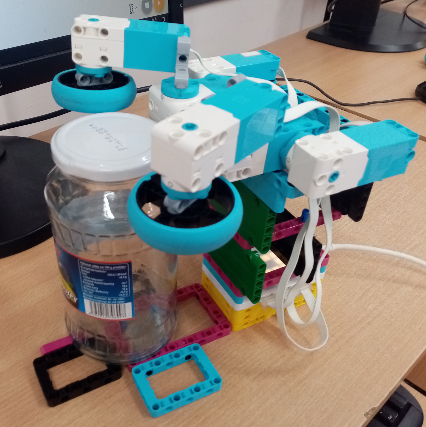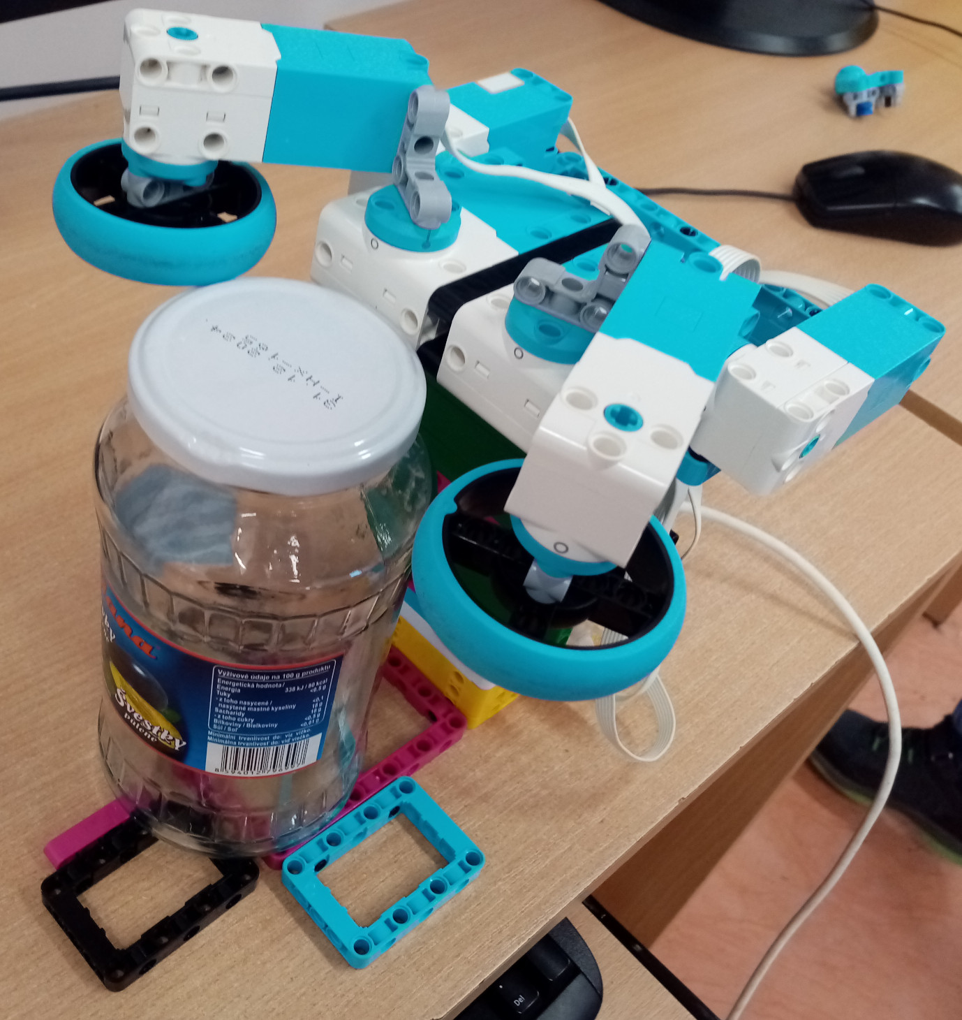 1. Pekná konštrukcia, ktorá dokáže to viečko aj podvihnúť a dať nabok. Zaujímalo by ma, či ste skúšali ako najsilnejšie zatiahnuté viečko viete odkrútiť. 2. Za úlohu kompót získavate 3b. Pekné riešenie. 3. Super, pohár ste otvorili :) Možno by to chcelo ešte doladiť uchopenie pohára. aby ho jeden z členov nemusel držať v ruke ;) 4. O tomto robotovi by sa ani nedalo povedať, že má pripevnené motory na konštrukcii, ale že má konštrukciu pripevnenú na motory. Je ich trochu veľa, možno by sa dal aspoň jeden alebo dva ušetriť, aby robot stále vykonával tú istú úlohu? Všetky tri dvojice sa vždy točia/hýbu spolu, takže ten pohyb by asi vedel dodať vždy iba jeden motor namiesto dvoch..? Funguje to ako má, aj keď pohár bolo treba pridŕžať rukou.