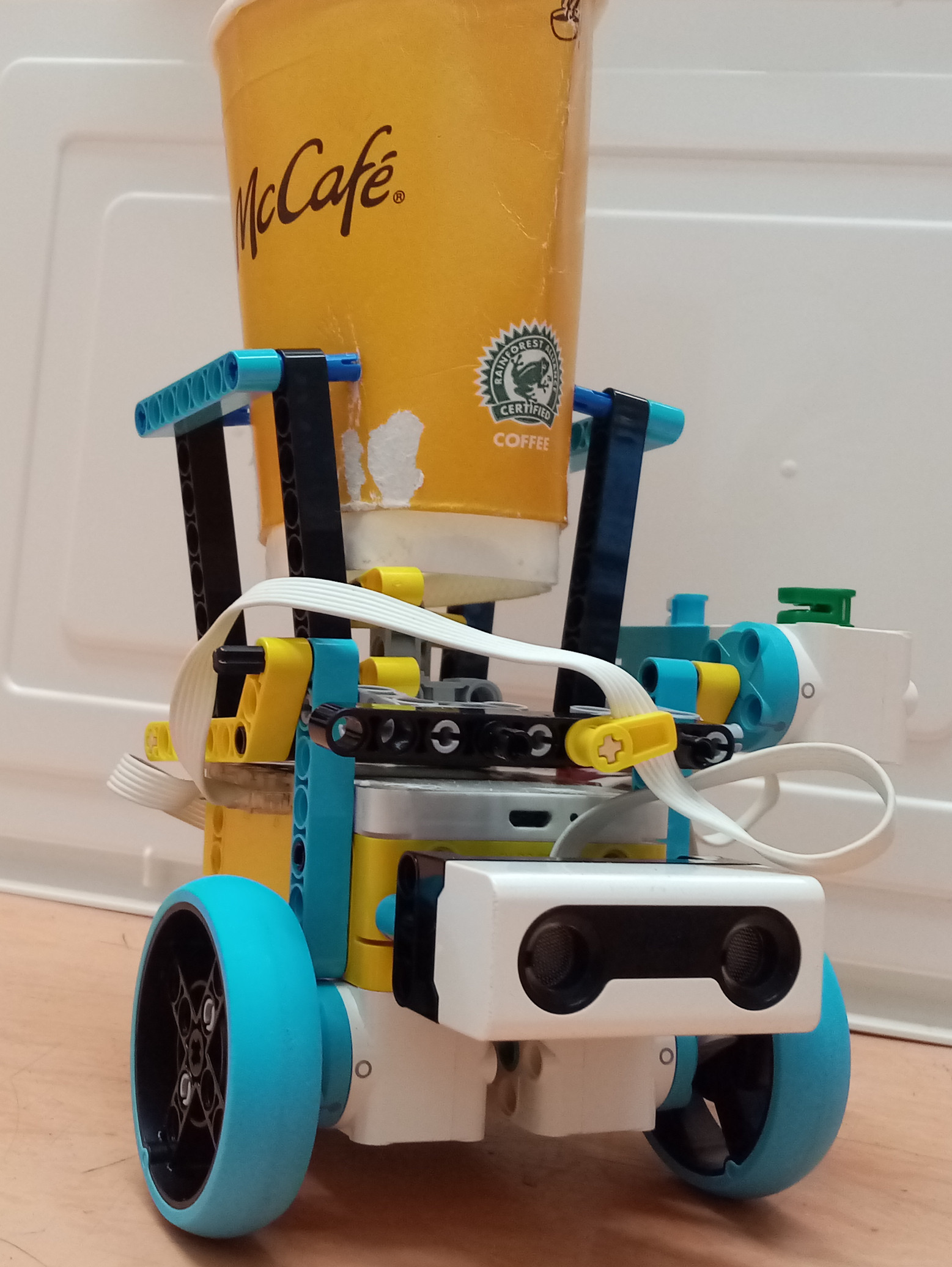 1. poharika ktorý vylieva vodu2. ultra zvukového senzoru ktorý hľadá sviečku3. spike hub s troma motormi 1. a 2. motor otáča kolesá a 3. dáva do pohybu pohár.