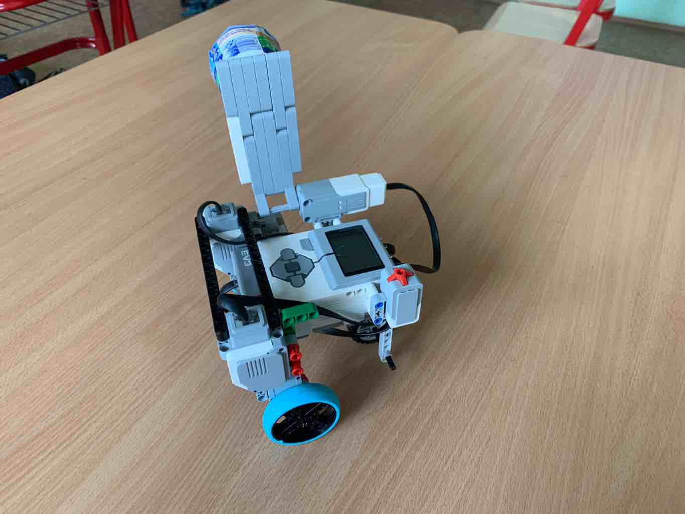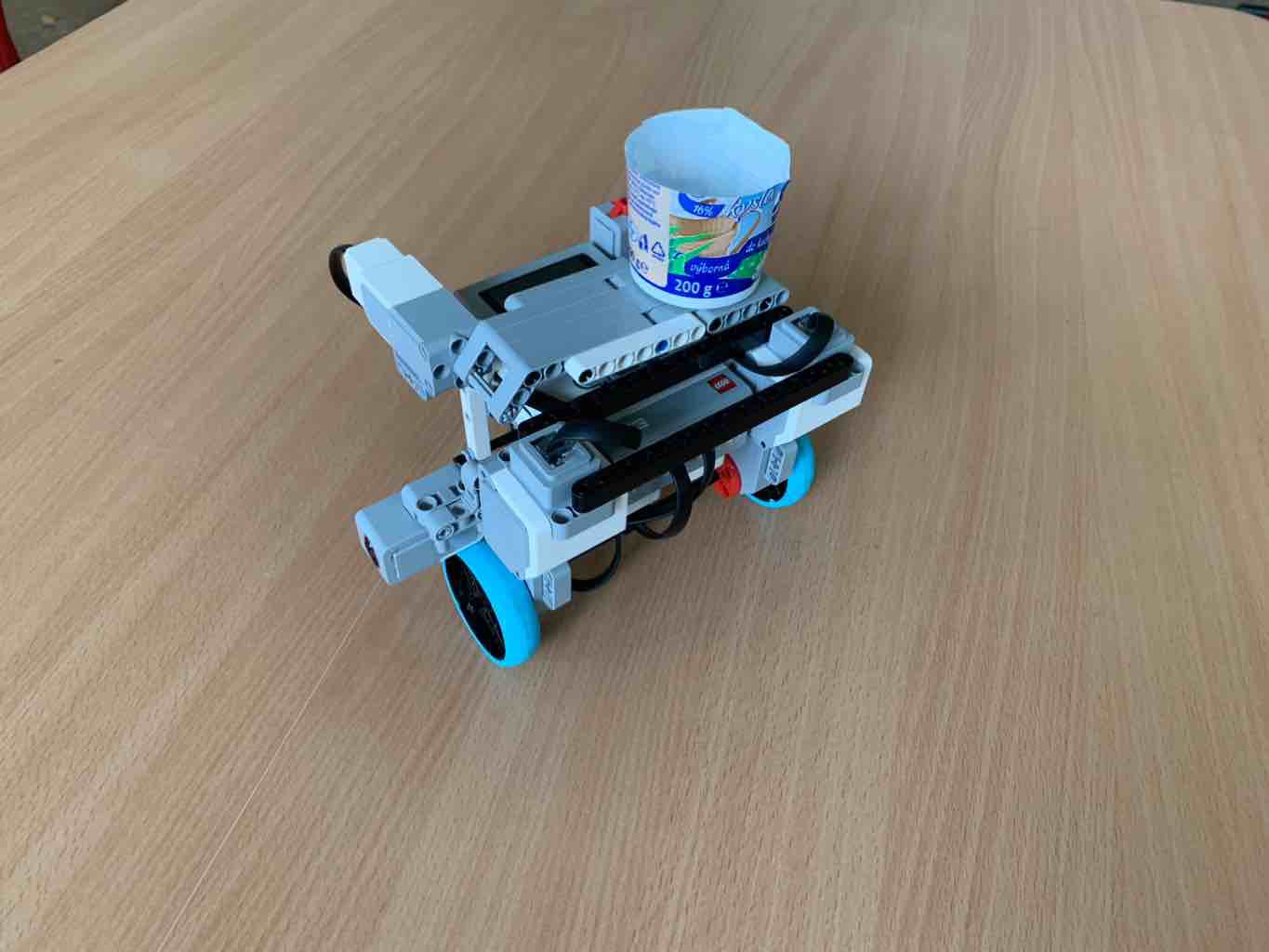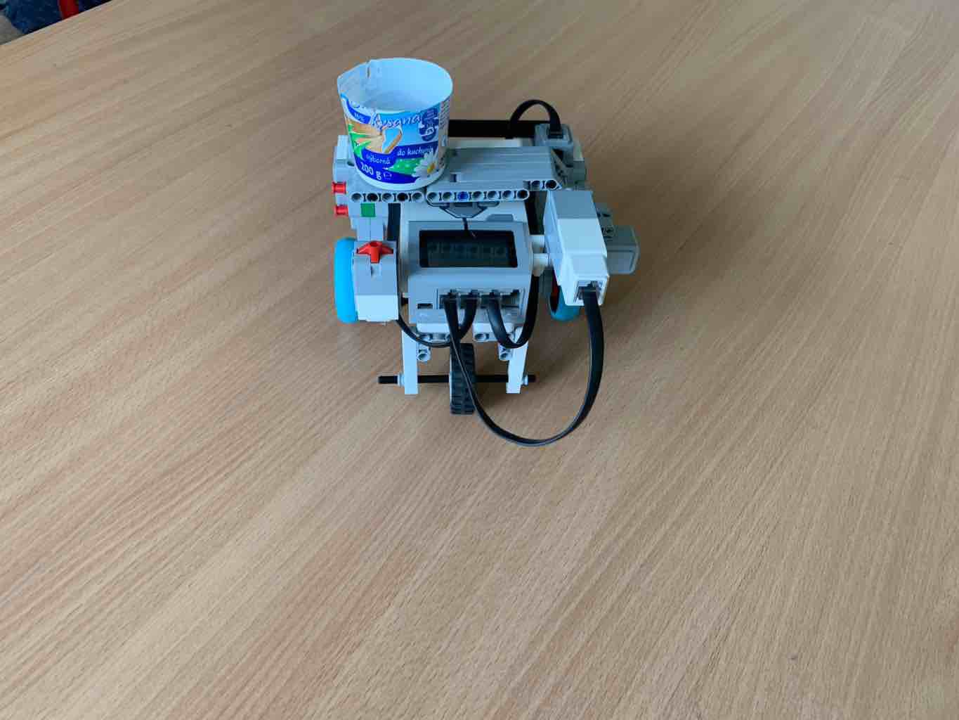 Robot sa skladá z: - Dvoch motorov, ktoré pohybujú kolesami – Jedného motora, ktorý pohybuje s vyklápačkou s vodou - Jedného svetelného senzora - Jedného tlačidla