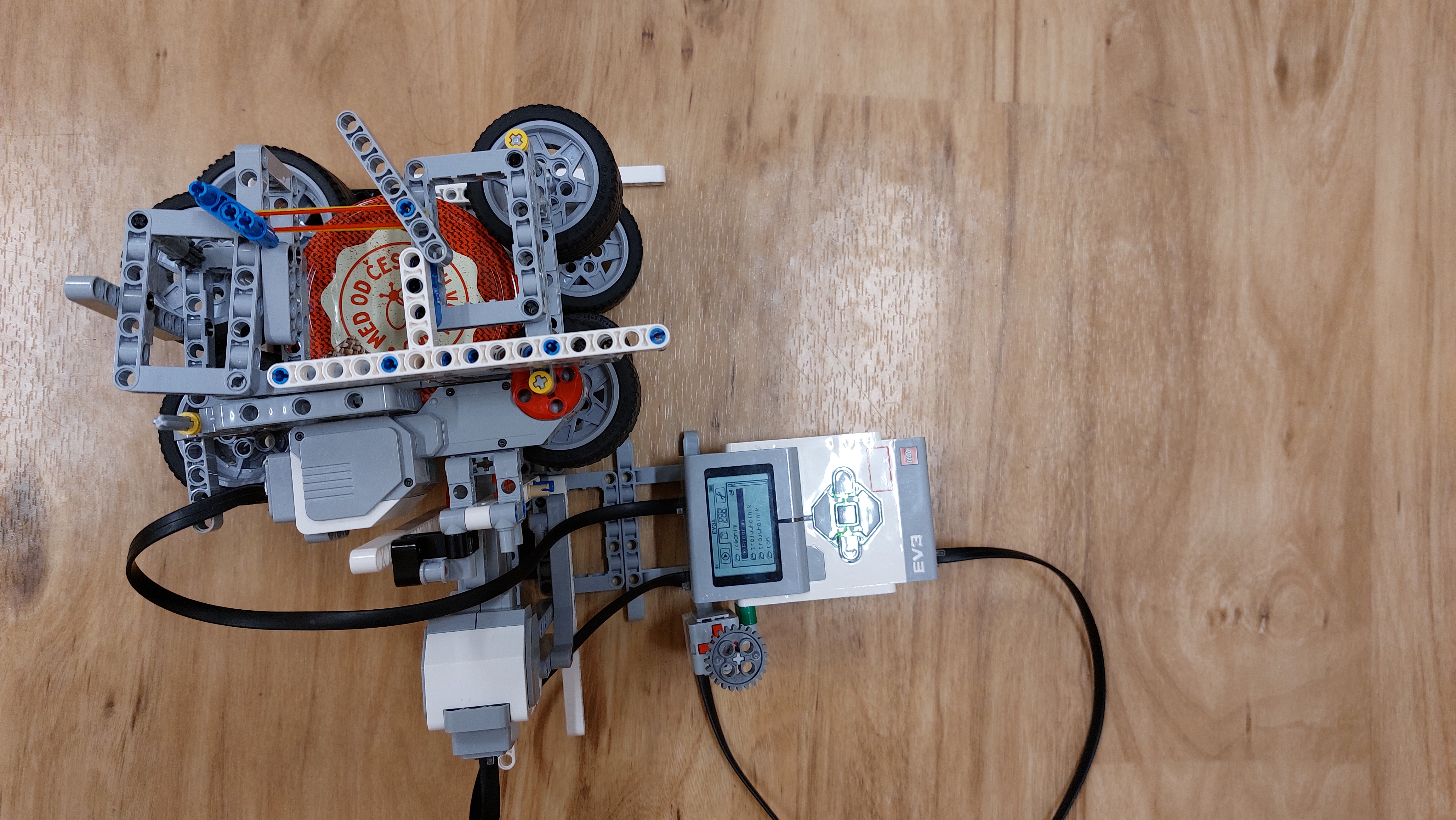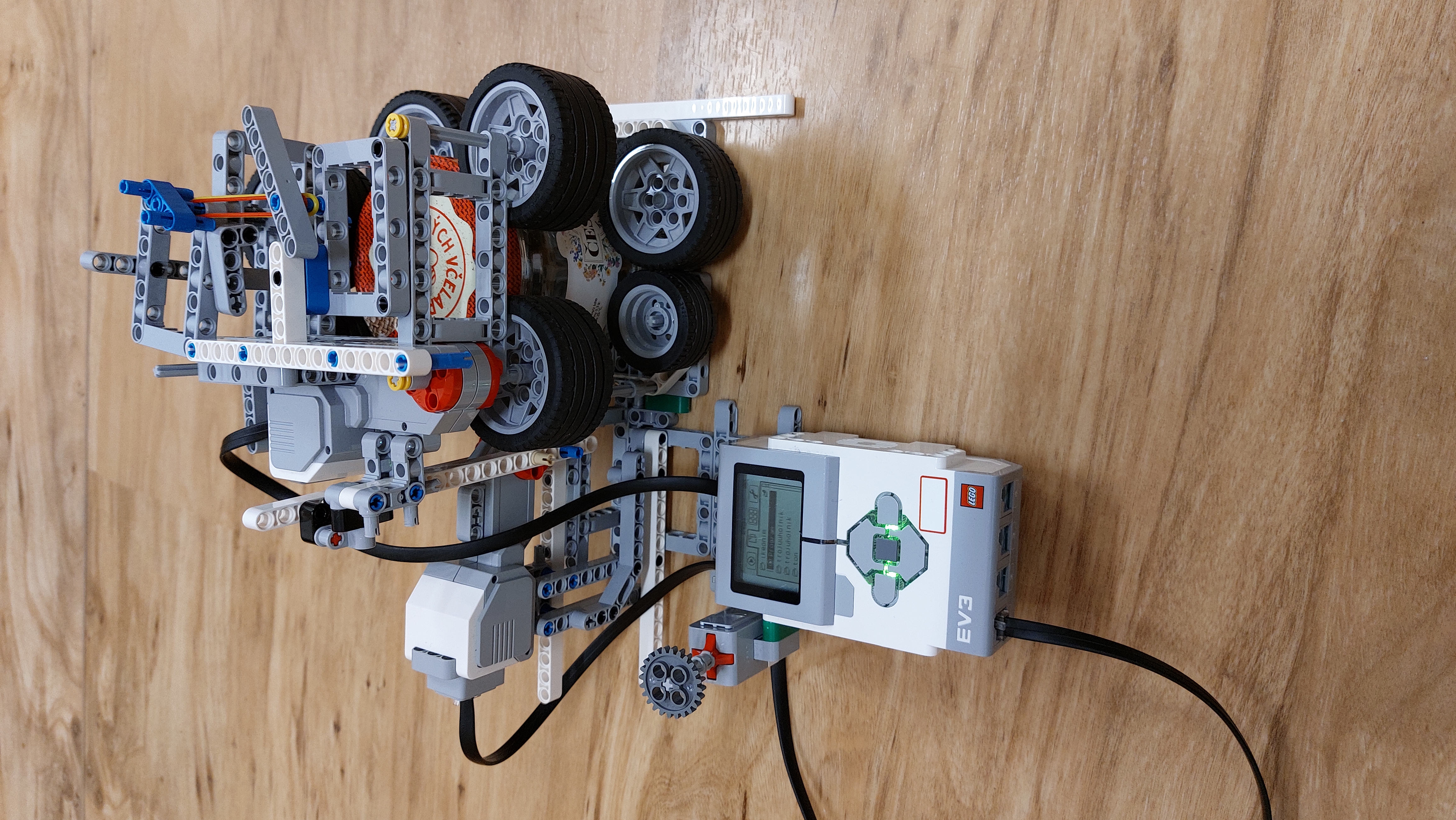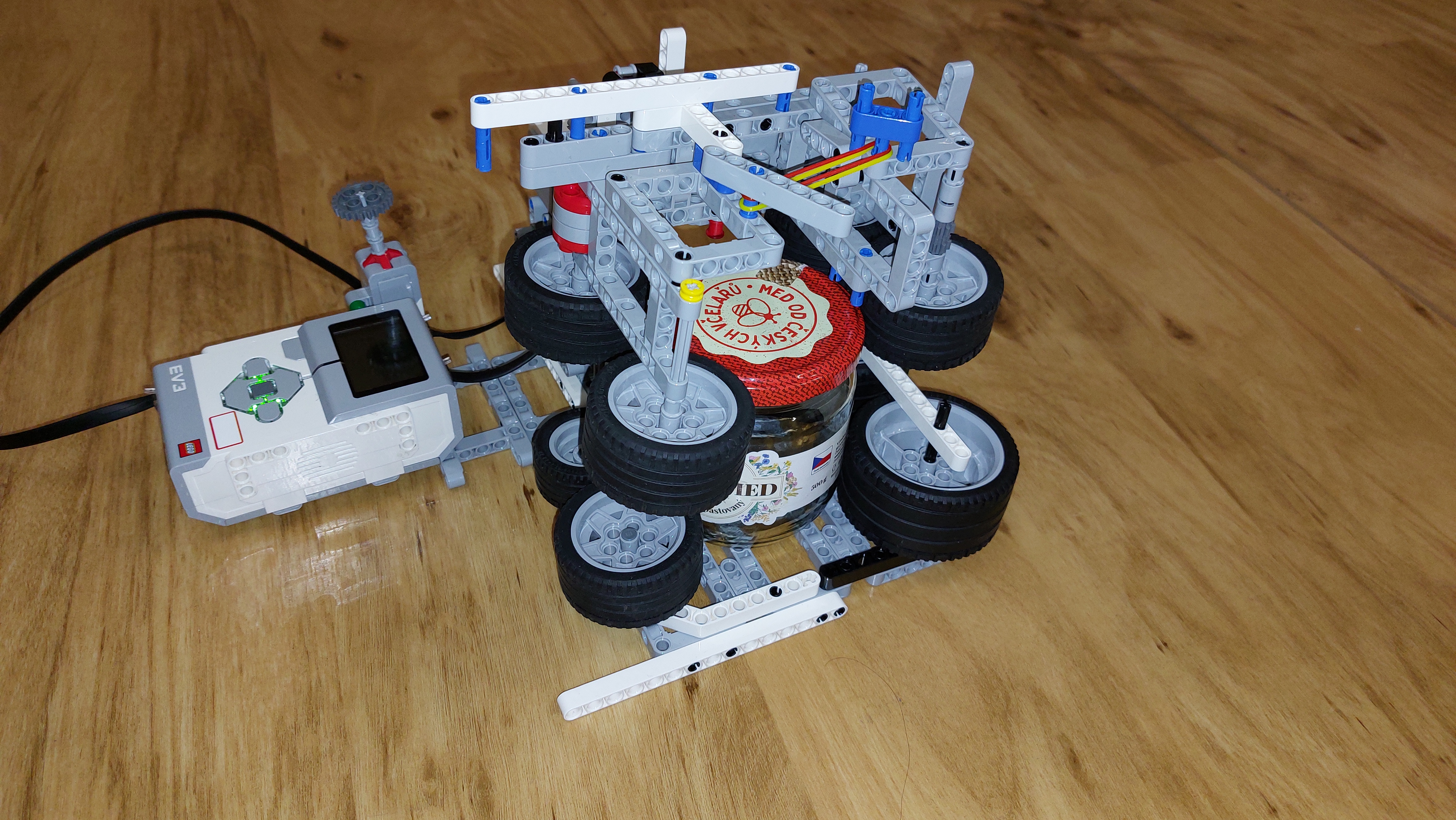 Otvárač kompótov otvára viečko na fľaši. Po stlačení tlačidla sa spustí program, ktorý následne otvorí fľašu. Komplikácia bola s uchytením fľaše, ktoré sme vyriešili gumenými kolesami, ktoré sú ku sebe priťahované gumičkami