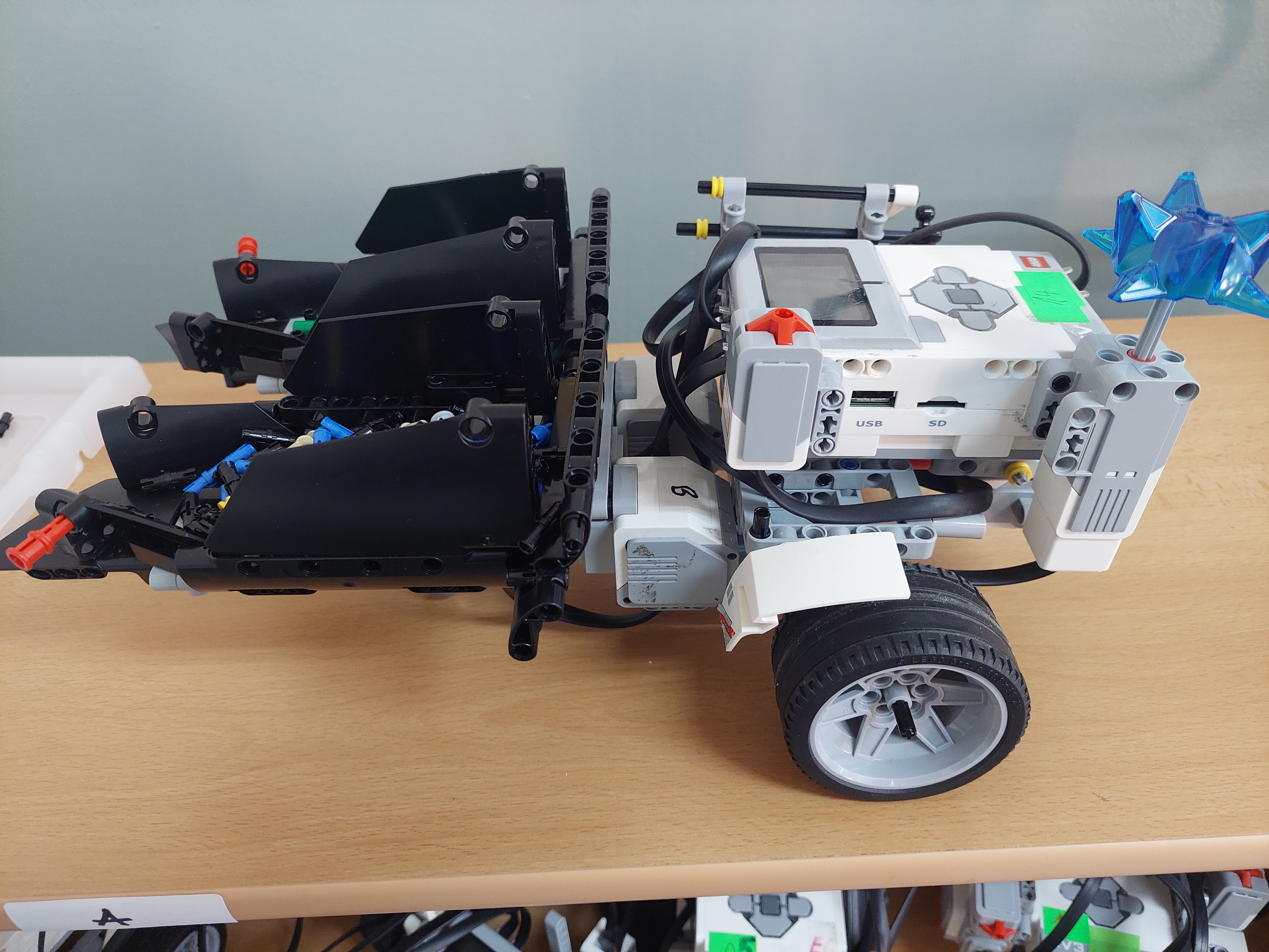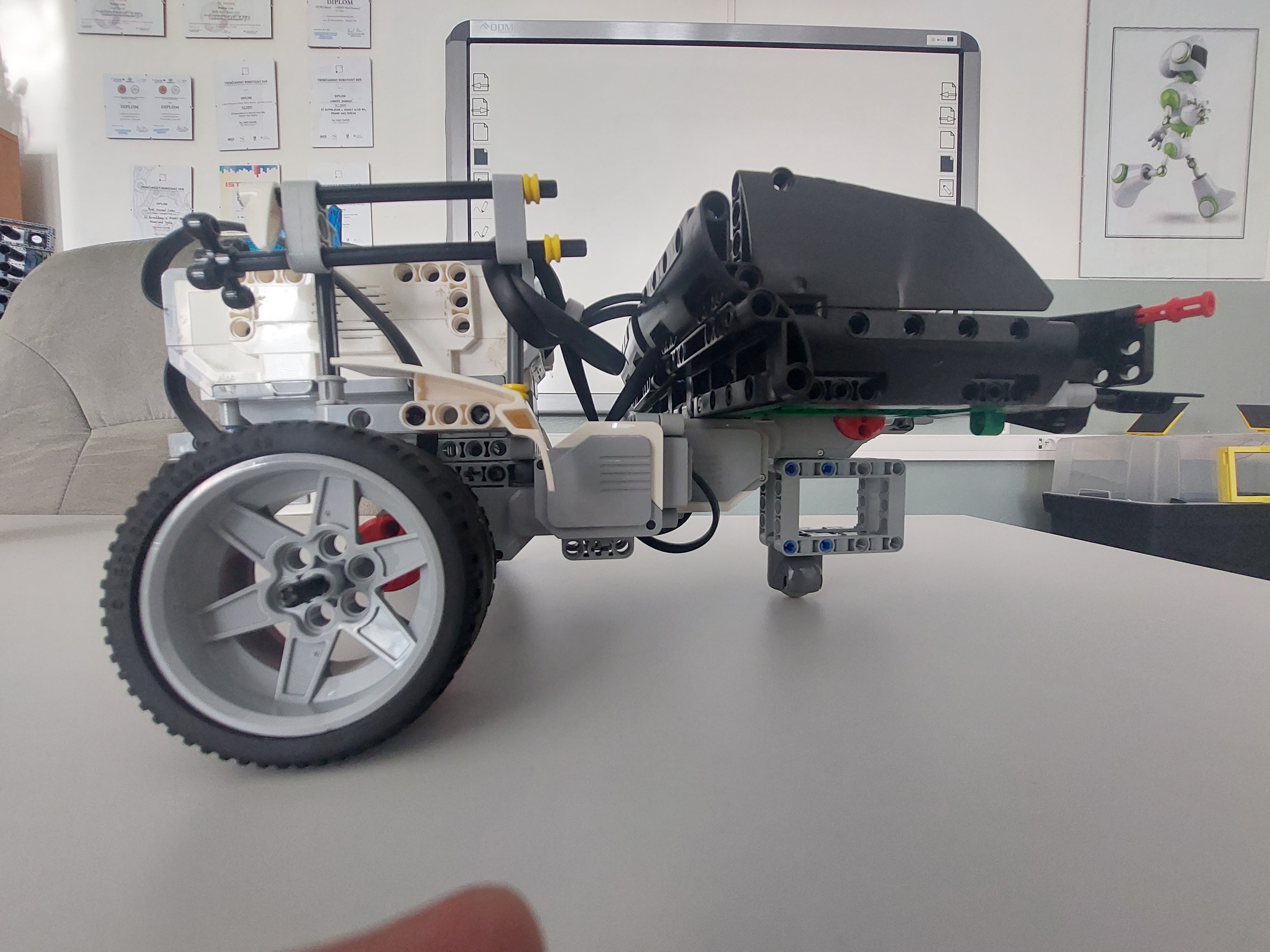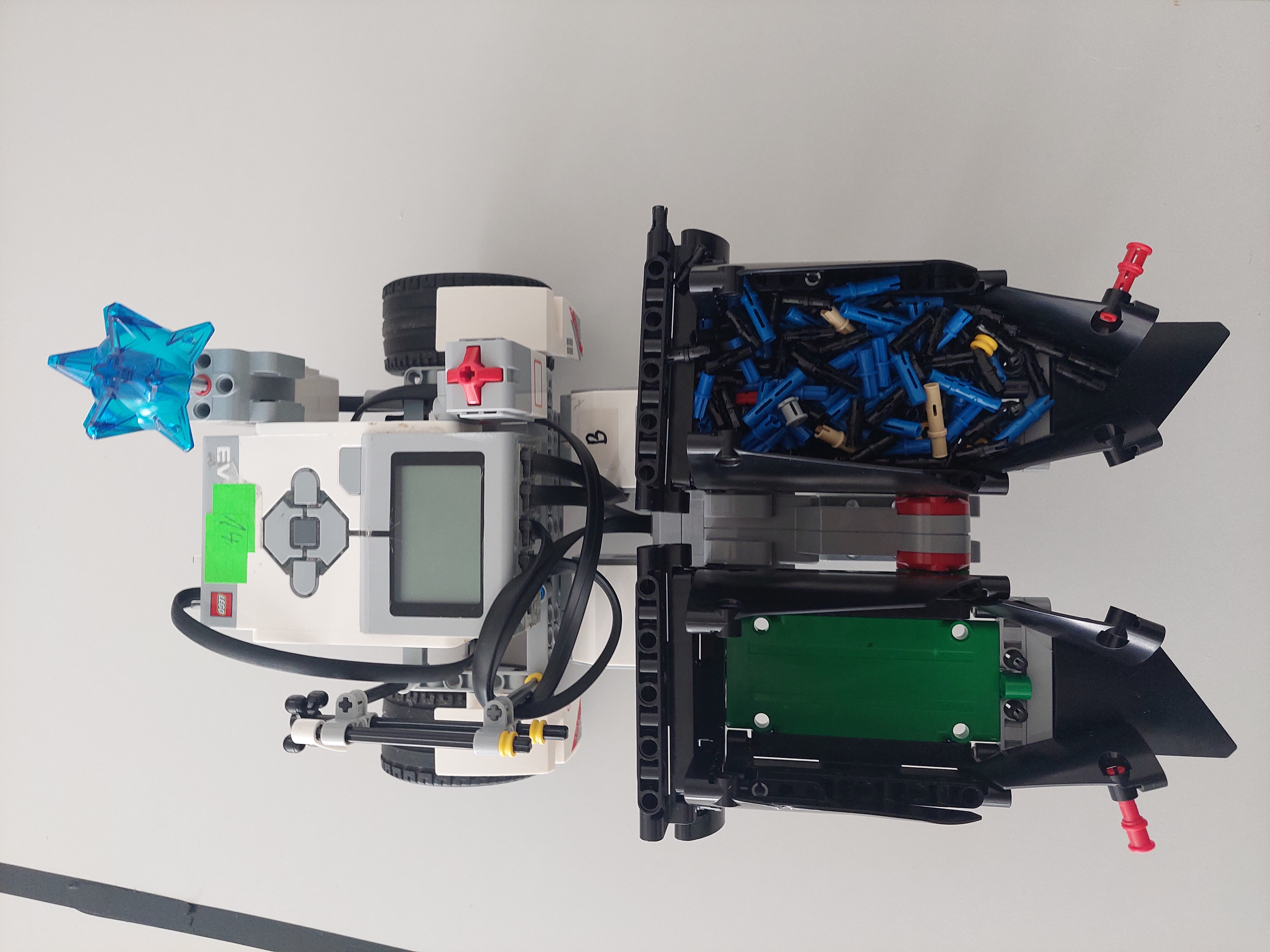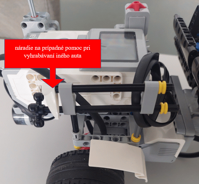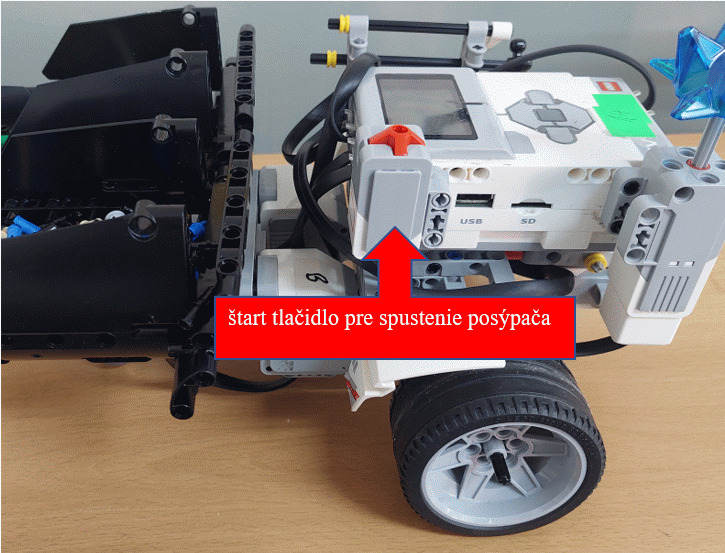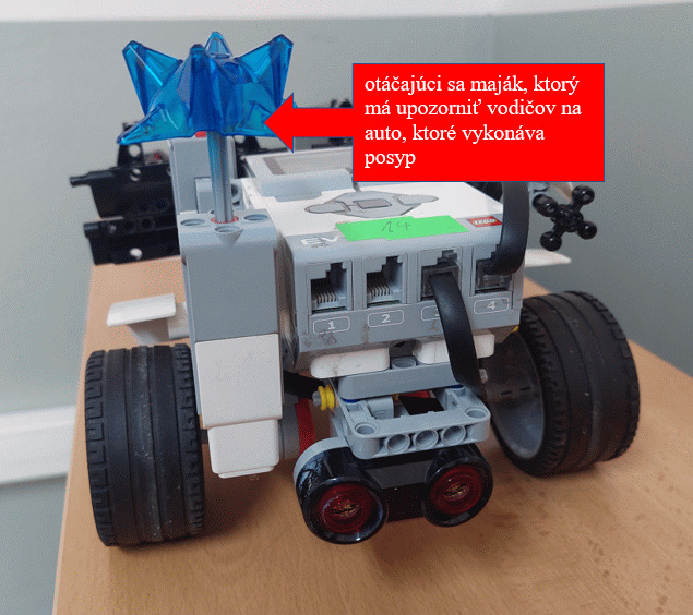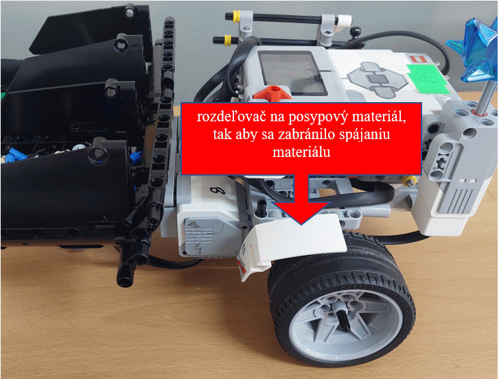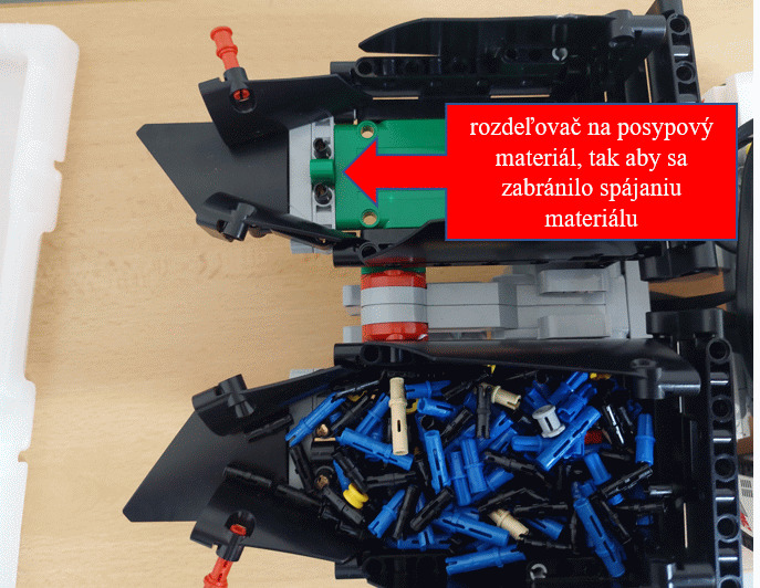Pre náš posýpač sme zvolili širšiu konštrukciu, tak aby nedošlo k jeho šmyku. V zadnej časti sme dali vyklápaciu nádrž na posypový materiál. Tá je ovládaná pomocou jedného veľkého motora. V našom prípade sme ju naplnili spojovacie súčiastky Lego.