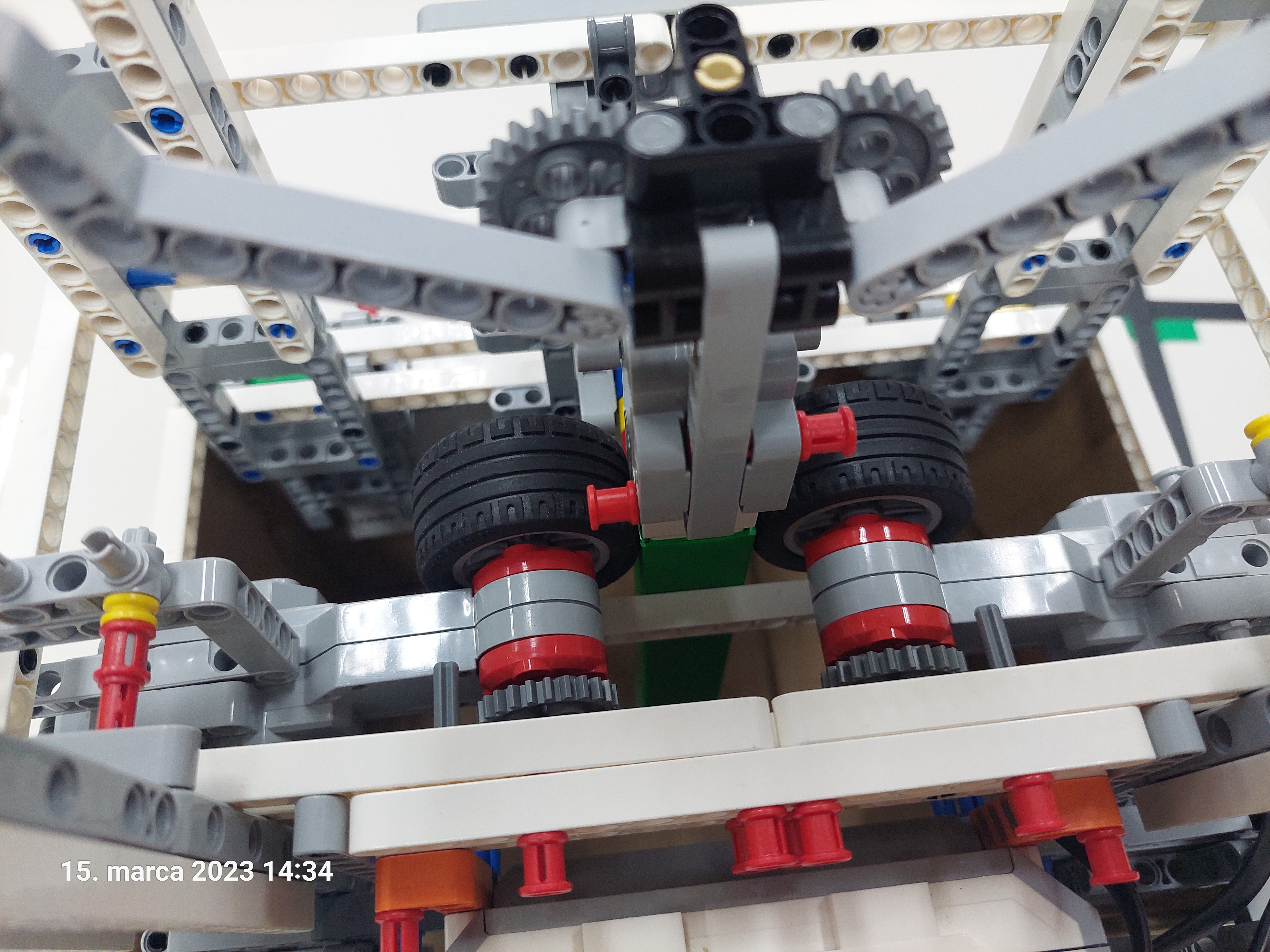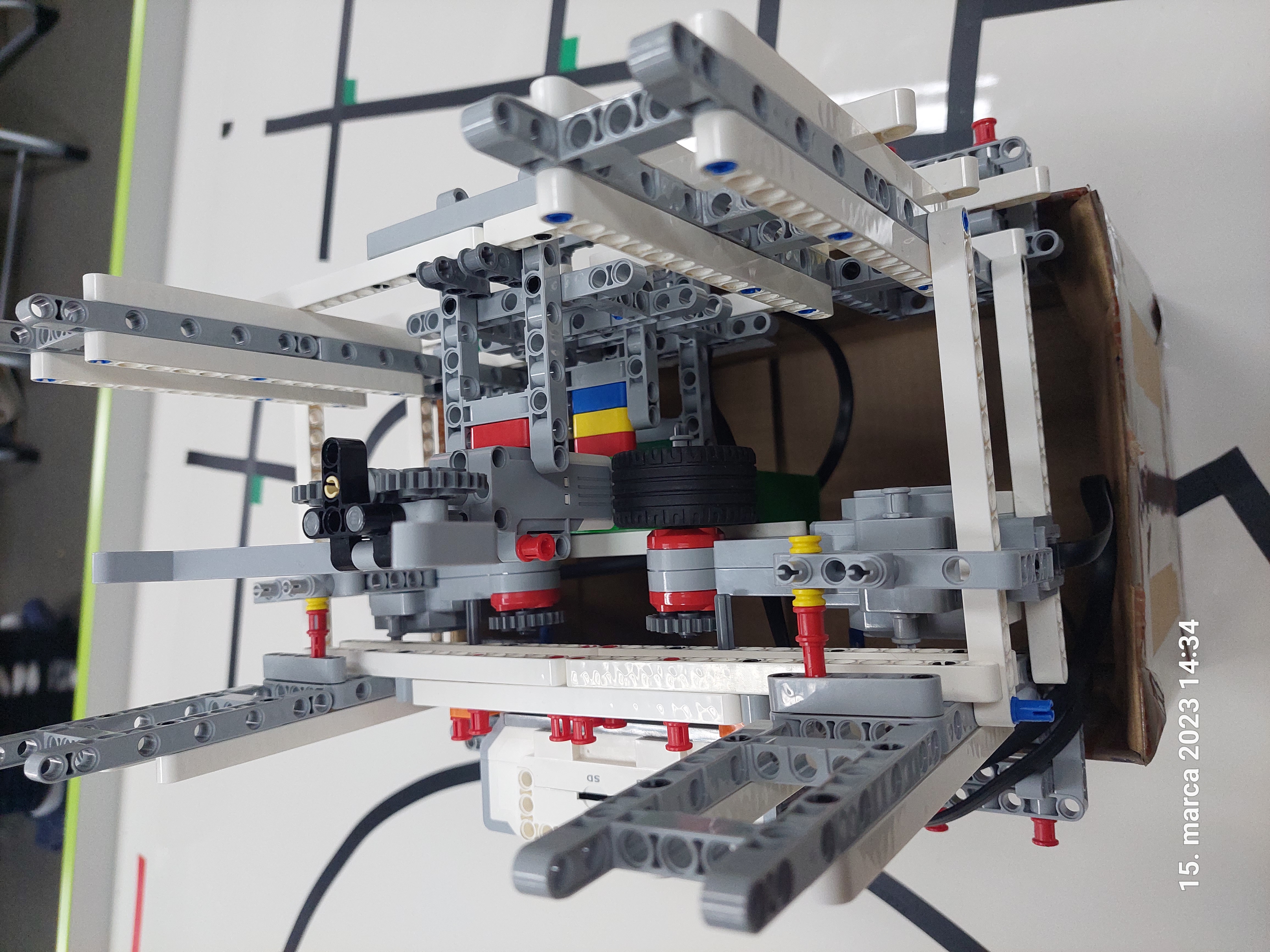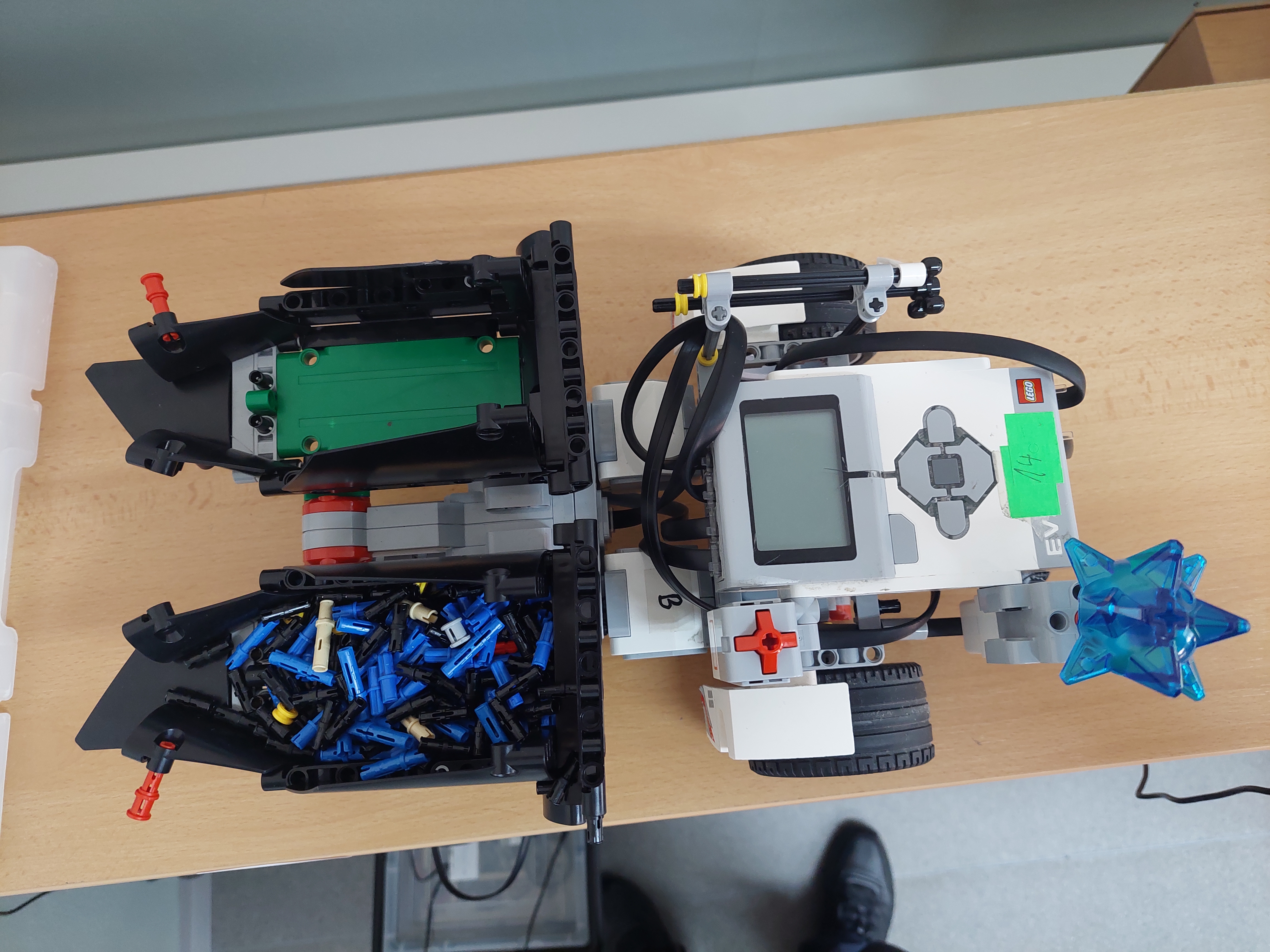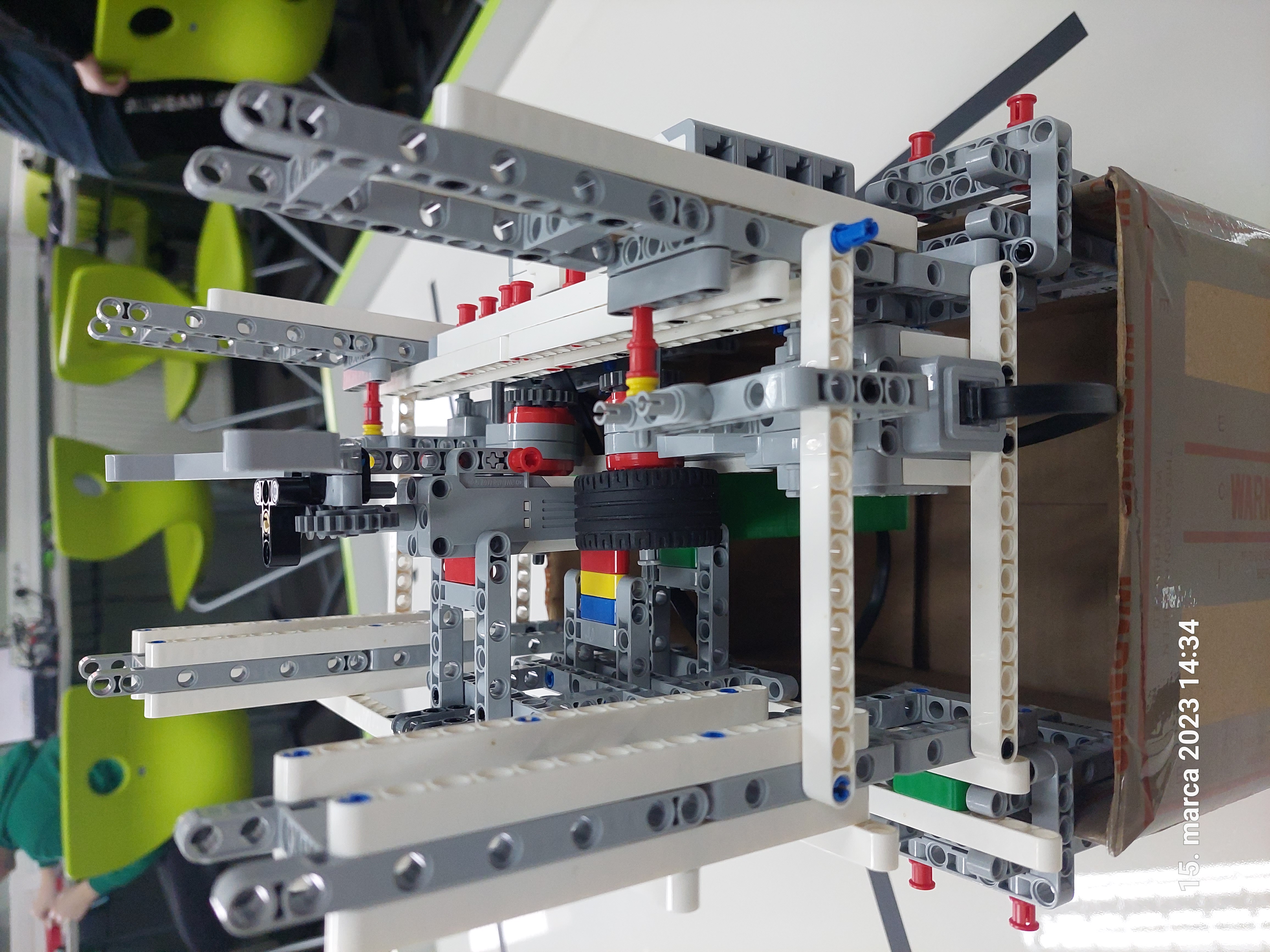 Pre náš posýpač sme zvolili širšiu konštrukciu, tak aby nedošlo k jeho šmyku. V zadnej časti sme dali vyklápaciu nádrž na posypový materiál. Tá je ovládaná pomocou jedného veľkého motora. V našom prípade sme ju naplnili spojovacie súčiastky Lego.