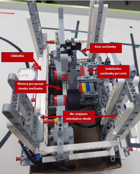 Najprv sme si pripravili základňu, ktorú sme umiestnili na krabicu. Krabica je Zem, kvetináč ale niečo, kde sú nasadené snežienky. Potom sme na 3D tlačiarni navrhli stonku snežienky. Po vyrastení zo zeme snežienka rozkvitne. Rozkvitnutie robíme pomocou dvoch ramien a malého motora. Použili sme aj stabilizátor, aby nám snežienka vo výške nespadla, teda neodkvitla.