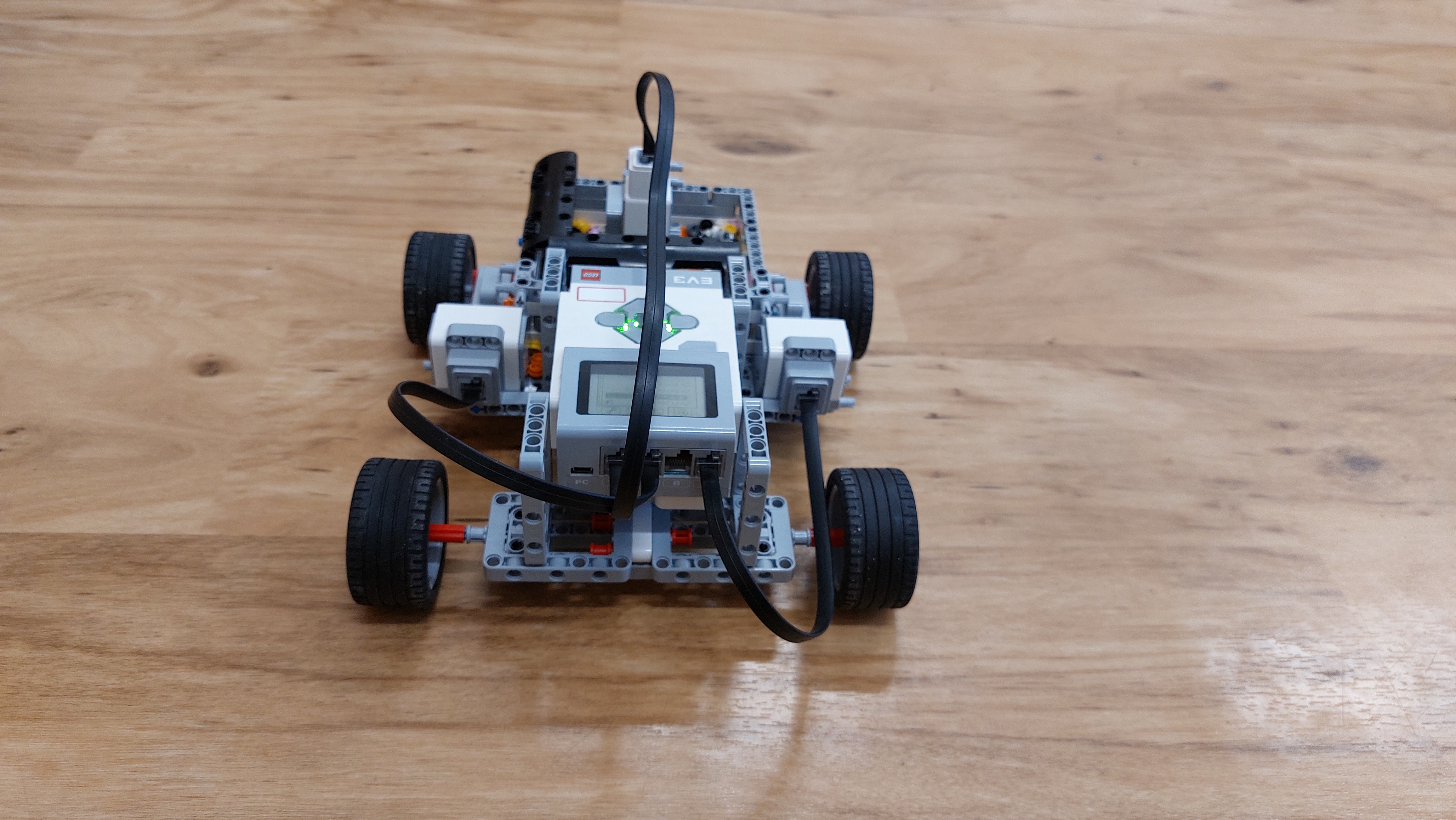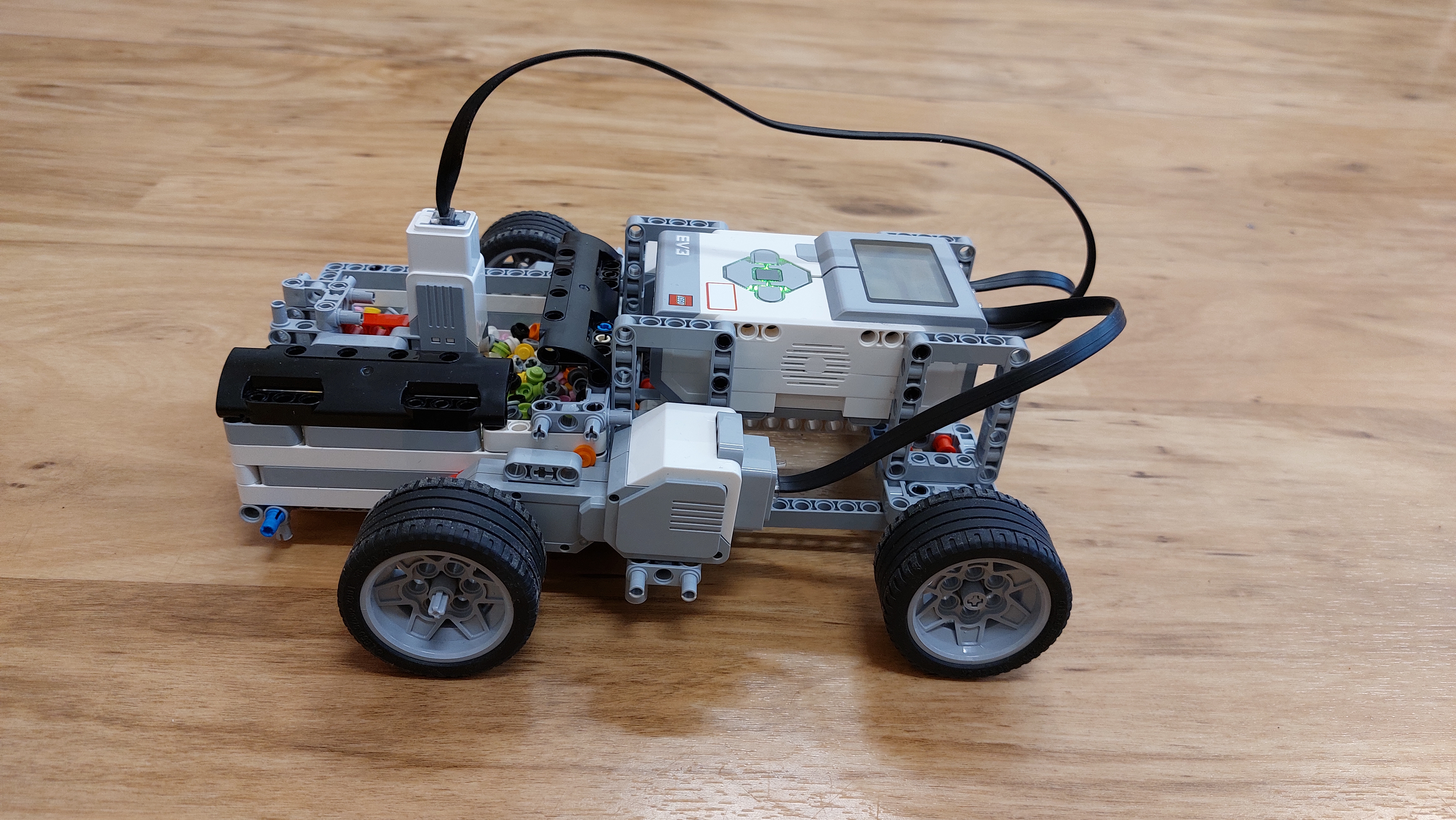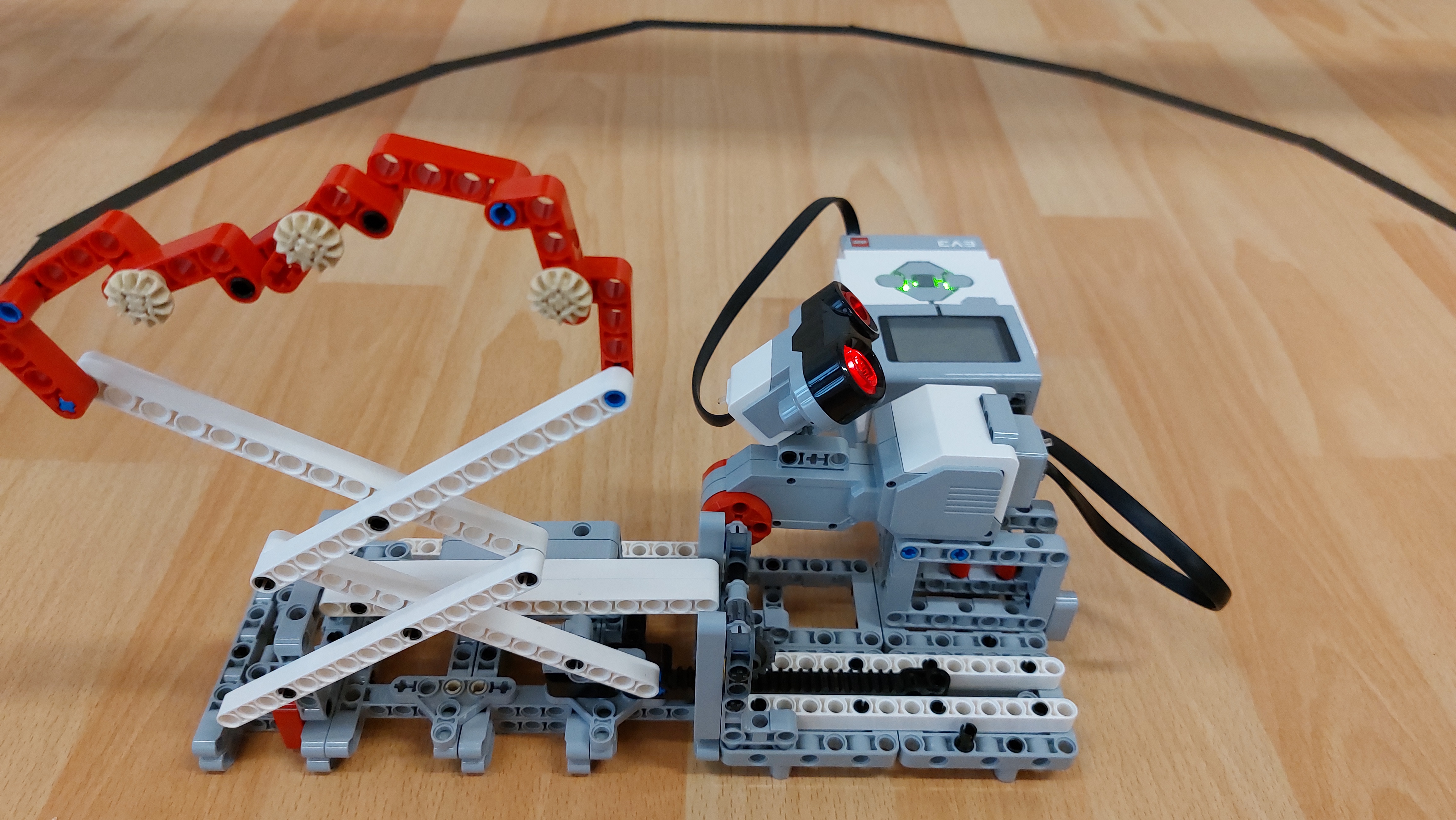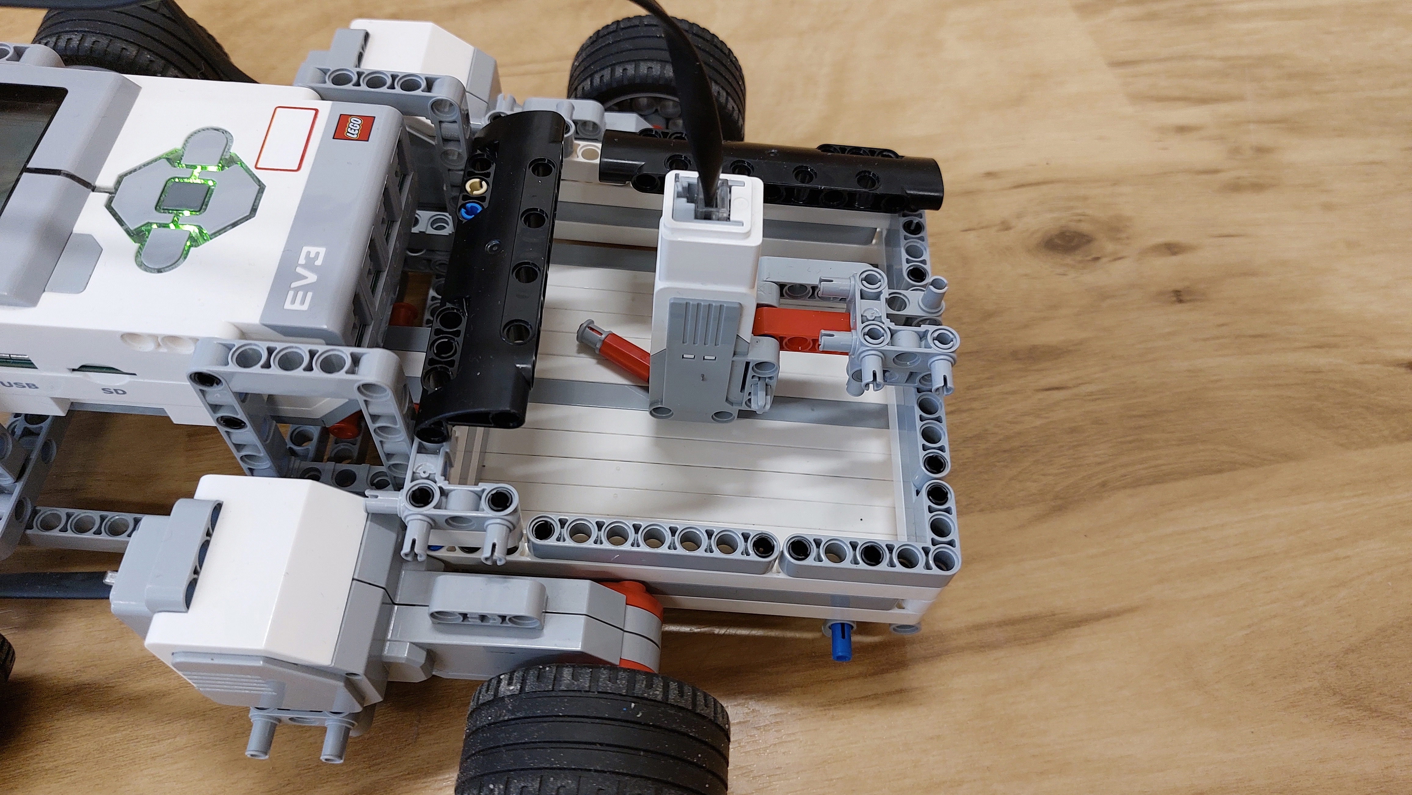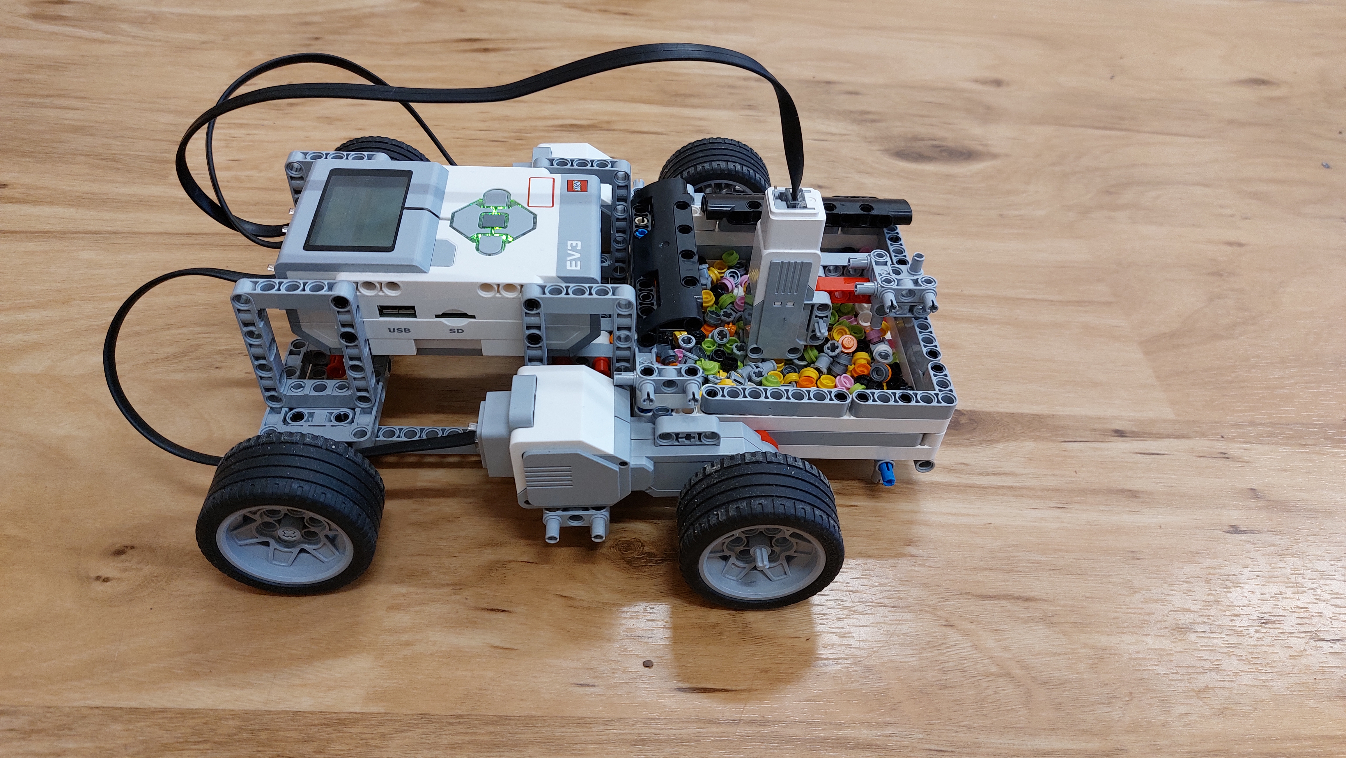 Náš robot simuluje posýpacie auto. Konštrukcia je jednoduchá. Skúšali sme viac verzií posypu tak, že sme zväčšovali, zmenšovali otvor na posyp, upravovali počet vrtuliek motora posypu z troch na jednu a menili rýchlosť otáčok motora určeného na posyp.