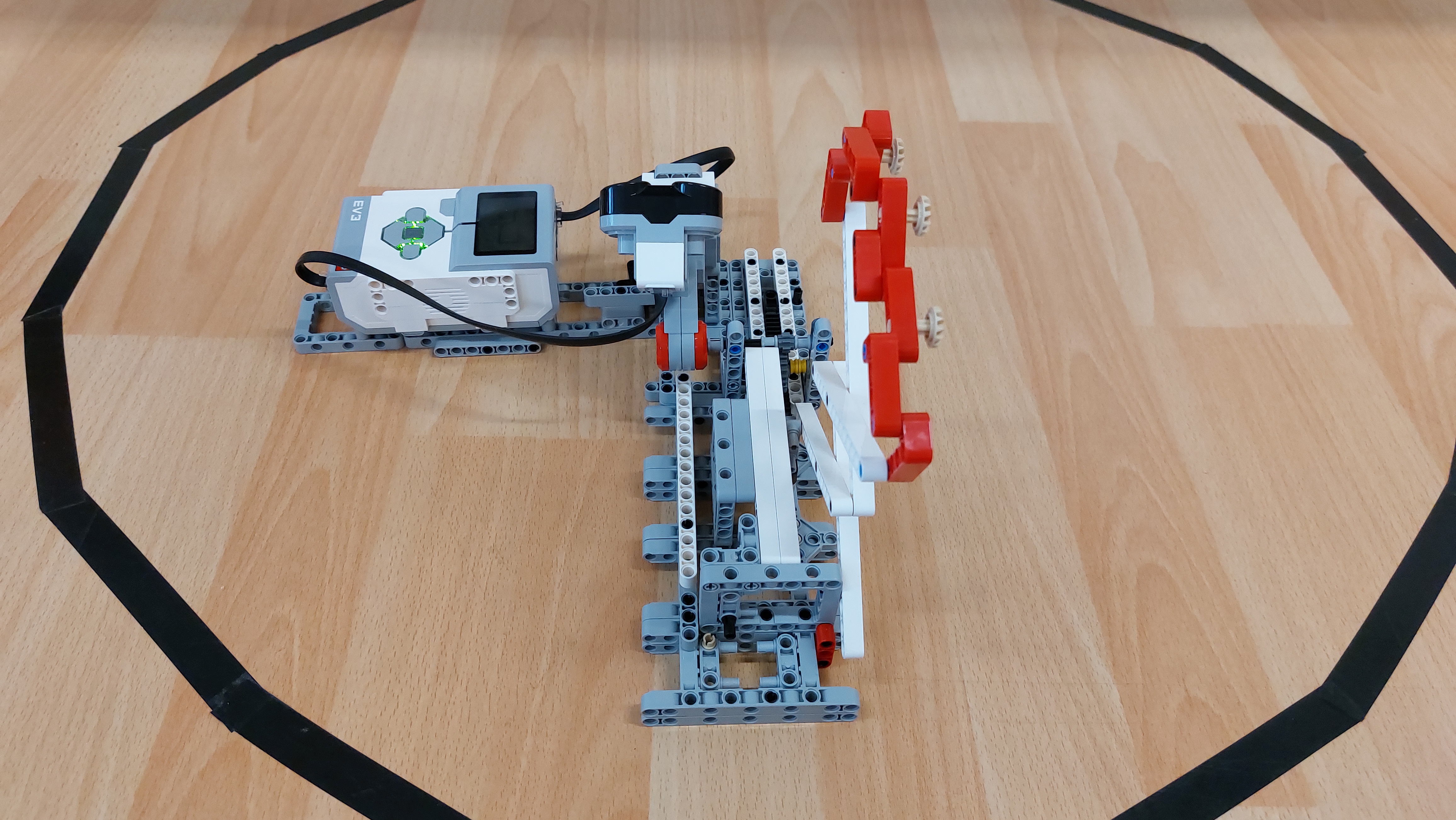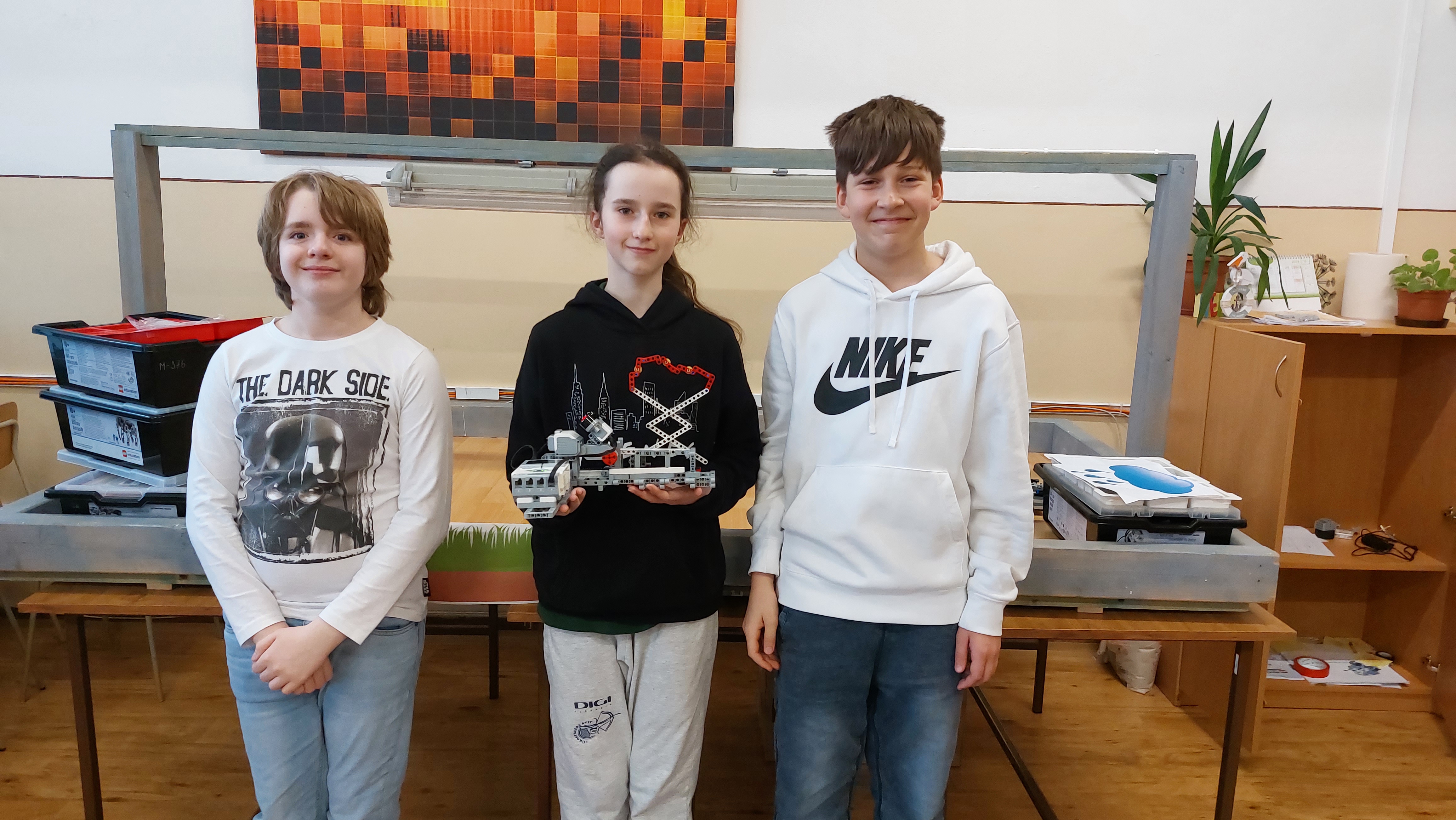 1. Pekná a jednoduchá konštrukcia, páči sa mi veľký zásobník ako aj možnosť meniť hustotu posypu, to sa naozaj môže hodiť. 2. Áno, áno, v roku 2011, zhruba keď ste sa narodili, boli presne tieto malé cuplíčky použité vo FLL a znázorňovali rôzne baktérie a vírusy, určite si pamätáte. :))) Posýpacie auto je veľmi efektívne, vynikajúce riešenie! Škoda, že na konci nezatočilo a mohlo ešte posypať oveľa väčšiu plochu, ale o to nejde, podstatné je, že ste posypanú plochu odmerali. Dajte si ale pozor na to, aby sa káblik neodieral o osku alebo koliesko. Jednak to znižuje jeho životnosť, jednak trenie navyše môže spôsobiť nerovnomernú jazdu a tiež to nesvedčí o láske k poriadku, ktorú by predsa každý robotik mal mať. :-) 3. pekne ste všetko vysvetlili ... škoda, že ste robota neotočili, že by posypal plochu štvorca a nie len pásik. Model je funkčný, video je tiež výstižné. Akurát ta plocha nie je úplne rozsiahla, ale myslím, že spĺňa zadanie. Mohli ste prípadne aj odfotiť, ako ste merali plochu. Do budúcna, je nám lepšie takéto kroky zdokumentovať, keďže tam nevieme byť s vami :) 4. Za riešenie úlohy Výkyvy počasia získavate 3b. Pekné riešenie :)
