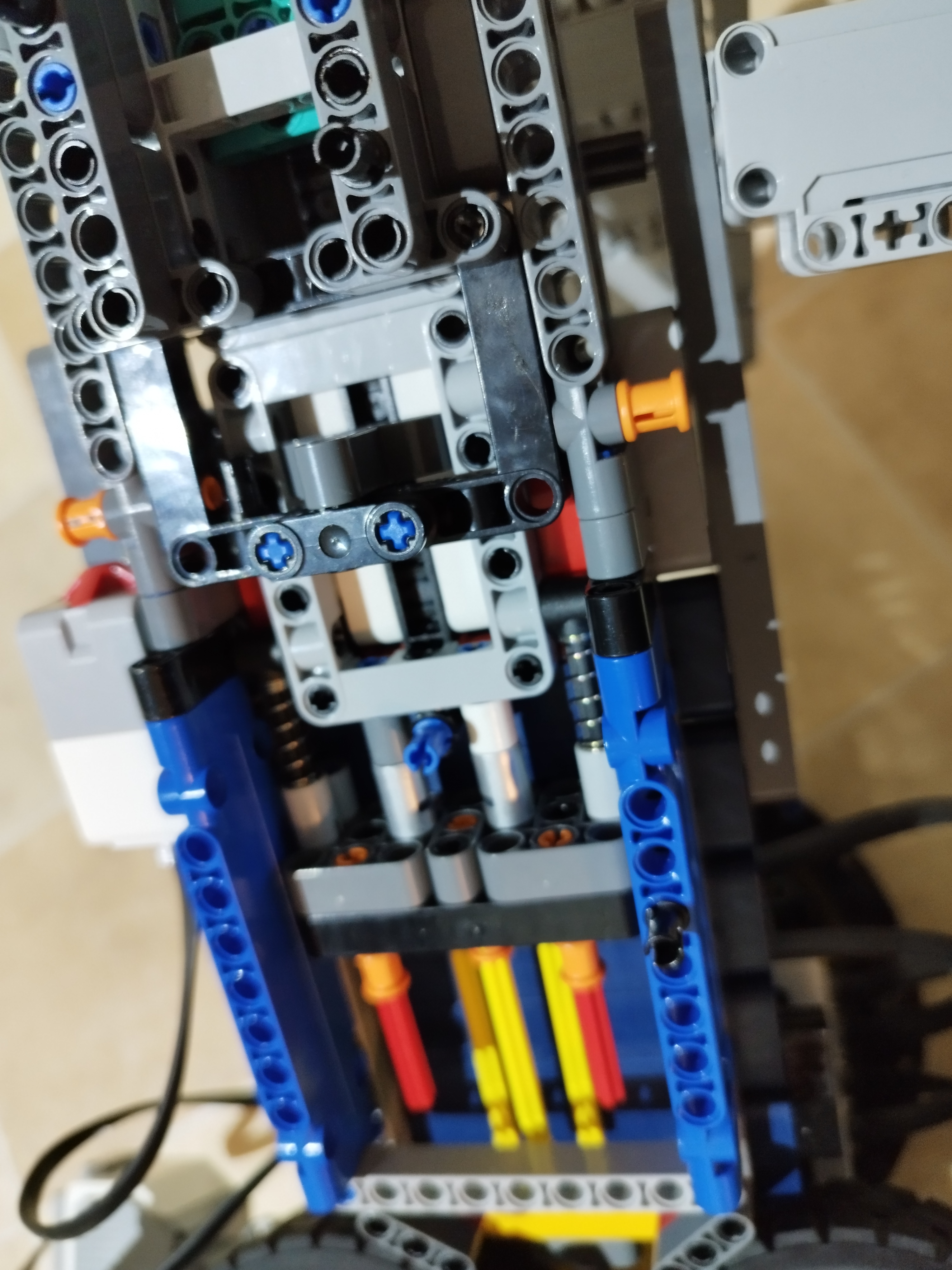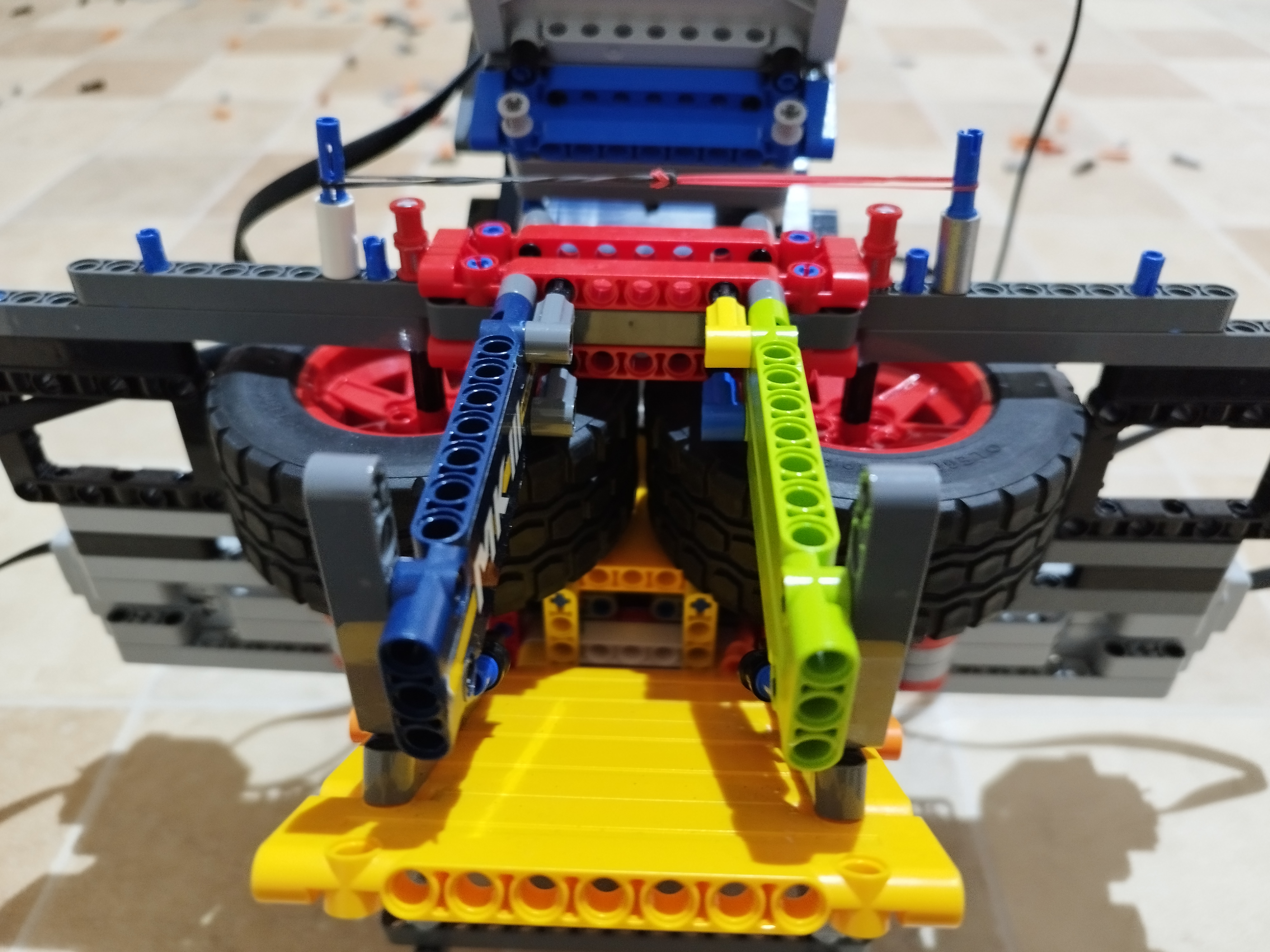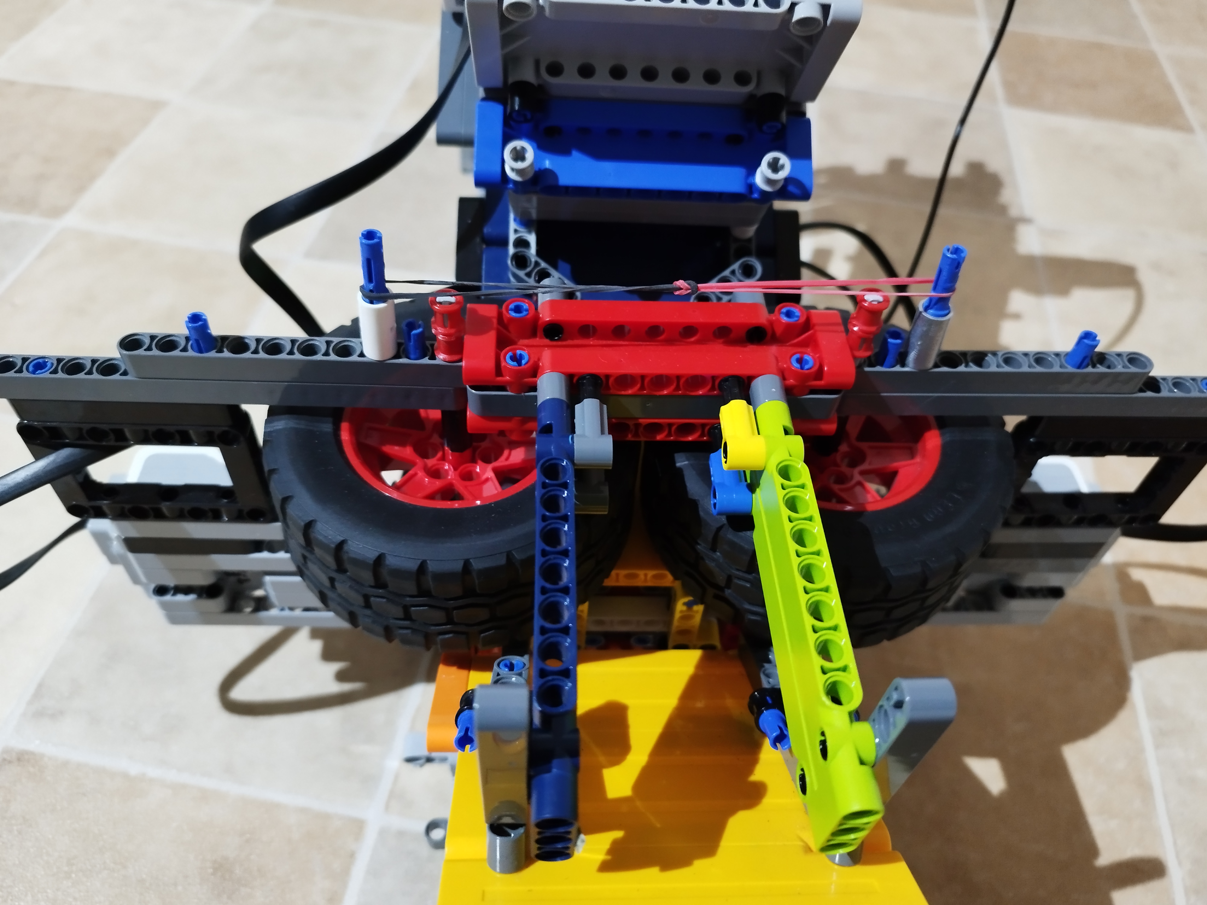 Hlavnú časť robota sme postavili ako prvú. Urobili sme dva zrkadlové prevody 8 : 40, každý poháňaný large motorom. Tieto časti sú vzájomne voľne, ale len v pohybe k sebe a od seba. K sebe sú priťahované gumičkami, aby sa dosiahlo výkonnejšieho vystreľovania. Tento vystreľovač je k zvyšku robota pripojený strednou časťou, ktorá spája dve „voľne“ kolesá a prevody a motory. To znamená, že kolesá s motormi nie sú napevno pripojené k žiadnej časti robota, ale úchyt medzi nimi obmedzuje ich pohyb len na pohyby k sebe a od seba. K strednej časti je pripevnená šikmá rampa, ktorá zmení smer krúp tak aby vyleteli smerom šikmo hore, dopredu.