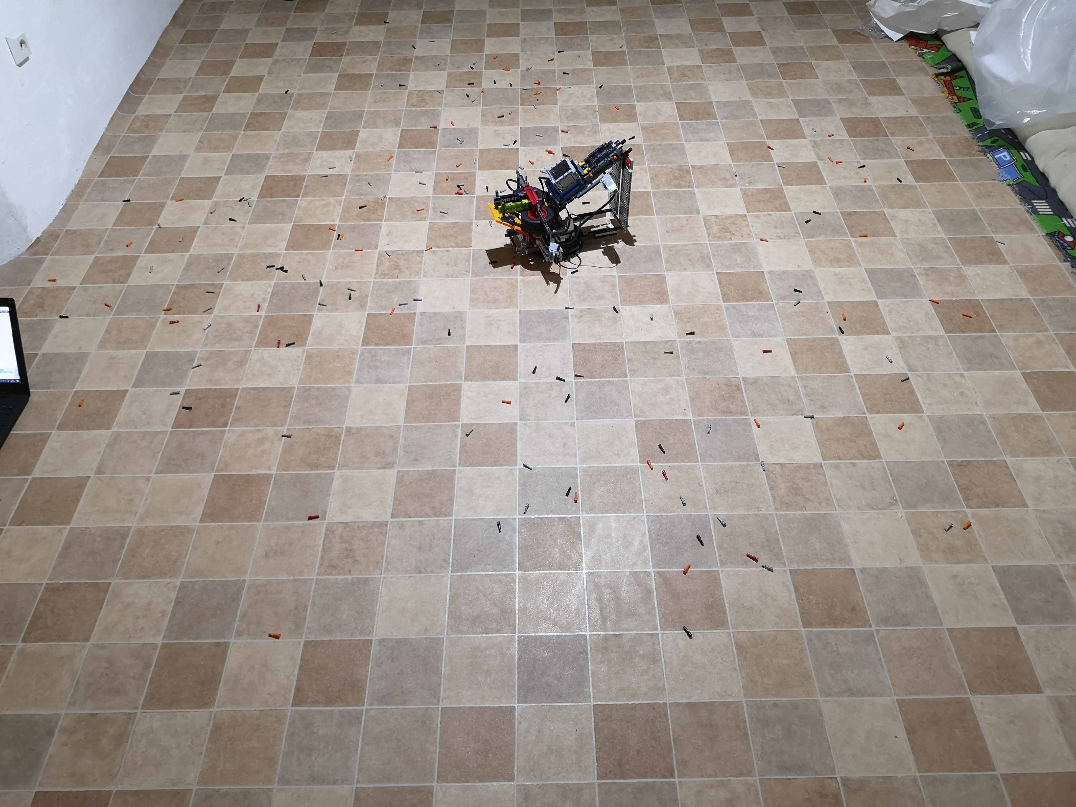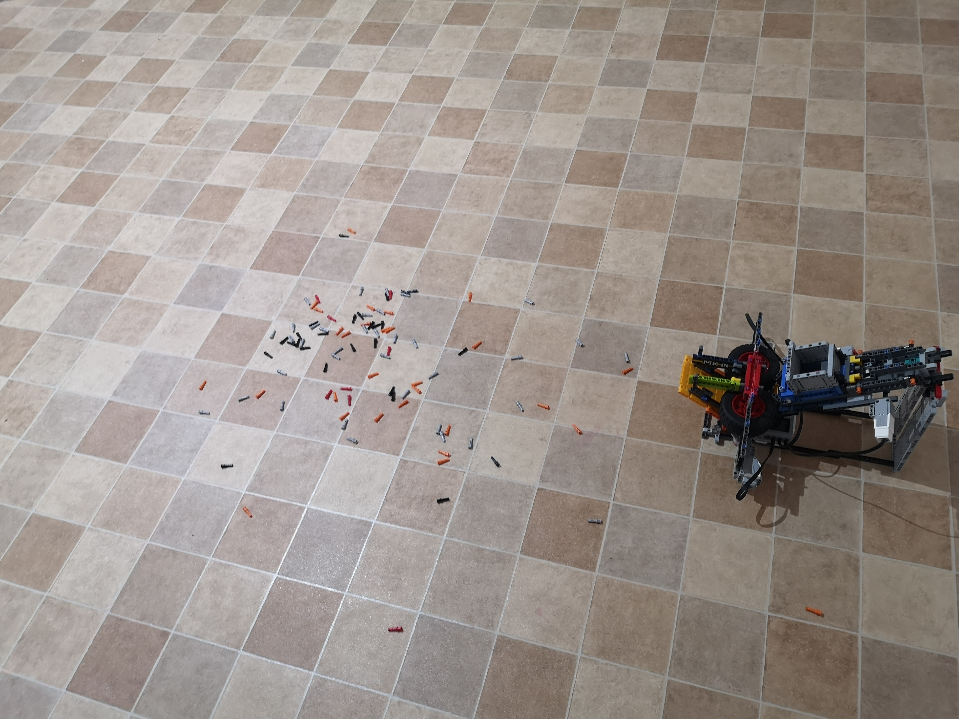 Náš finálny robot sa skladá z troch častí: z hlavnej časti, ktorá sa skladá z dvoch vzájomne sa priťahujúcich rotujúcich pneumatík a šikmej rampy, ktorá zmení smer krúp tak aby leteli hore. Druhá časť je zásobník s krúpami ku ktorému patrí aj odpružené vytláčadlo krúp zo zásobníka. Tretiu časť sme pridali pre zväčšenie plochy pokrytia krúpami. Je to točiaci disk, na ktorý sme upevnili robota.