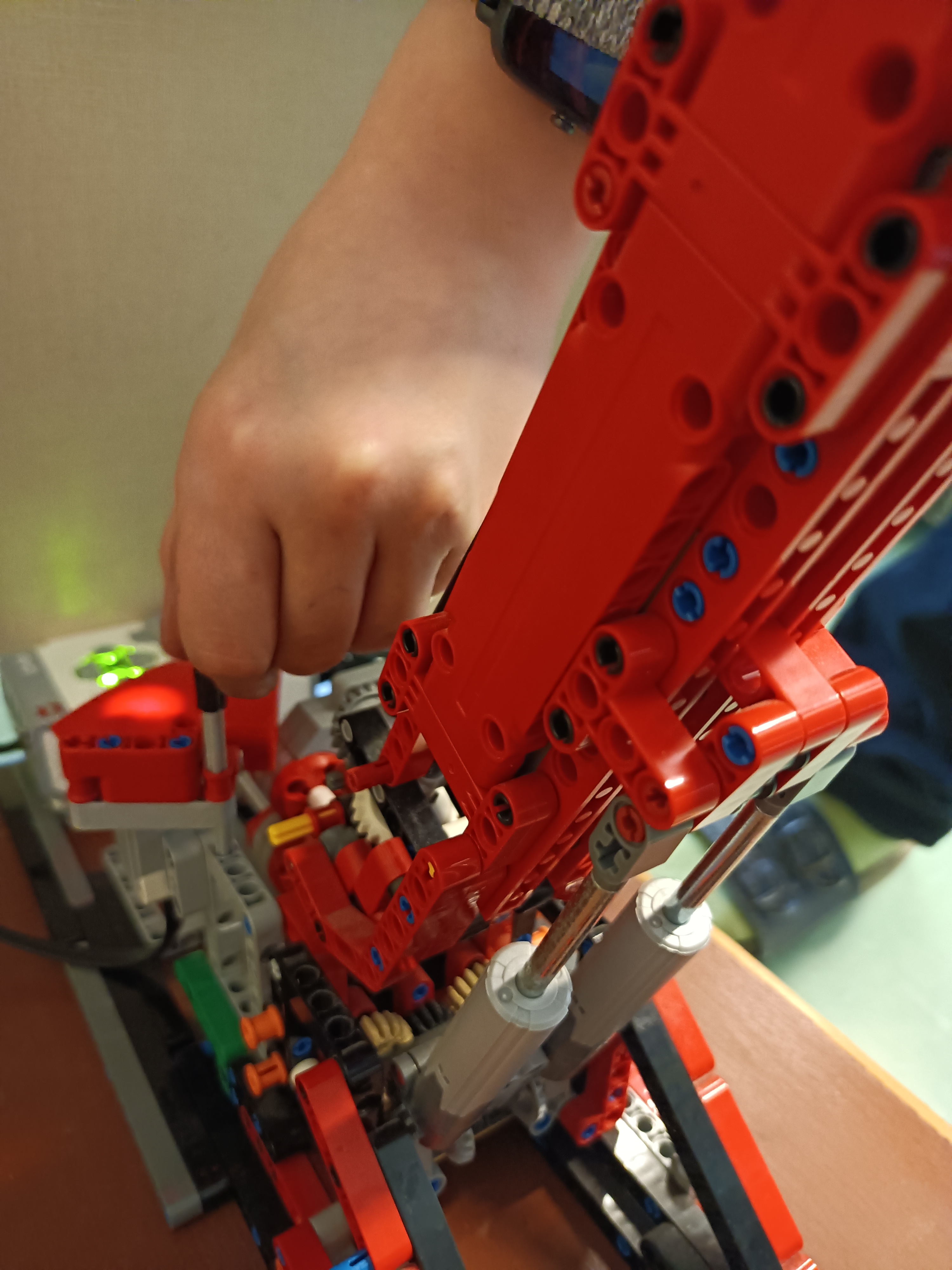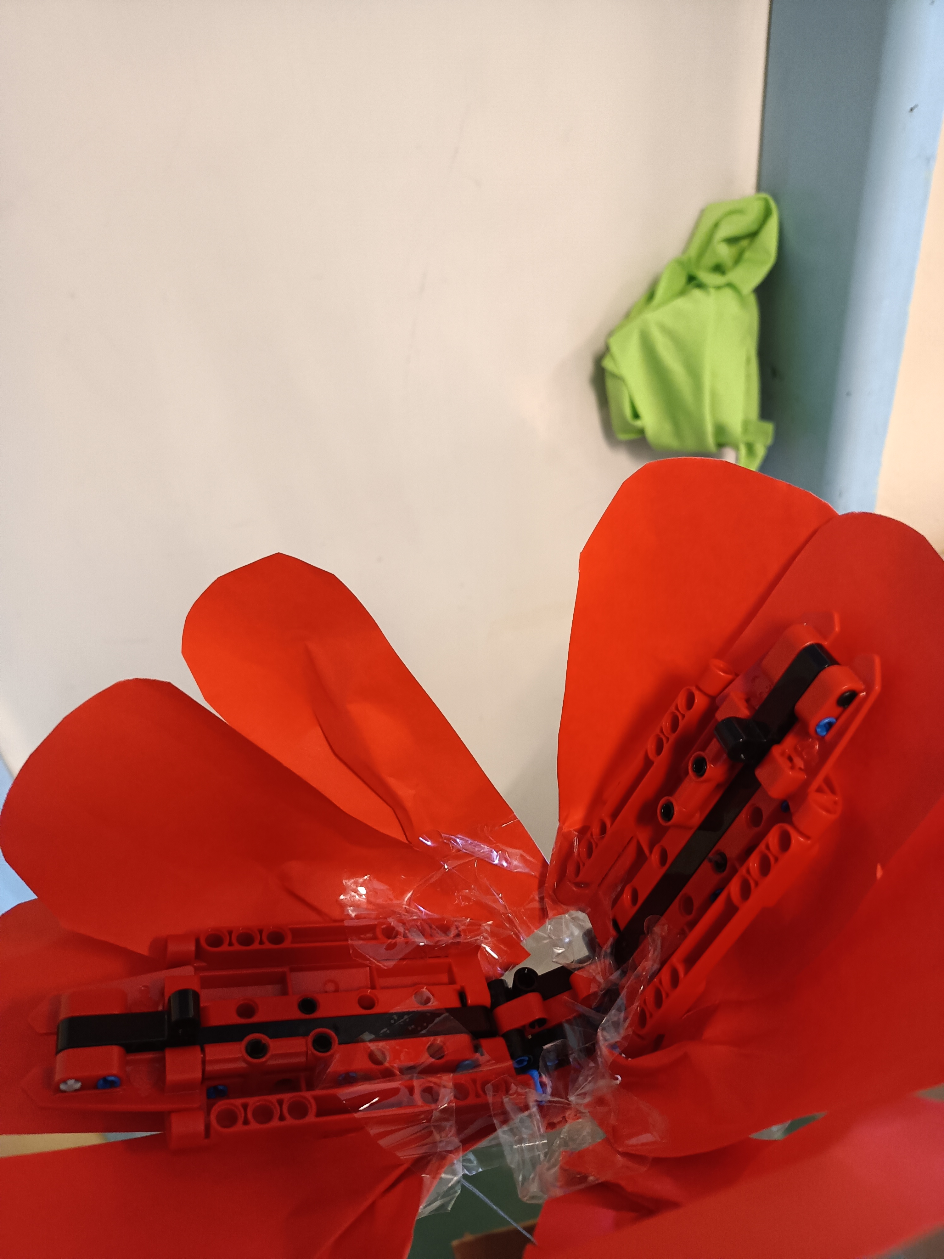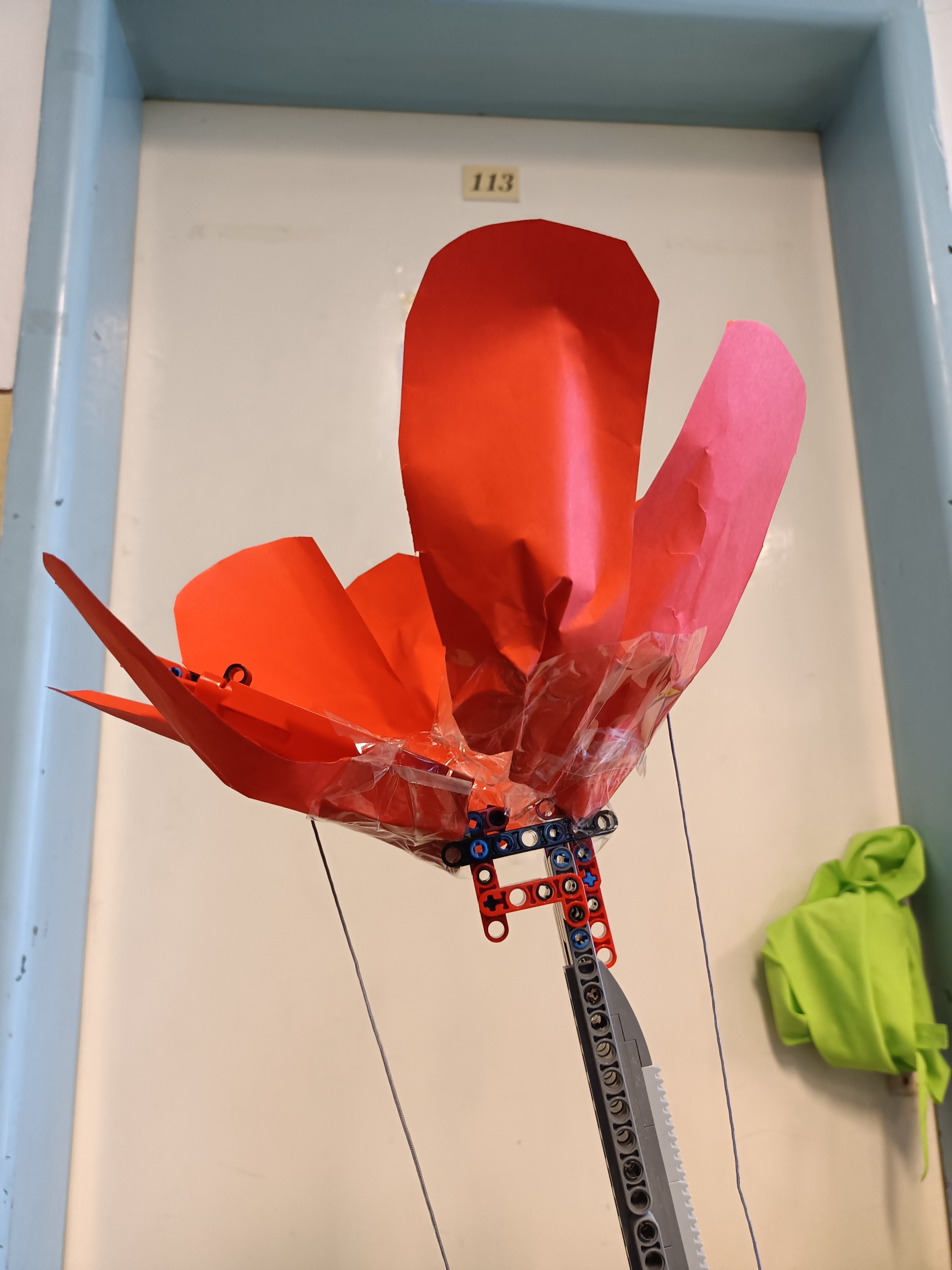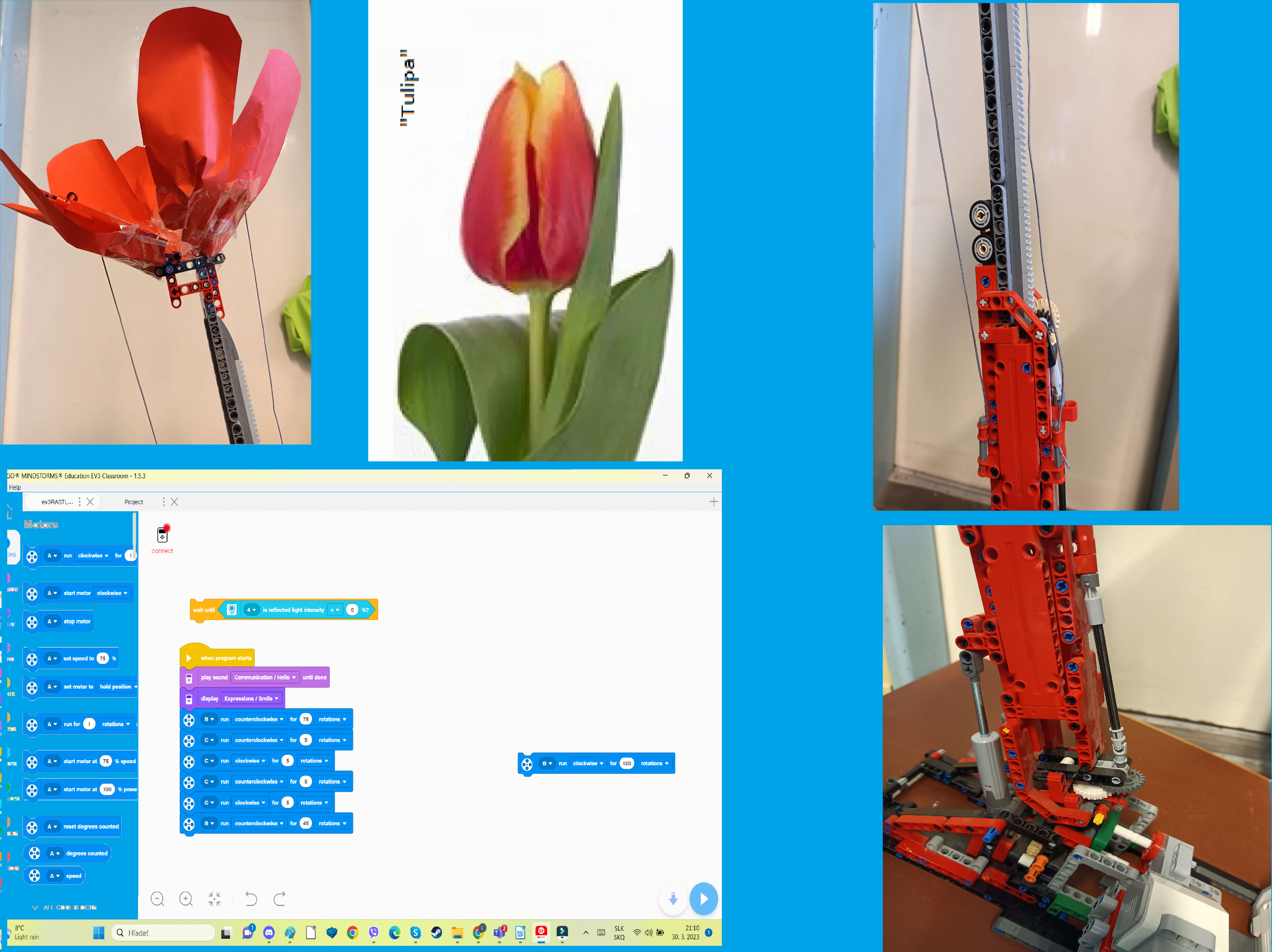 Svetelný senzor sme použili na to, aby odhalil, či je svetlo (deň) a ak áno, tak rastlina začne rásť. Rast nášho kvetu je založený na princípe fungovania žeriavu. Pri rozmýšľaní ako to skonštruovať, sme sa inšpirovali touto myšlienkou a vyrobili sme stupku ako zdvižné rameno žeriavu s mnohými ozubenými kolesami a ozubenou koľajnicou. Kvet sa otvára pomocou lanka, ktoré sa napne, keď kvet úplne vyrastie (vysunie sa na maximálnu stonku). Lupienky kvetu sme si pripravili z farebného papiera a prilepili ich k legu kúskom lepiacej pásky (viď foto a video).