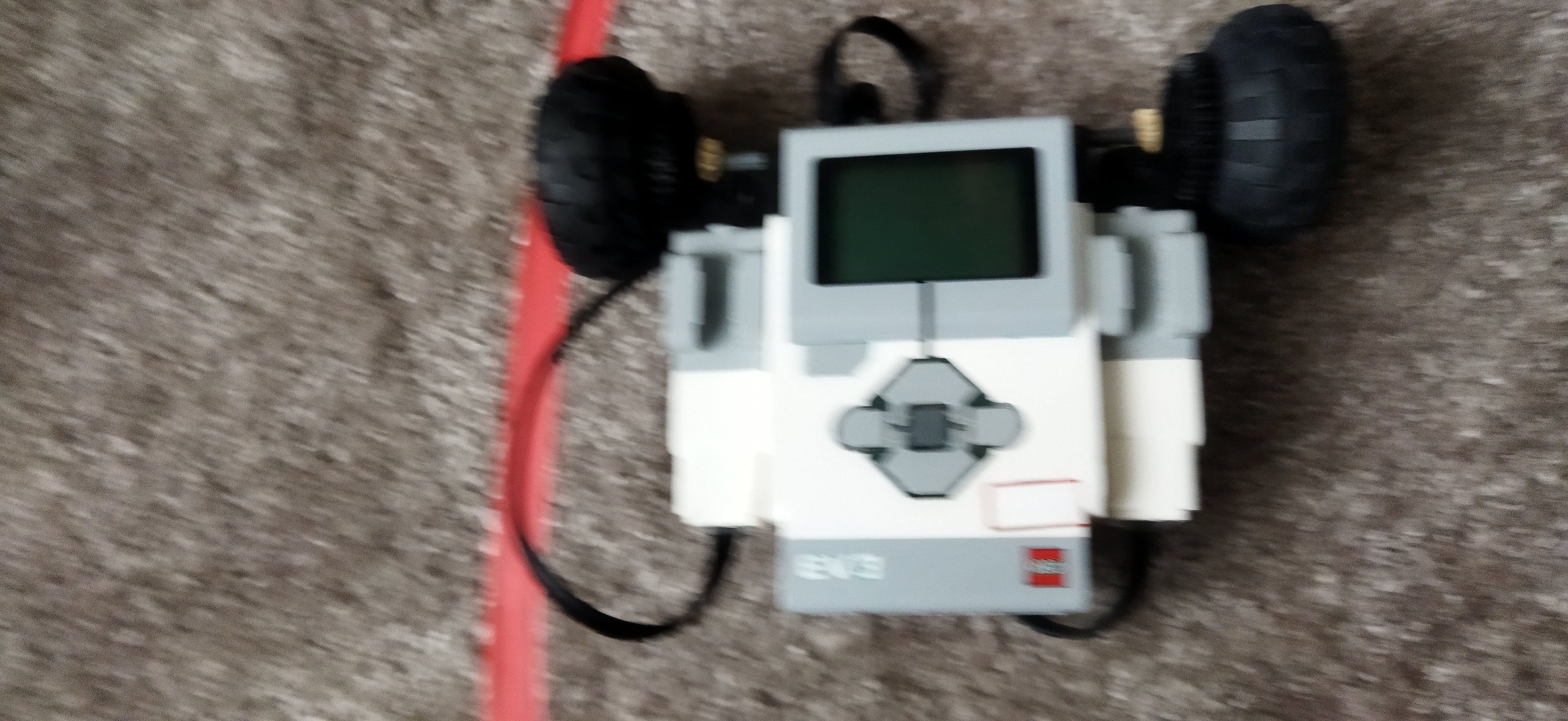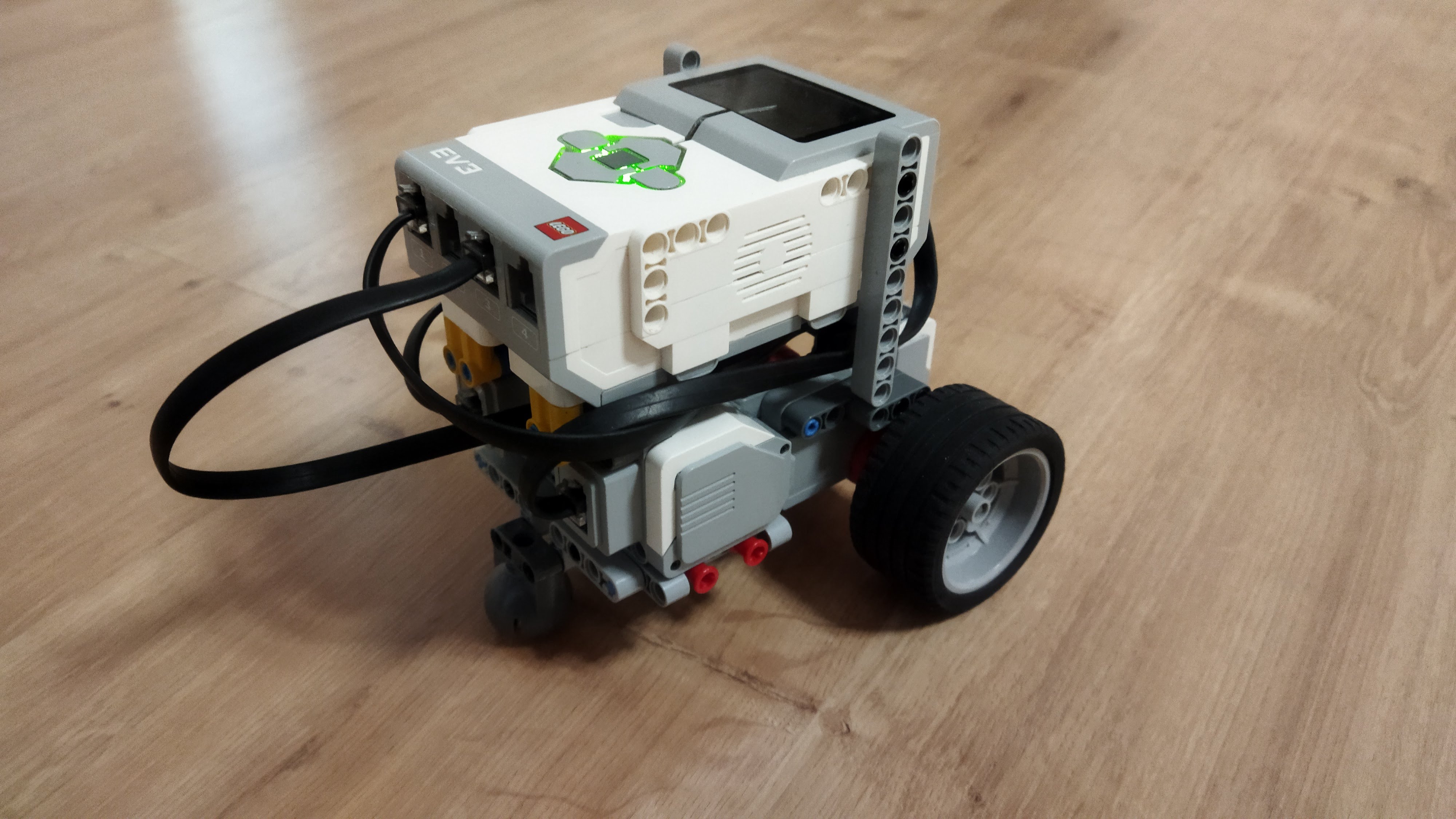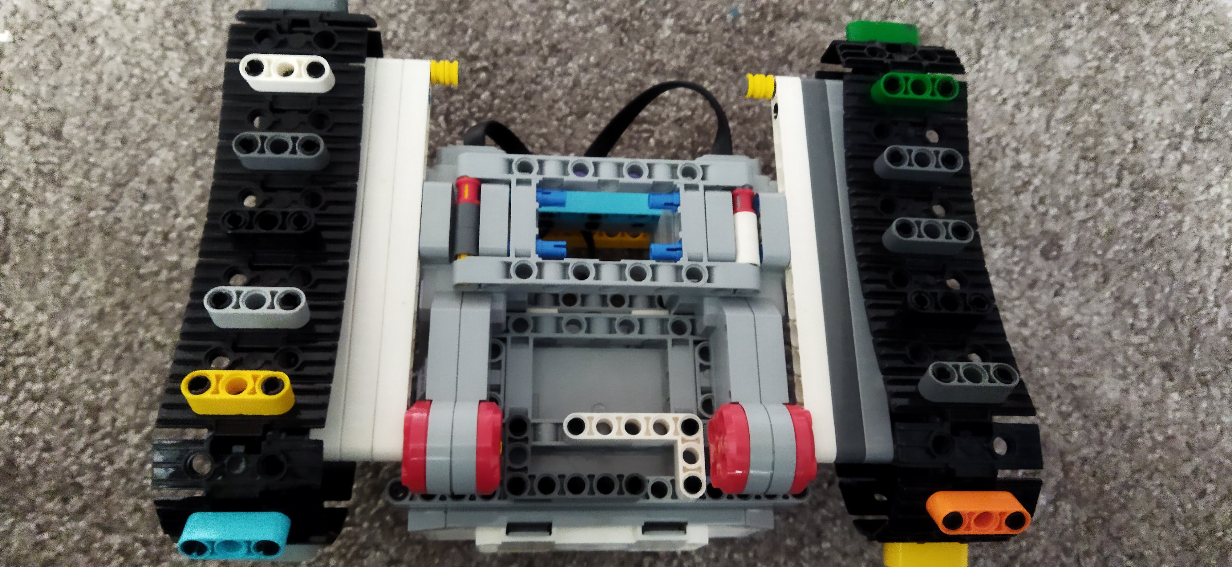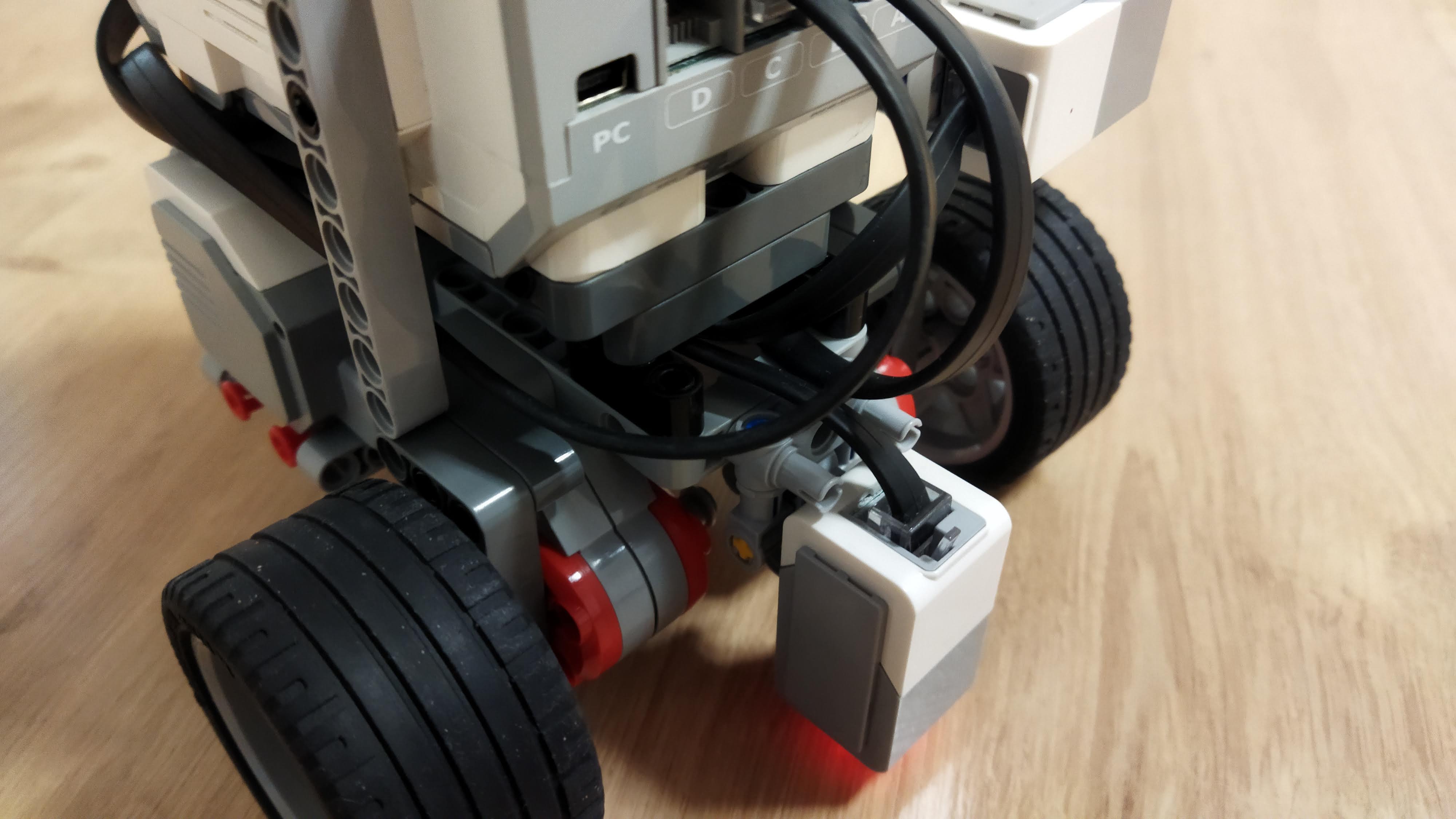 Náš robot je len kocka na kolieskach s farebným senzorom smerom a smerom nabok. Tým farebným senzorom ktorý smeruje dole sleduje čiaru a tým čo sleduje nabok sleduje „prejavy počasia“.