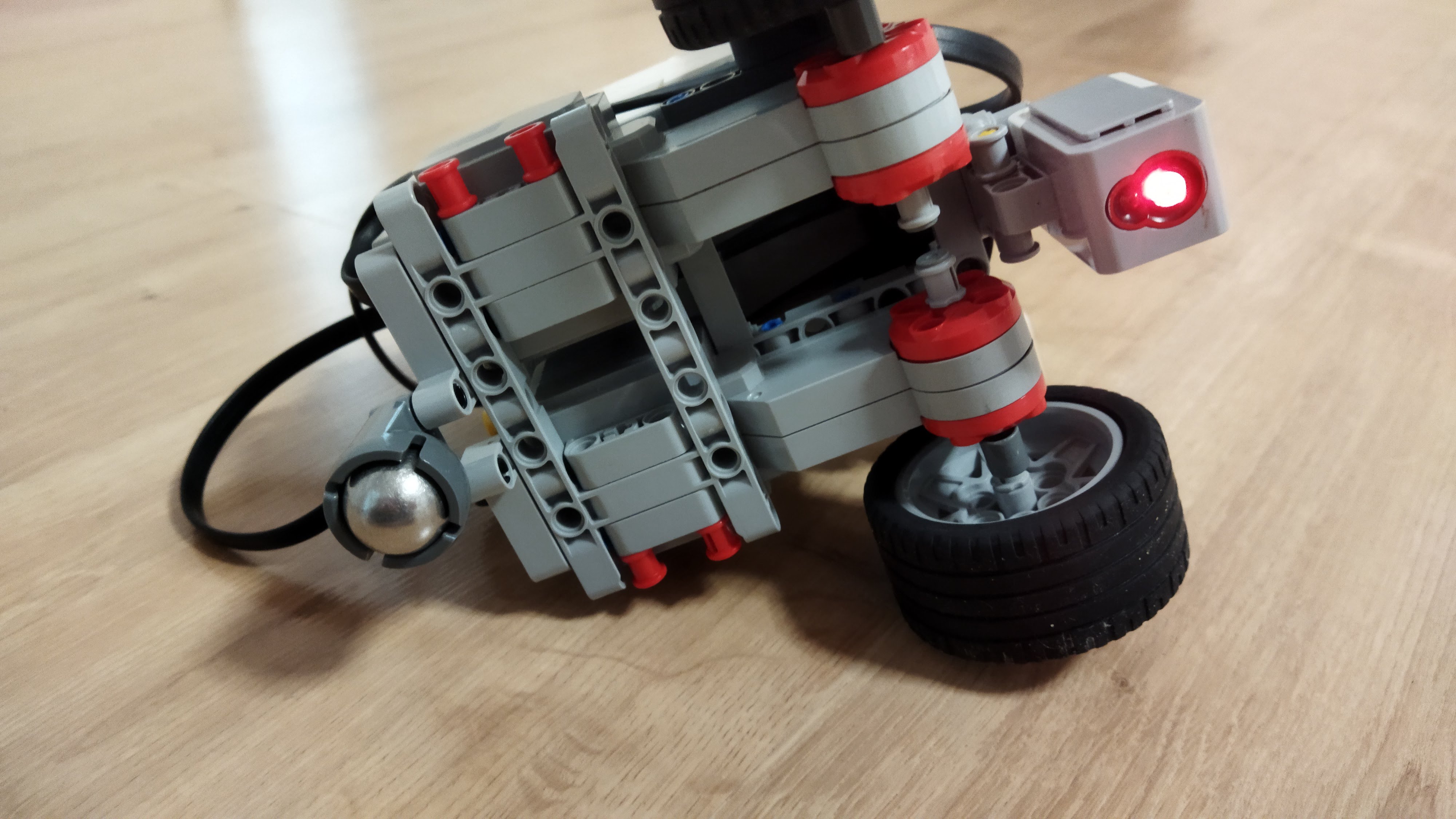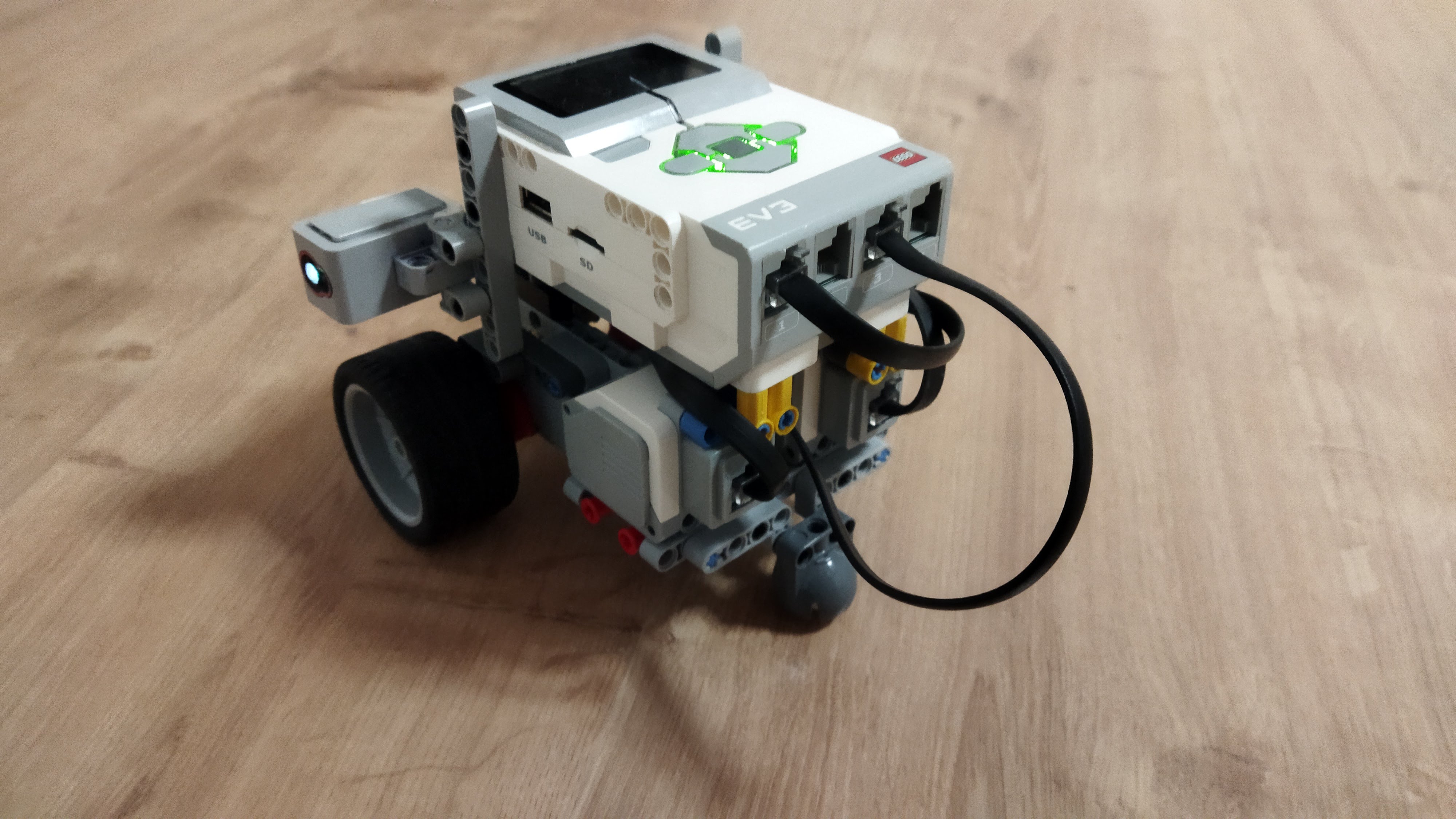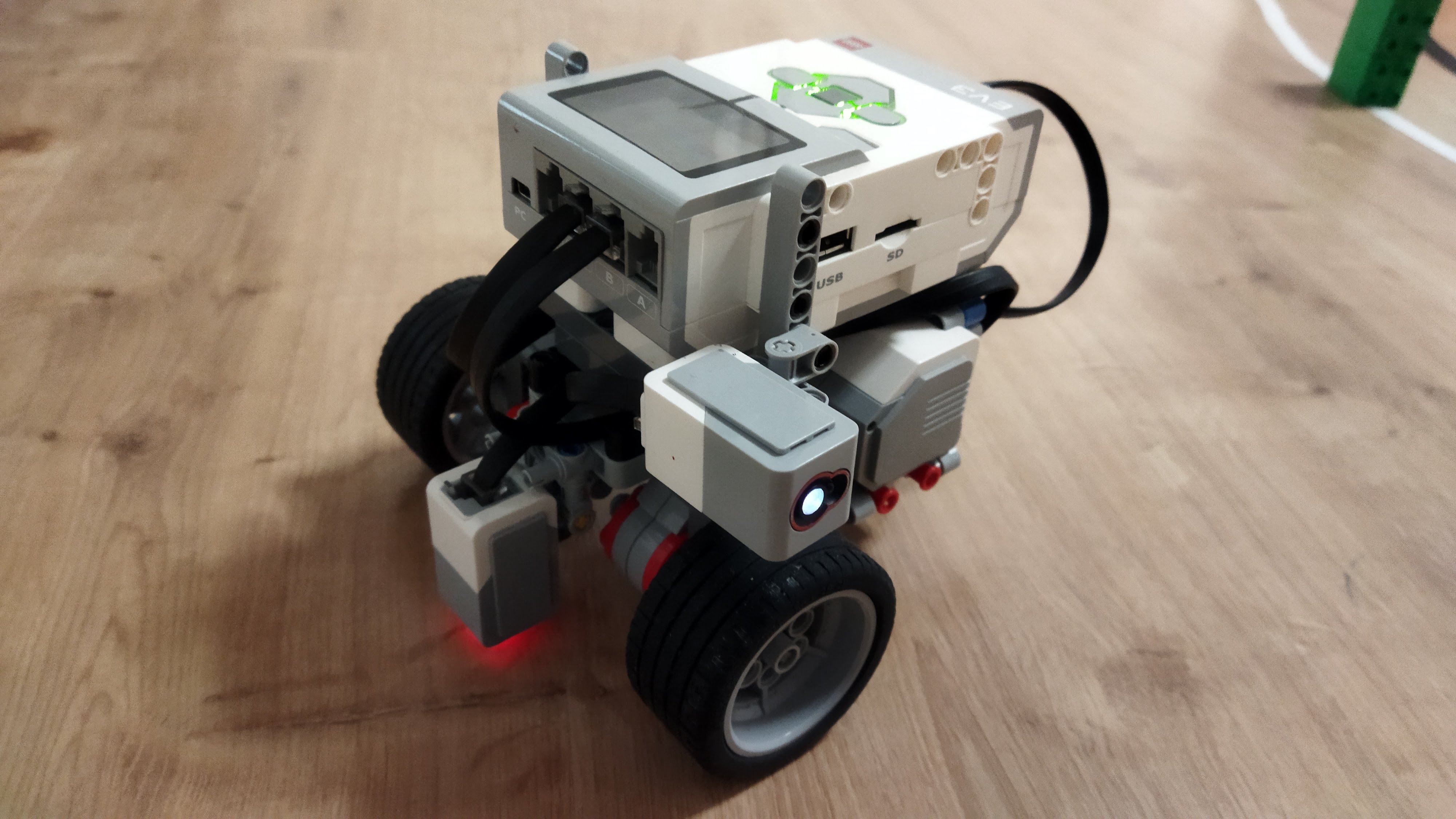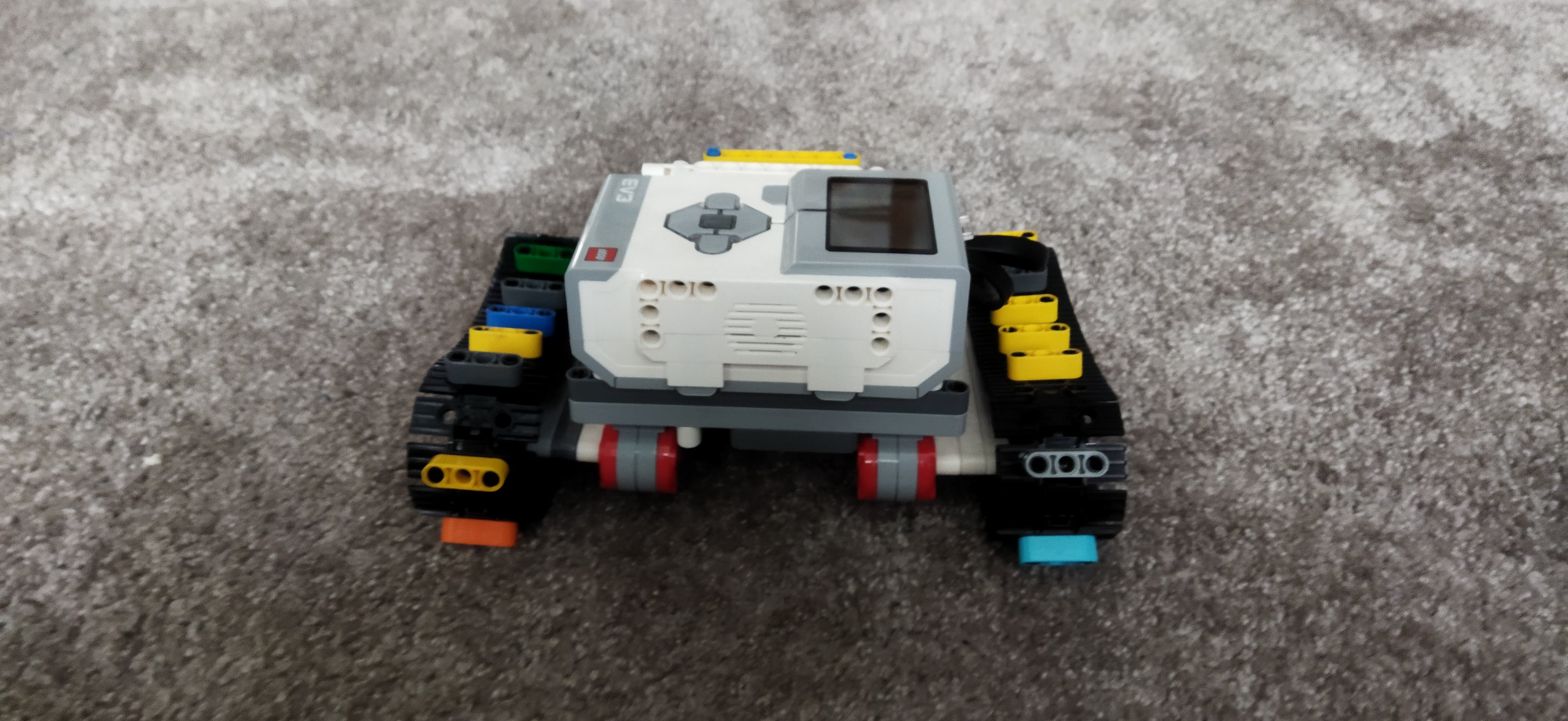 Náš robot je len kocka na kolieskach s farebným senzorom smerom a smerom nabok. Tým farebným senzorom ktorý smeruje dole sleduje čiaru a tým čo sleduje nabok sleduje „prejavy počasia“.