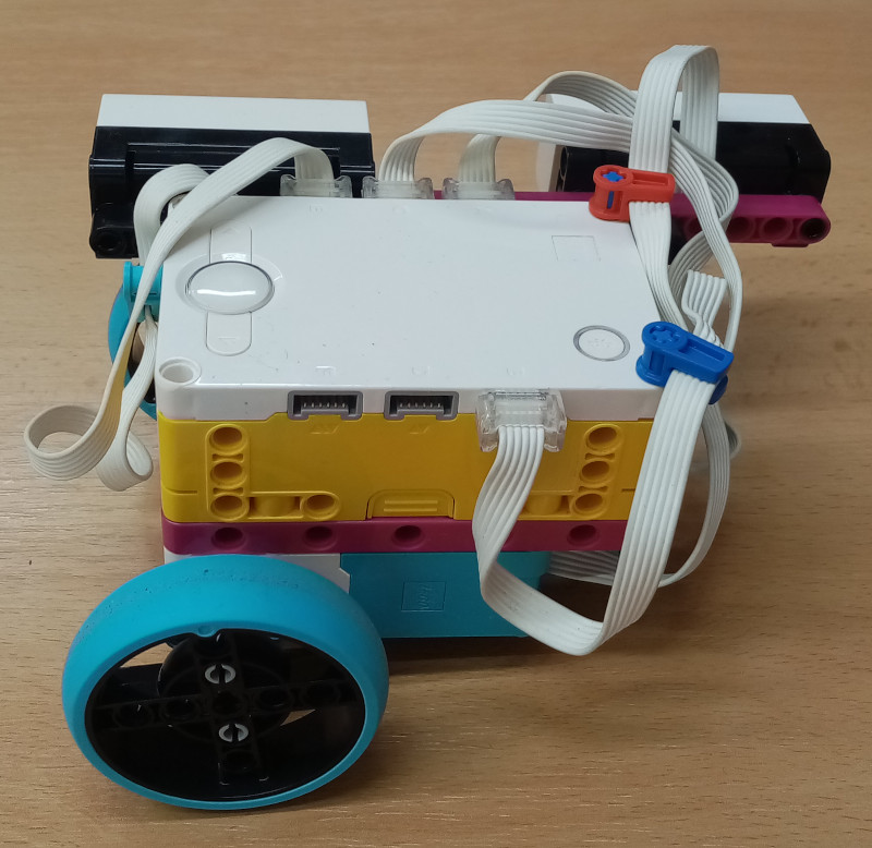 V Spike programe je obvod kolieska 17.5, takže keď vypočítame obvod našej kružnice = priemer * pi, tak vieme zistiť koľko otáčok sa má otočiť koliesko, aby robot obehol celú kružnicu. To vydelíme 4 a meriame otáčkovým senzorom - robot vždy na začiatku nového obdobia vydá zvuk a zmení farbu tlačidla.
