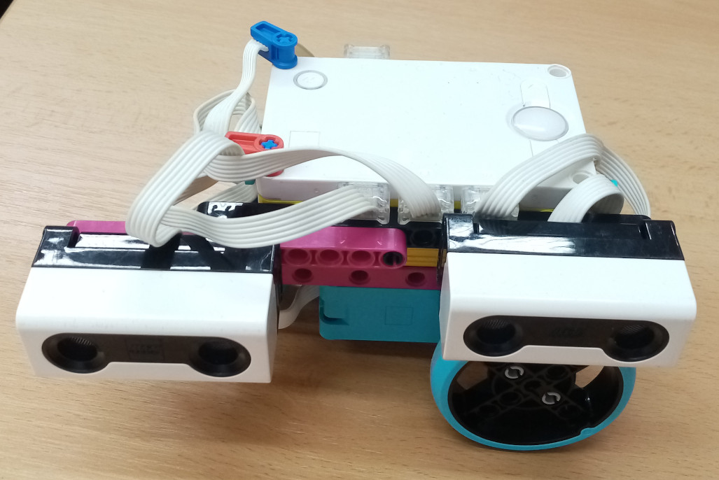 - ak je vzdialenosť zadného väčšia ako treba, točí vľavo- ak je vzdialenosť predného menšia ako treba, točí vpravo- inak ide rovnoAk sme použili iba jeden senzor, tak keď sa zatočil, väčšinou prestal kôš celkom vidieť a potom ho už nenašiel. Takto ho udržiavajú na trati oba senzory.