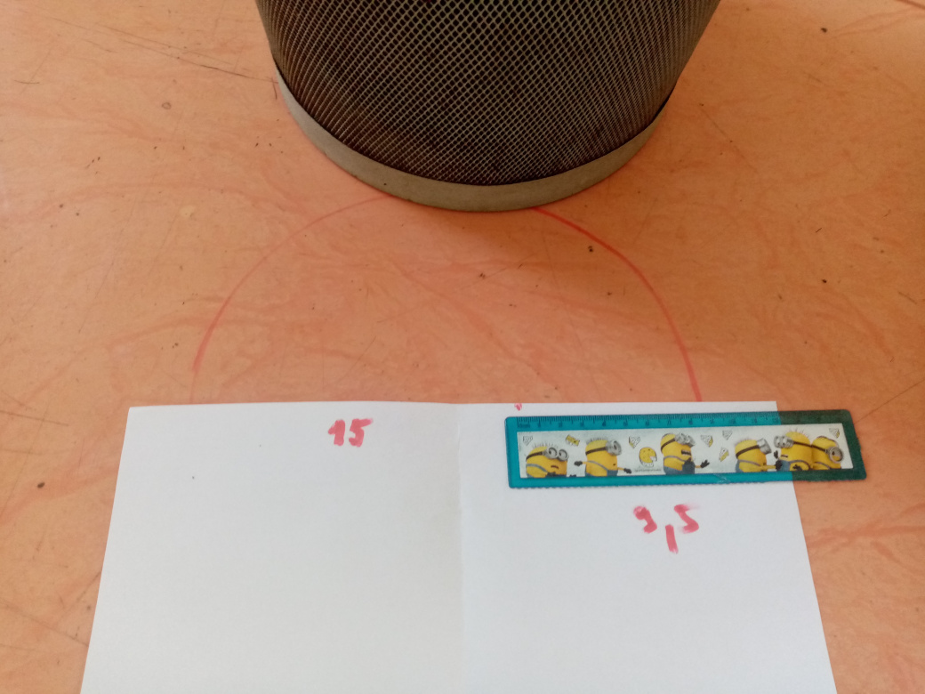 Robot po štarte programu zistí vzdialenosť k obiehanému košu. Priemer koša sme zmerali pravítkom ako ukazuje obrázok. Priemer kružnice po ktorej robot obieha je 2x nameraná vzdialenosť plus priemer koša.