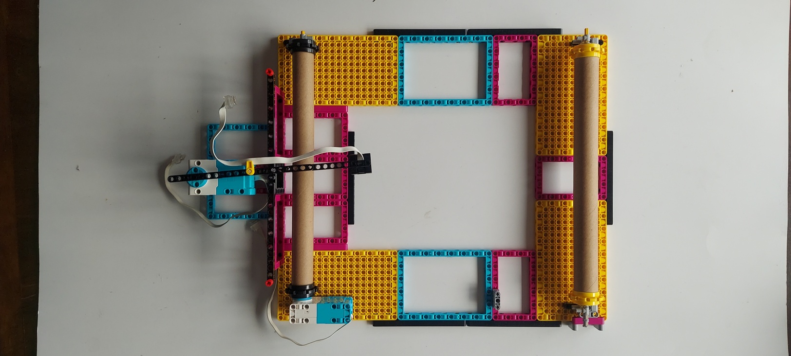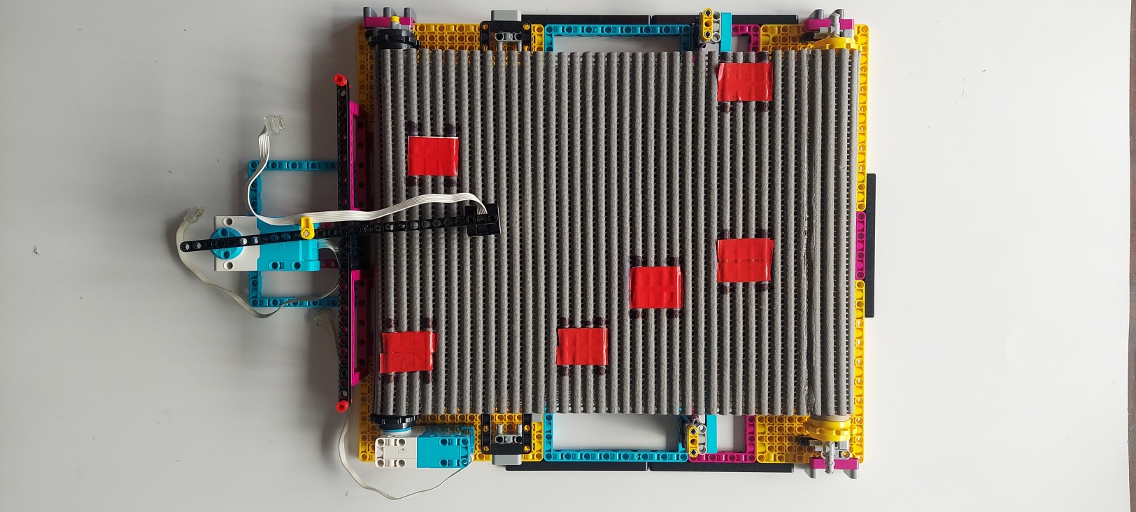 Dráha je vyrobená z plastového (kúpeľňového) koberca, ktorý sa otáča na kartónových valcoch (fotka č.1) oproti „autu“- kocke lega- ktorú motor pomocou dvoch dotykových senzorov vyhýba doprava a doľava a tak sa auto vyhýba ostatným.