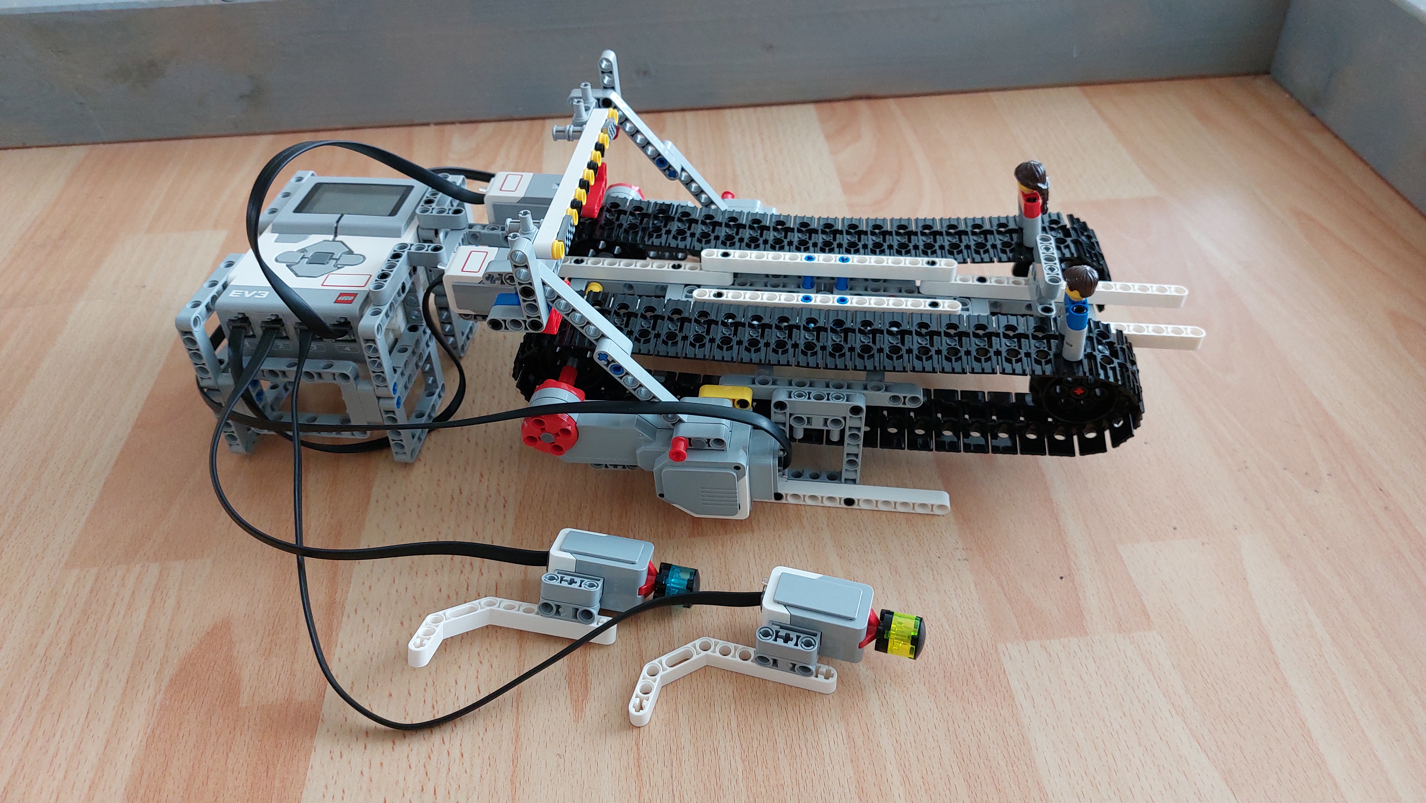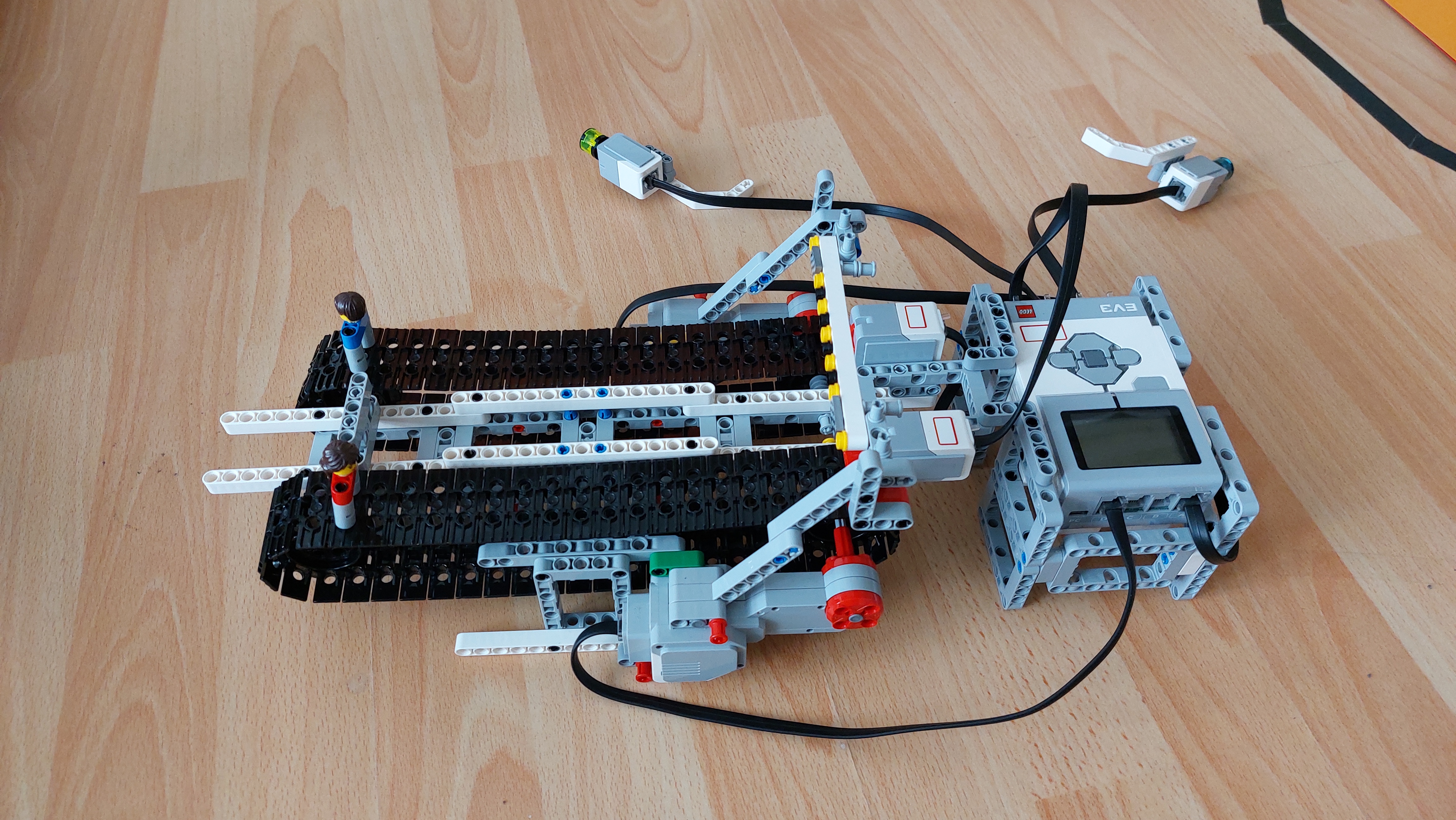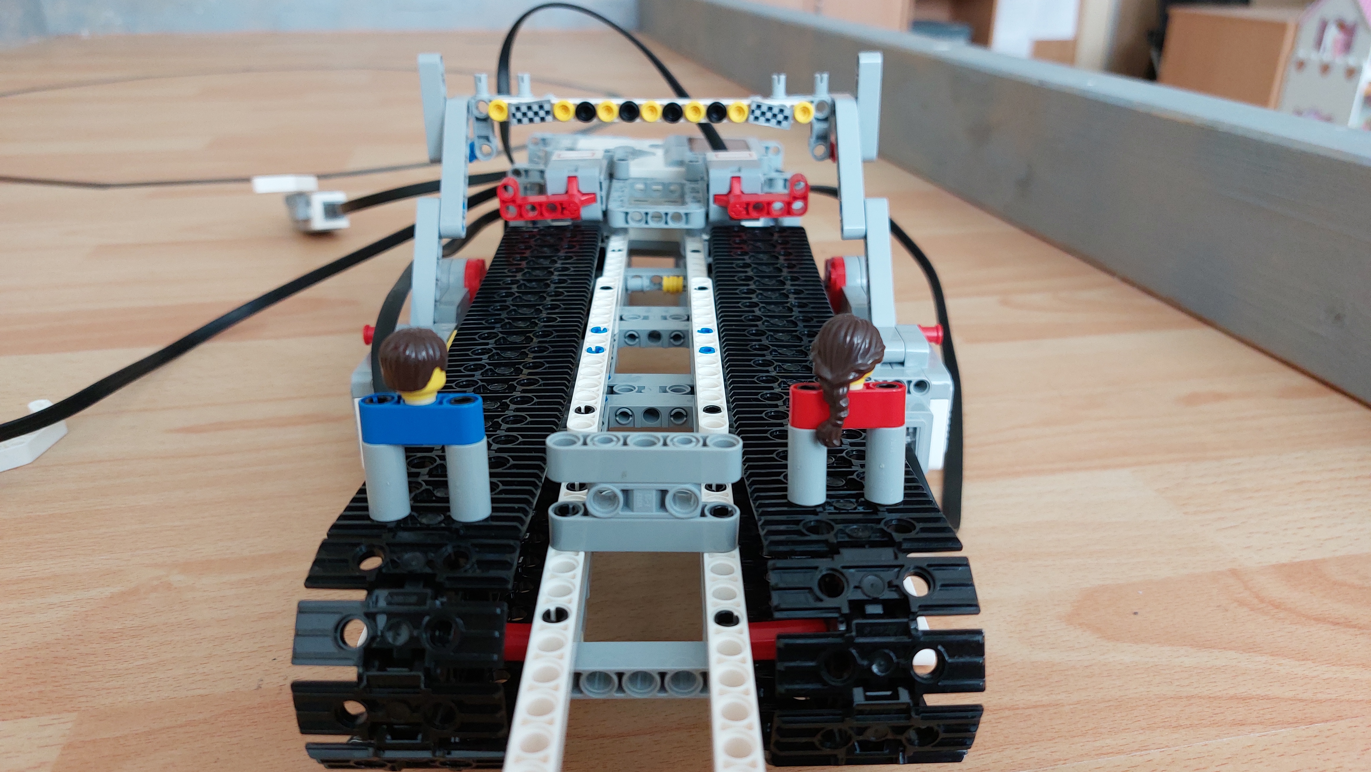 Náš robot simuluje preteky dvoch šprintérov. Konštrukcia Dve nezávislé časti, ktoré sa skladajú z pásu na ktorom je pripevnený pretekár, veľkého motora, ktorý pohybuje pásom, cieľového tlačidla a tlačidla na posun pásov. Program Po zvukovom signále sa odštartujú pretekári. Stláčaním ovládacích tlačidiel sa otáčajú motory, ktoré posúvajú pretekárov na pripojenom páse. Pretek skončí stlačením jedného z cieľových tlačidiel. Robot povie farbu víťazného hráča. Počas preteku robot ráta počet stlačení ovládacích tlačidiel, čím vie o koľko pootočení motora sa pretekári posunuli dopredu. To sa využije na konci preteku na návrat pretekárov na štart.