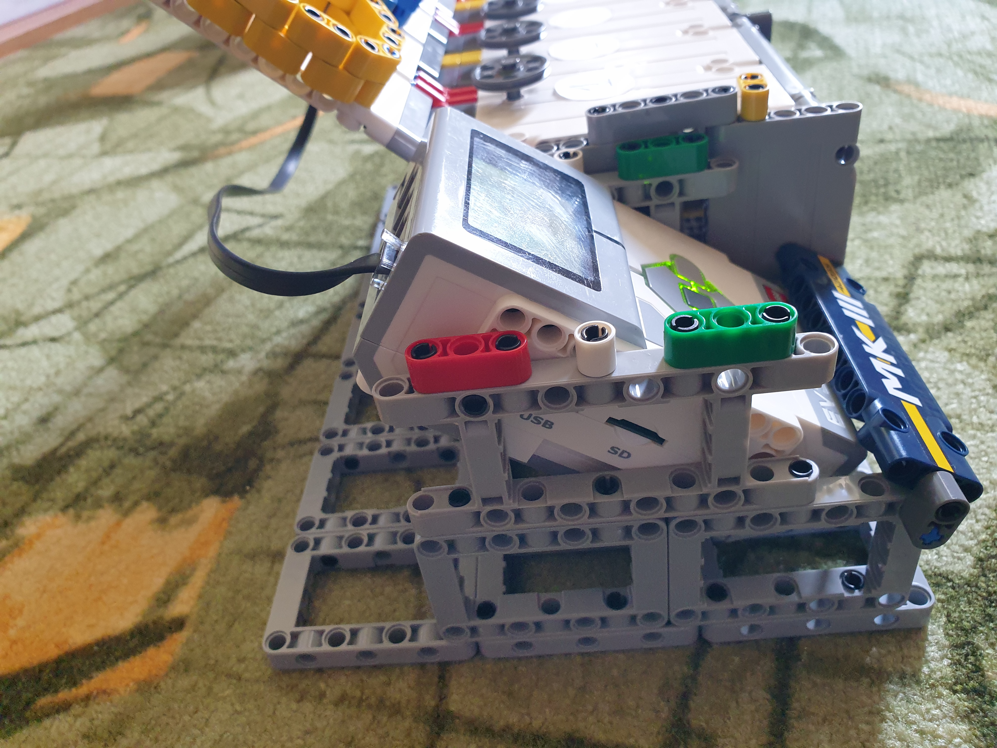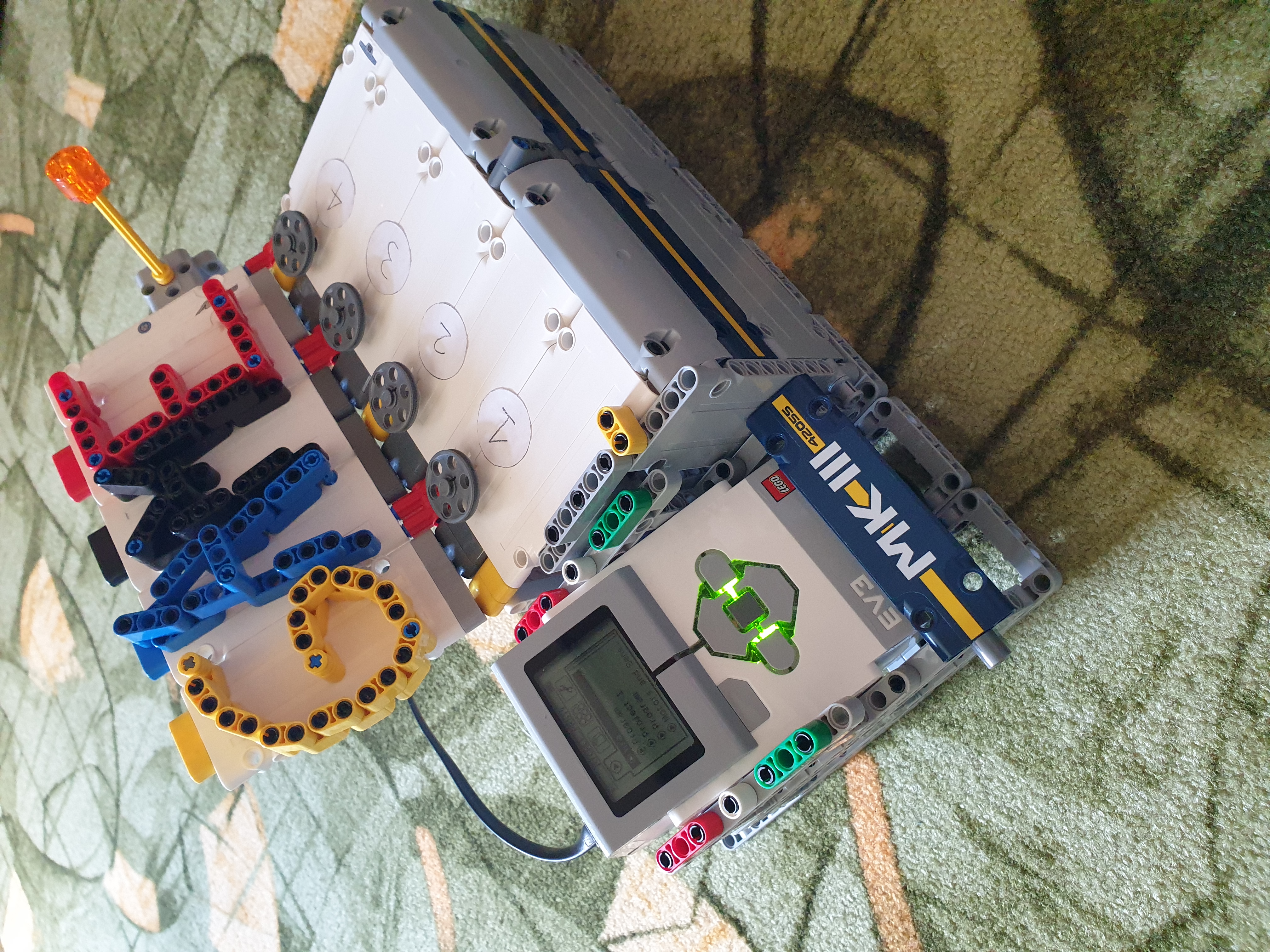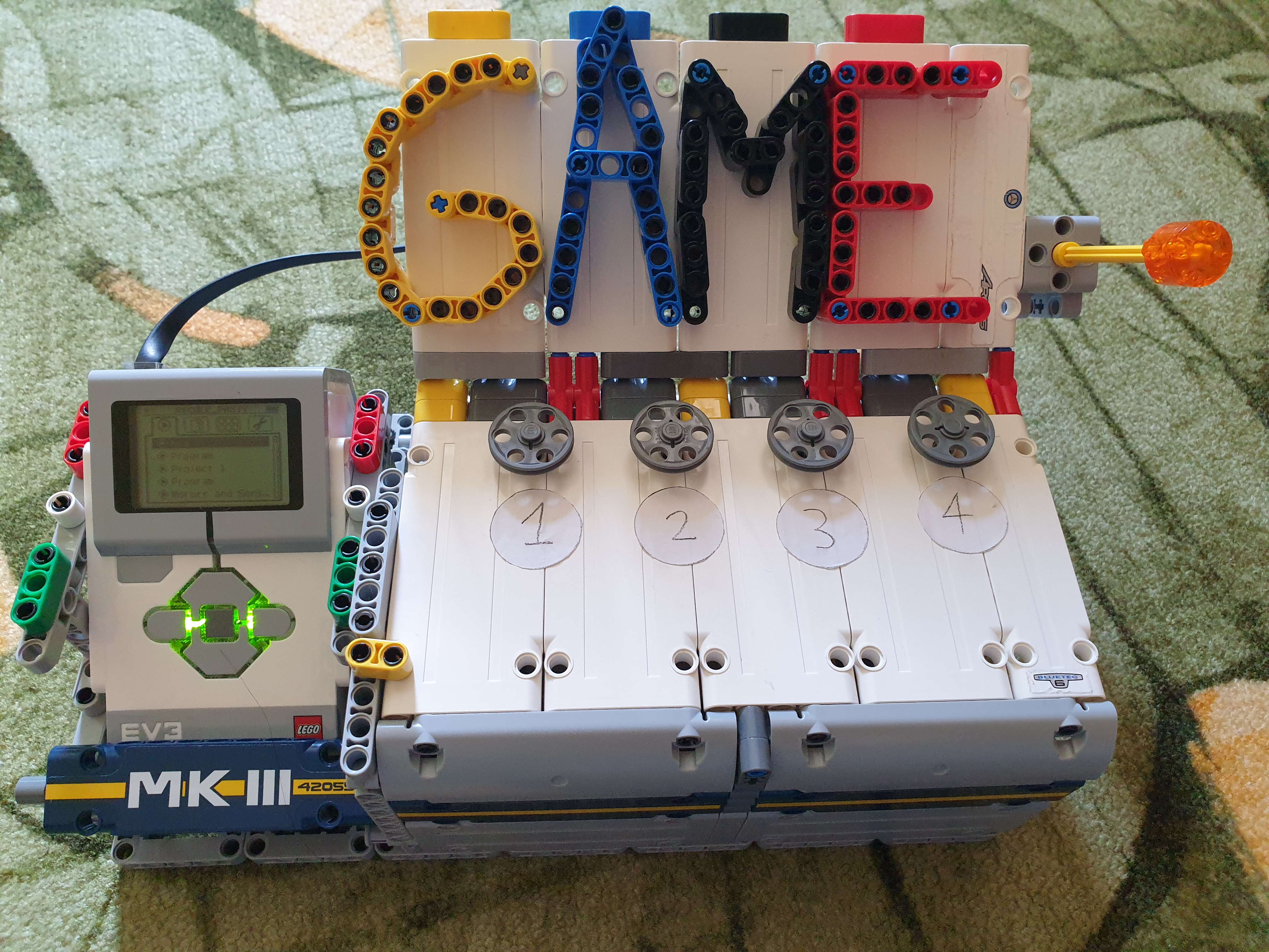 Naša MK3 hra sa skladá z EV3 kocky, jedného stredného motora a 4 dotykových senzorov. Najprv sa premietne úvod a inštrukcie a potom sa čaká na stlačenie tlačítka na kocke. Po stlačení hra vygeneruje 4 náhodné čísla, vypíše ich na obrazovku a pustí čas a stredný motor kroý sa krúti počas zadávania. Potom čaká na stlačenie 4 tlačítok. Ak ich hráč stlačí v správnom poradí, zaznamená sa čas a hra pokračuje. Ak sa pomýli, automaticky vyhral druhý hráč. Program vygeneruje 4 náhodné čísla druhému hráčovi, ktorý sa tiež pokúša vyhrať s najrýchlejším časom. Ak zadal správne, hra porovná obidva časy a menší čas vyhráva. Ak zadal nesprávne, vyhráva prvý hráč.