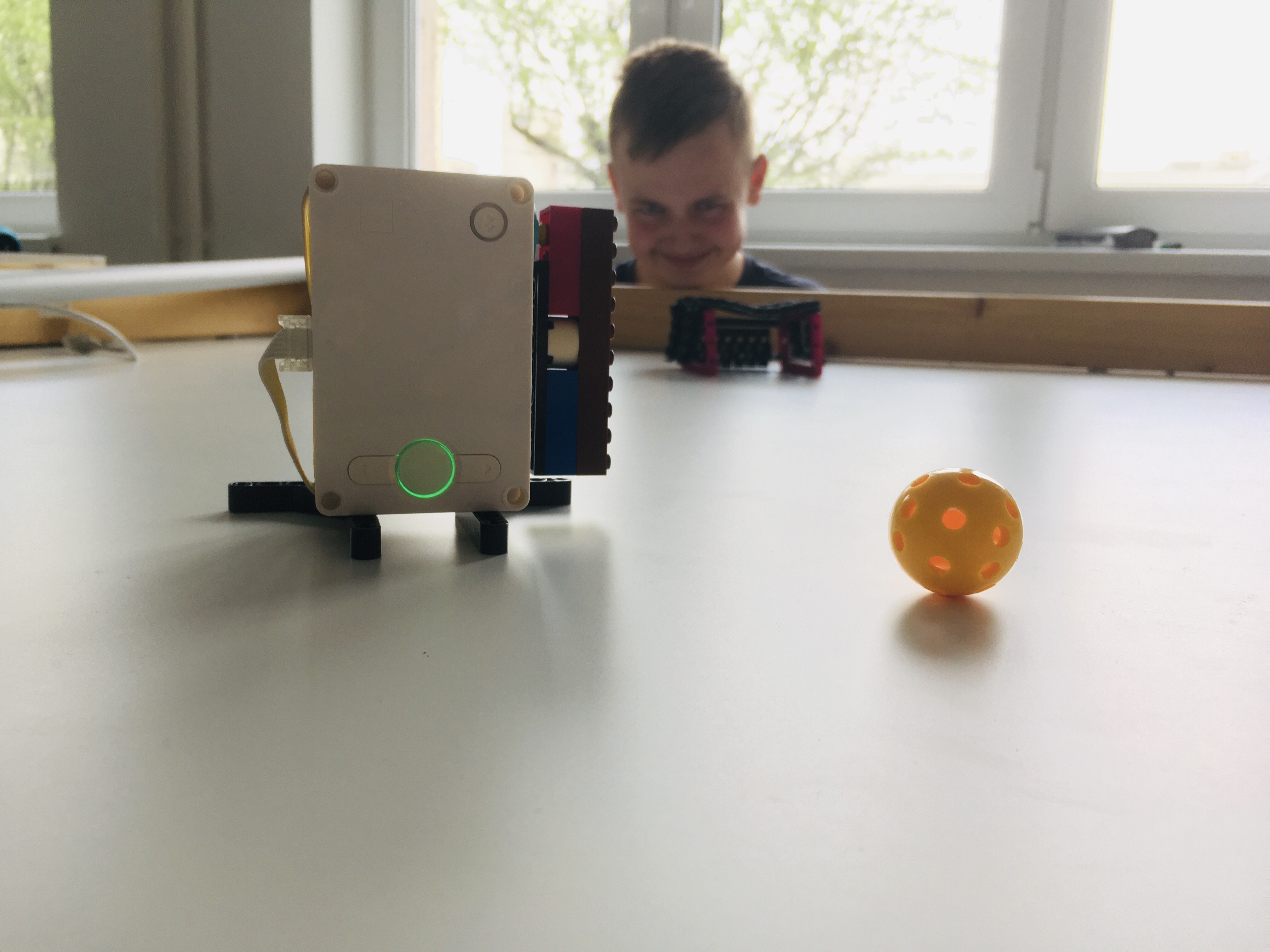 Náš robot hrá futbal čiže ho niekto drží, chodí sním a ked stlačí hlavné tlačítko tak robot pohne páčkou ktorá akokeby kopne do lopty a snaží sa s ňou dať gol do brány.