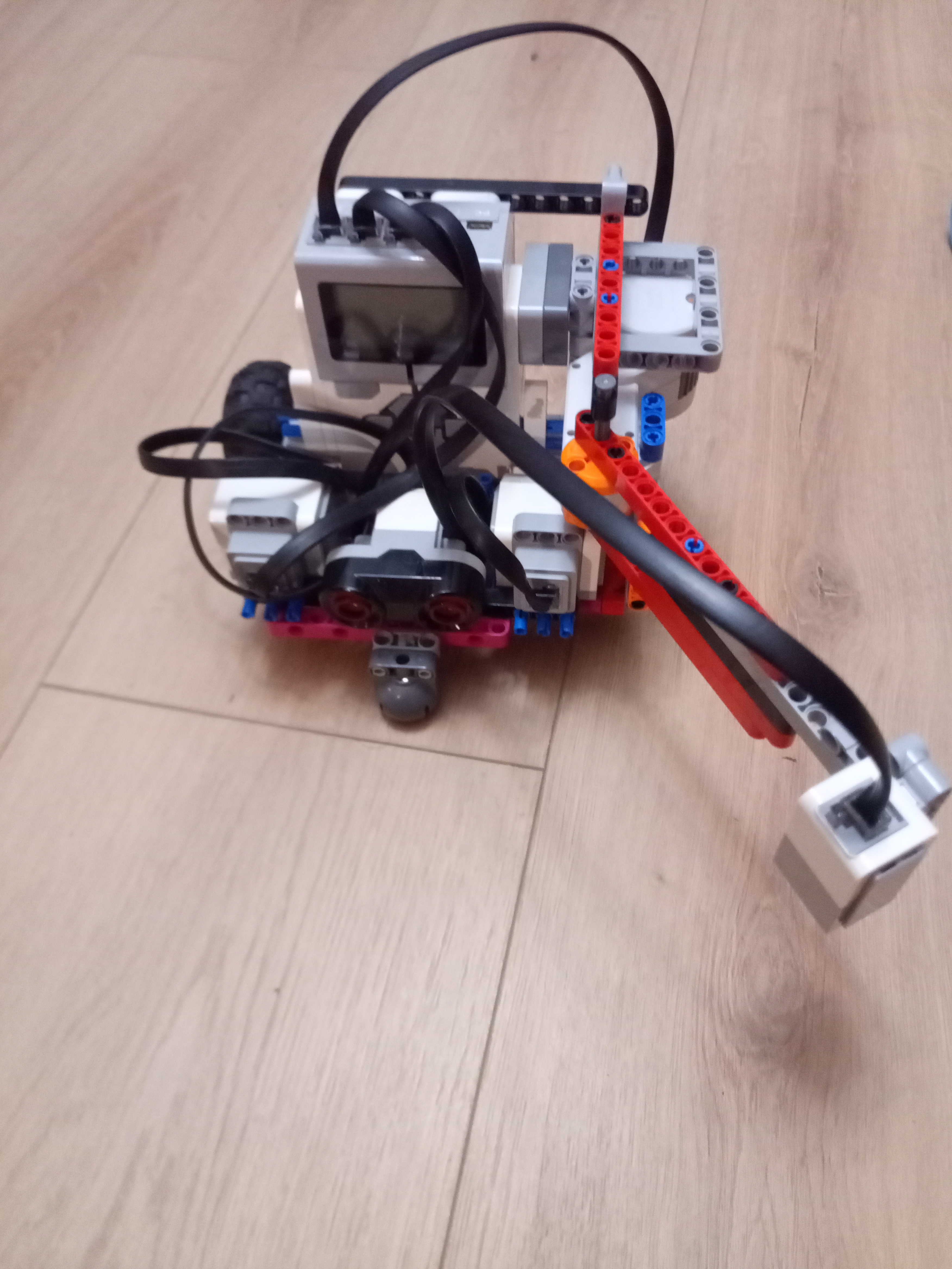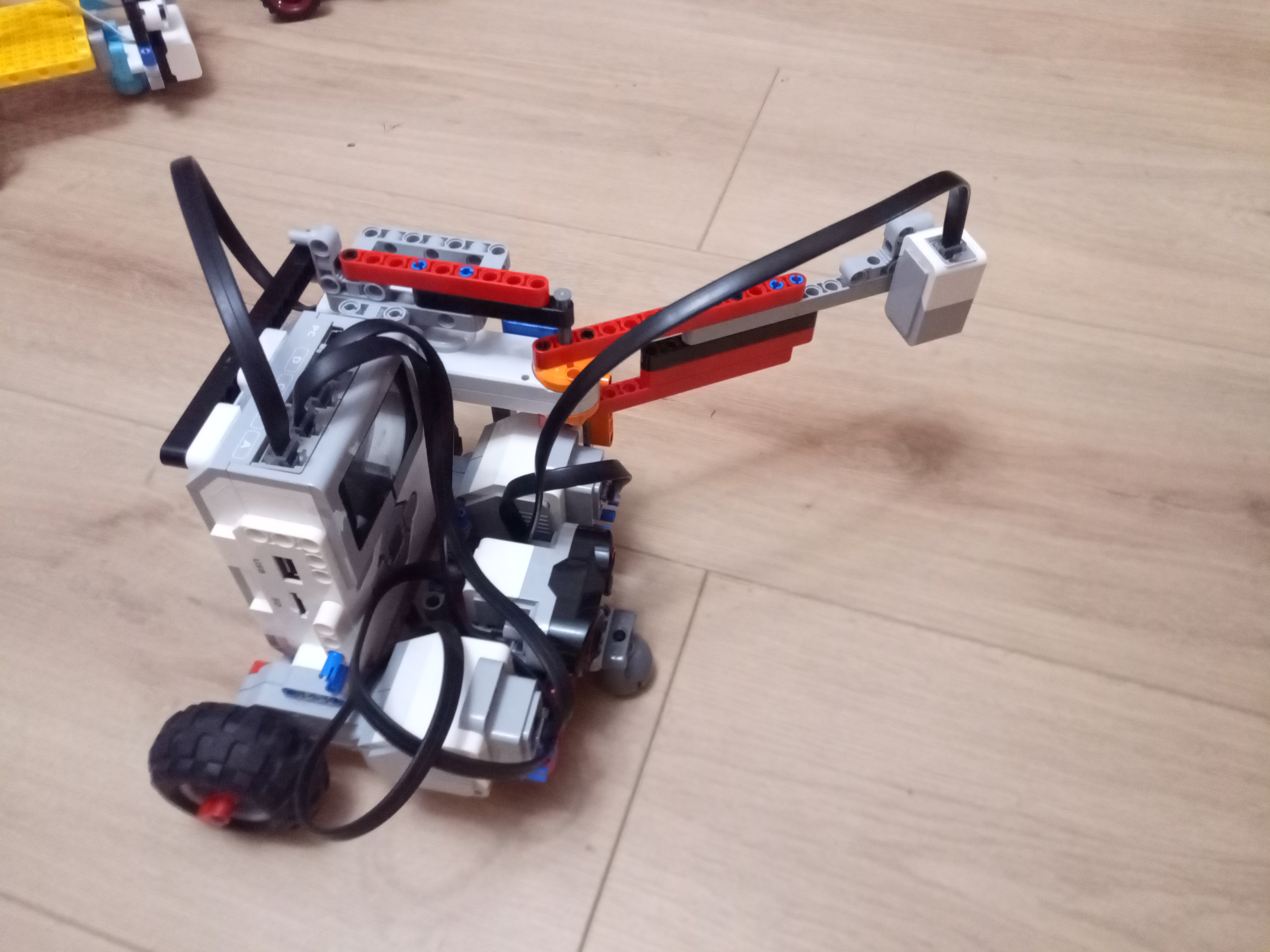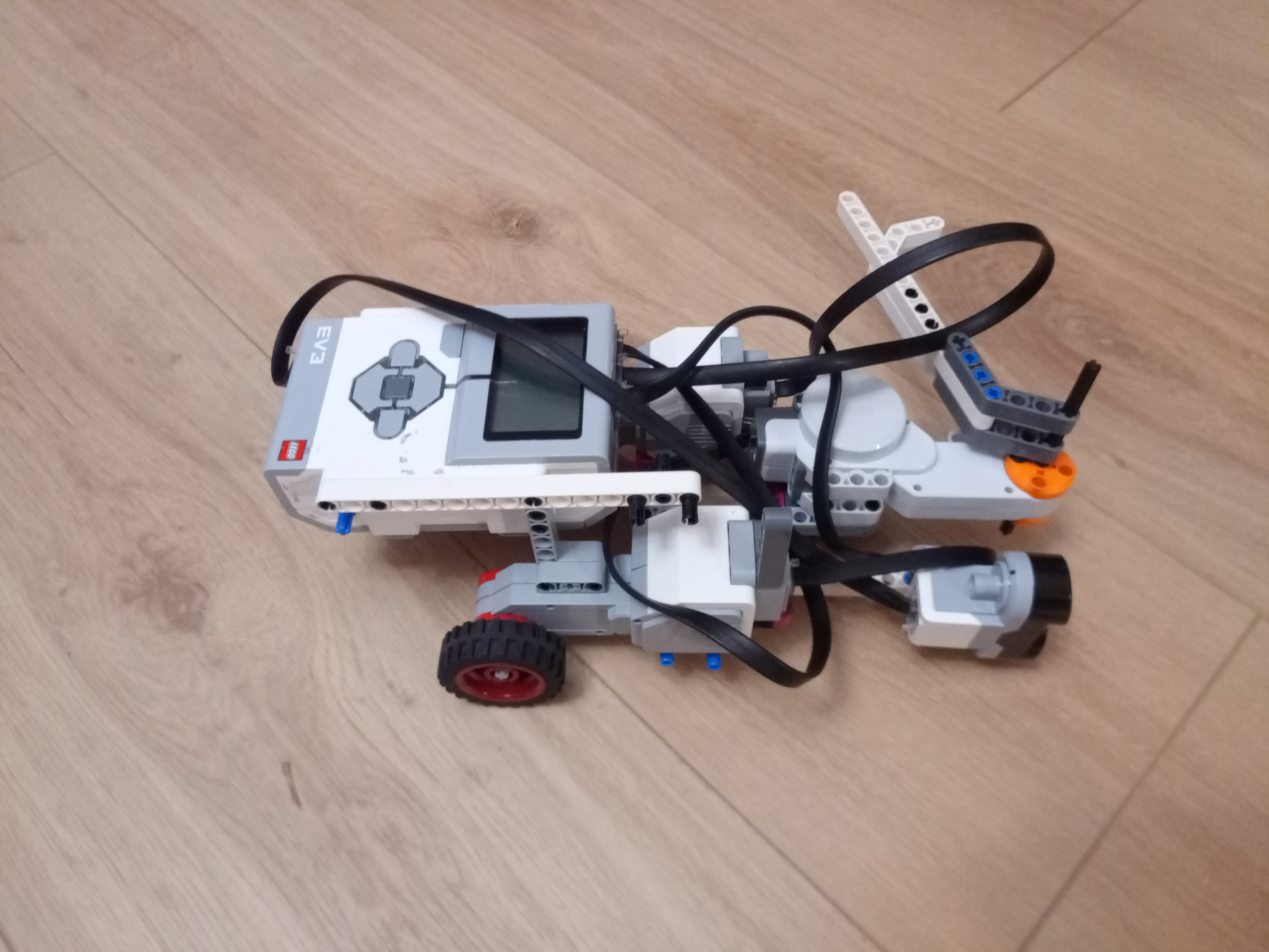 Náš robot sa skladá z EV3 kocky, dvoch veľkých motorov na pohyb robota, jedneho veľkého motora na rameno žeriavu a jedného melého motora na chňapák. A ešte máme USG senzor.
