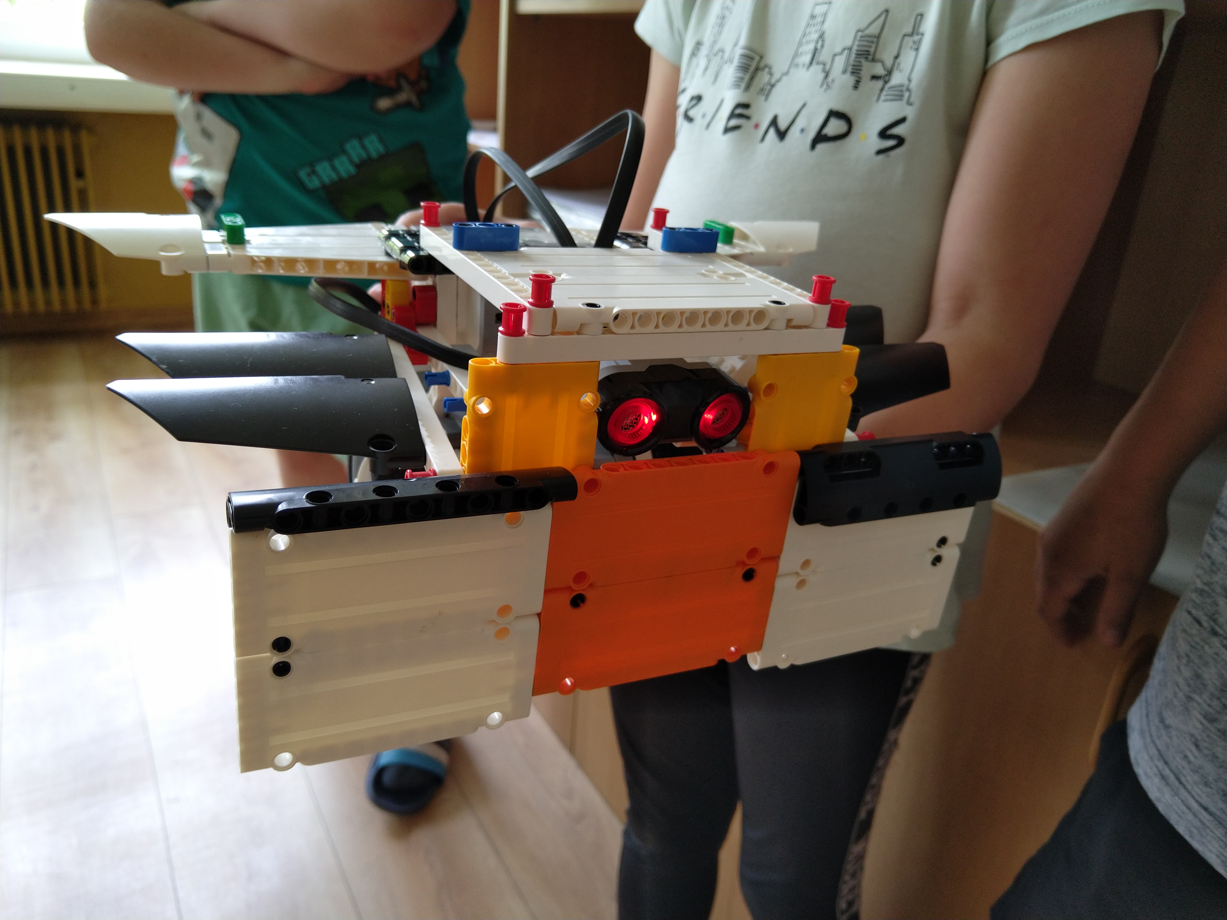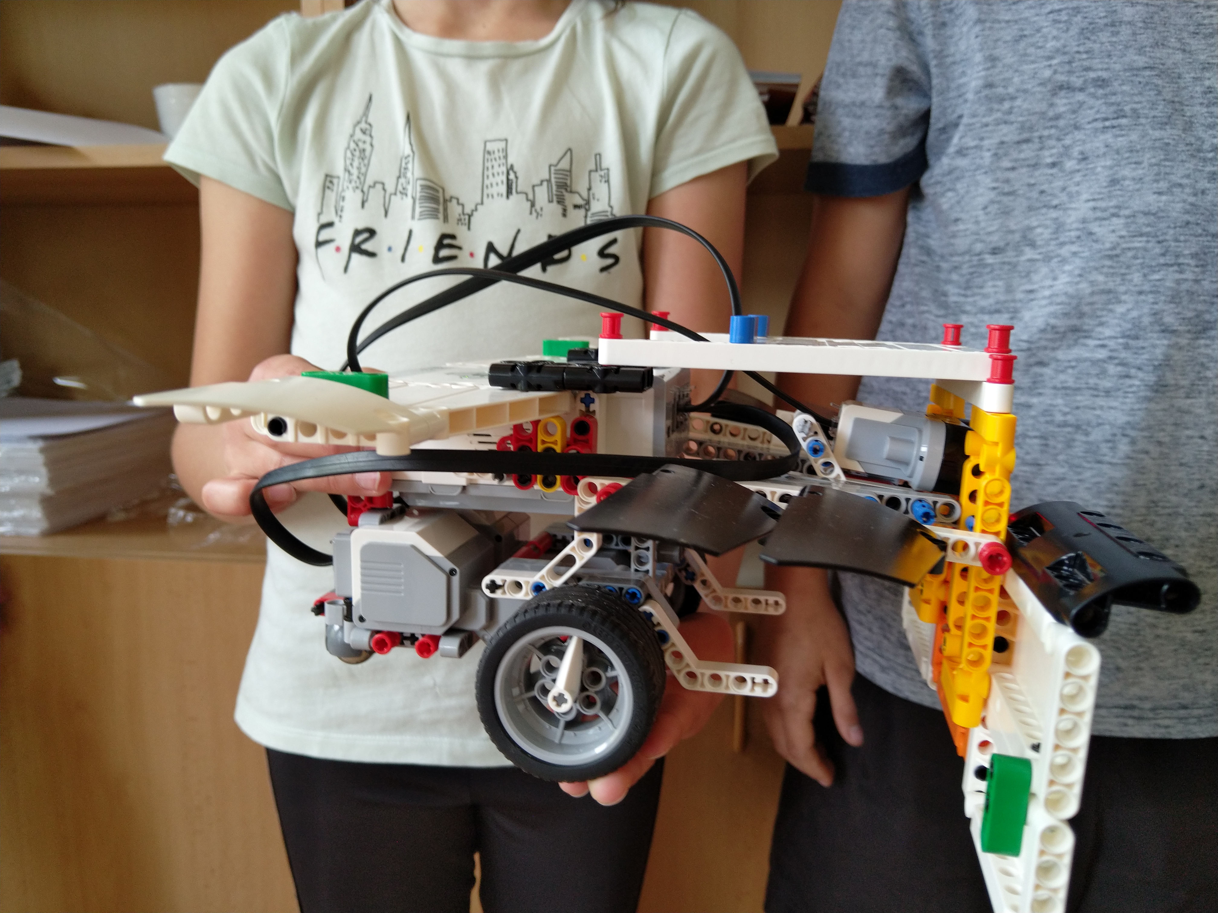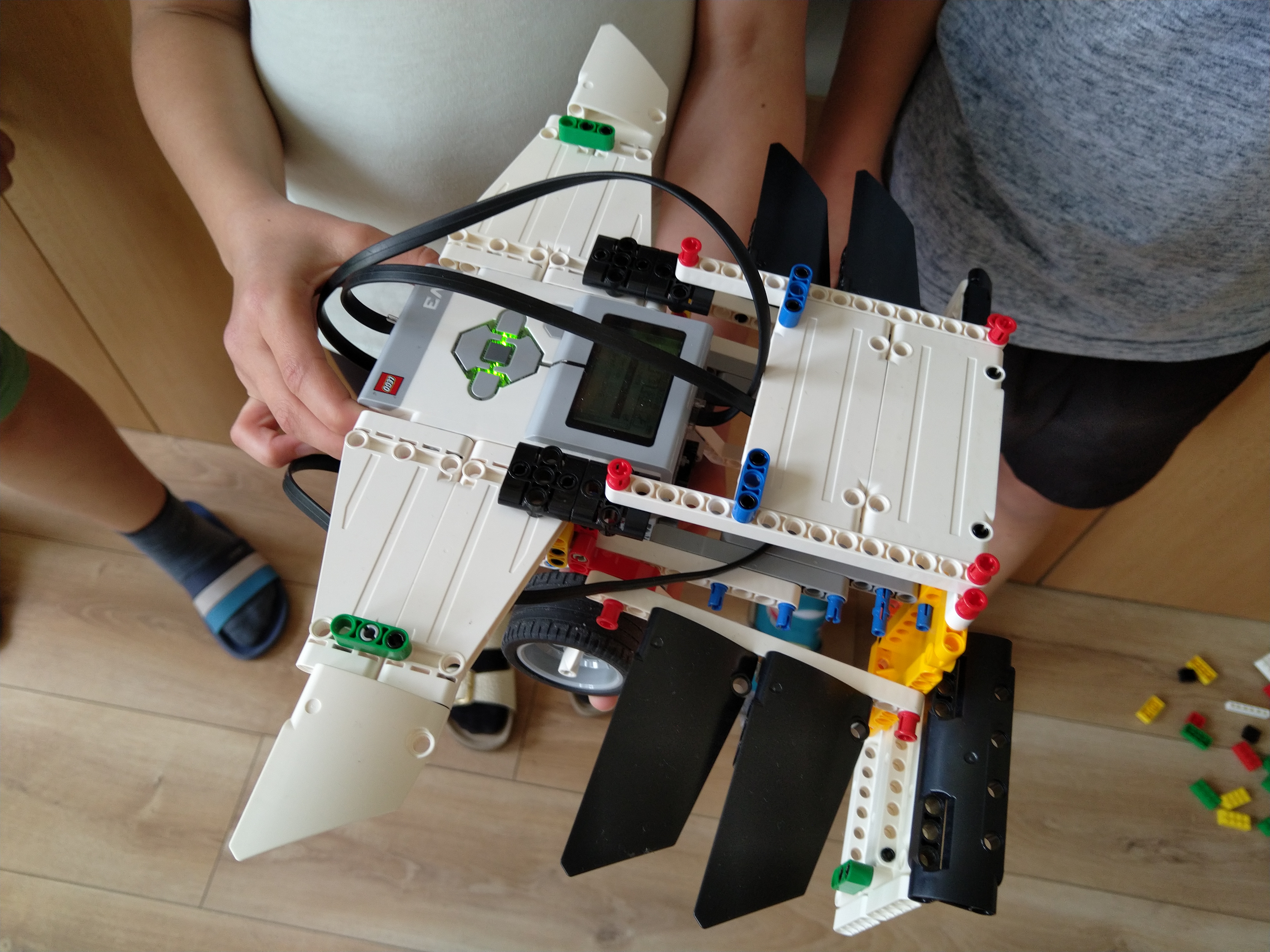 ProgramRobot musí ísť dopredu a dozadu. A medzitým bude búrať naše stavby. Medzitým ultrasonický senzor vidí kde sú tie stavby. A keď zbúra tu stavbu, tak cúvne dozadu a sa toči na tom mieste, dokedy nenájde nejakú stavbu.Stavba robota Náš robot sa skladá z ultrasonického senzora, z programovacej kocky, z dvoch veľkých motorov, má šesť krídel, dve kolesá a baranidlo (to vpredu).
