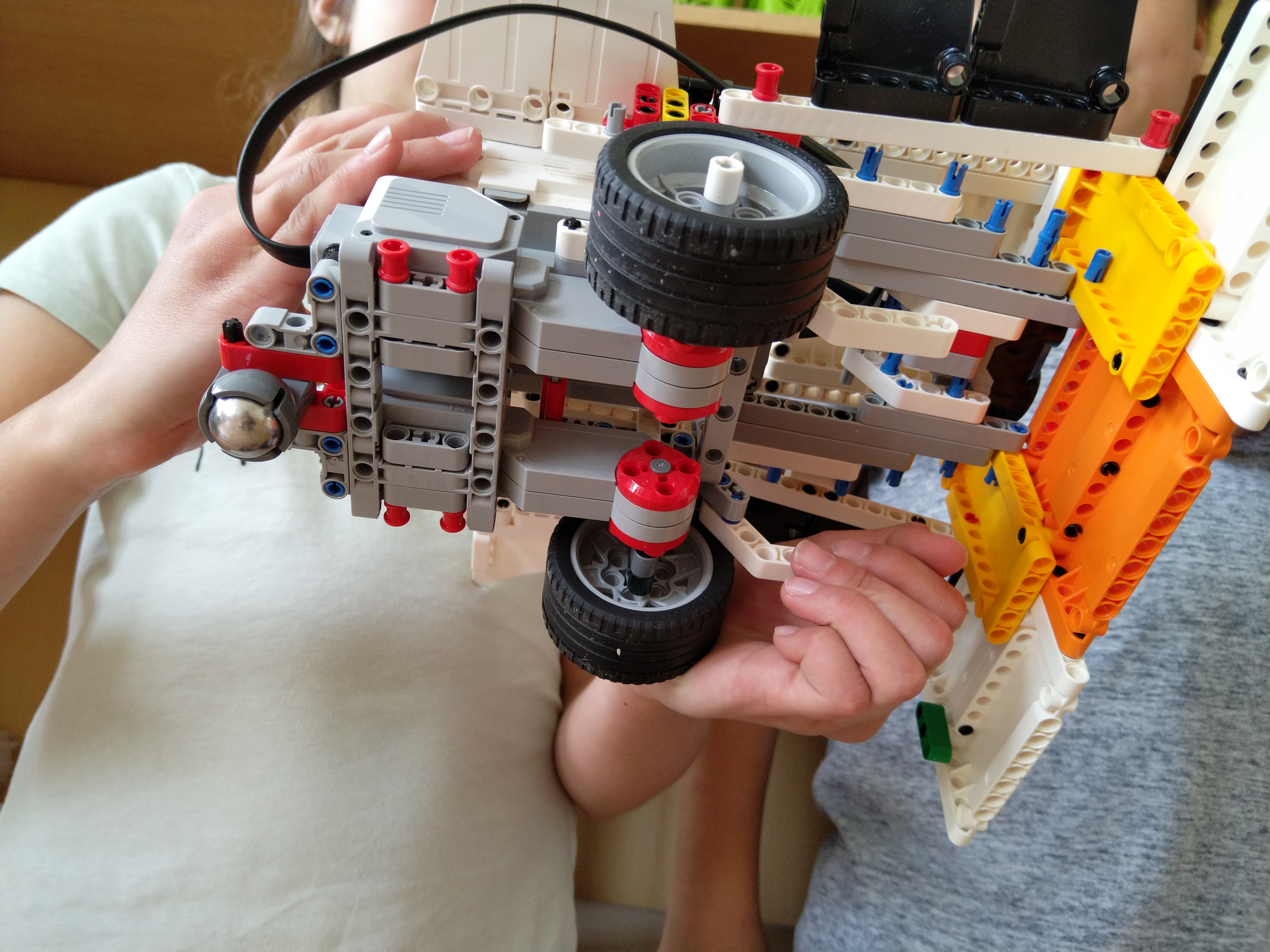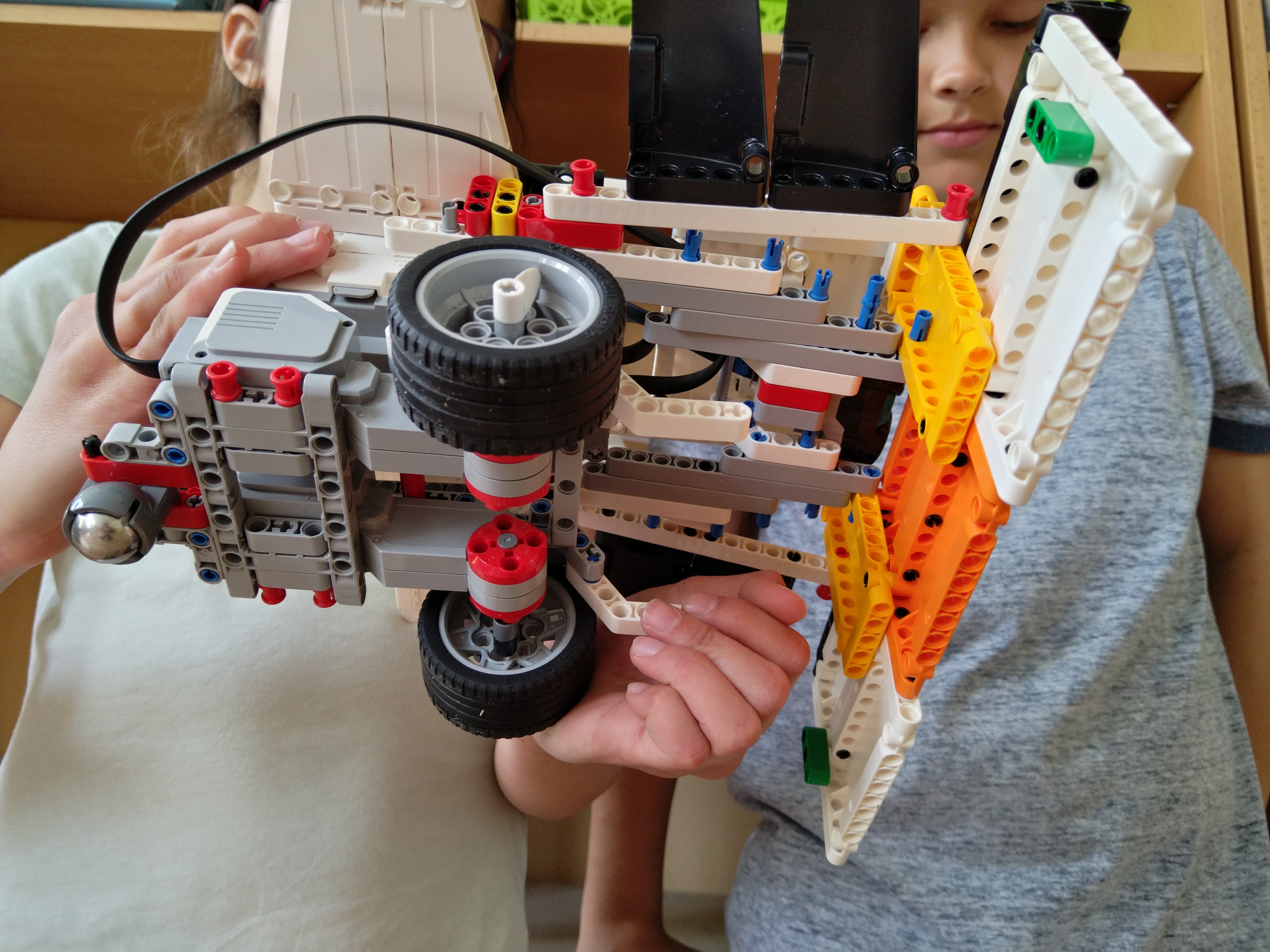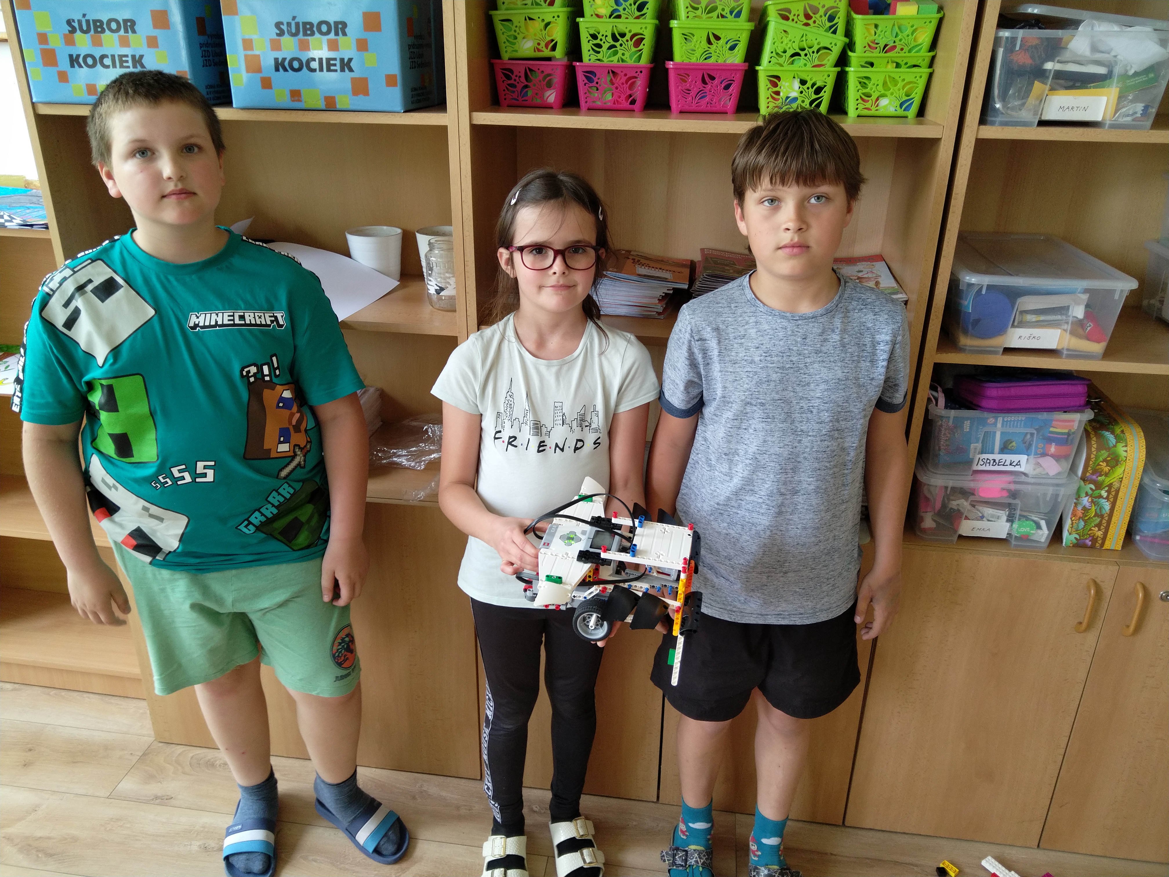 ProgramRobot musí ísť dopredu a dozadu. A medzitým bude búrať naše stavby. Medzitým ultrasonický senzor vidí kde sú tie stavby. A keď zbúra tu stavbu, tak cúvne dozadu a sa toči na tom mieste, dokedy nenájde nejakú stavbu.Stavba robota Náš robot sa skladá z ultrasonického senzora, z programovacej kocky, z dvoch veľkých motorov, má šesť krídel, dve kolesá a baranidlo (to vpredu).