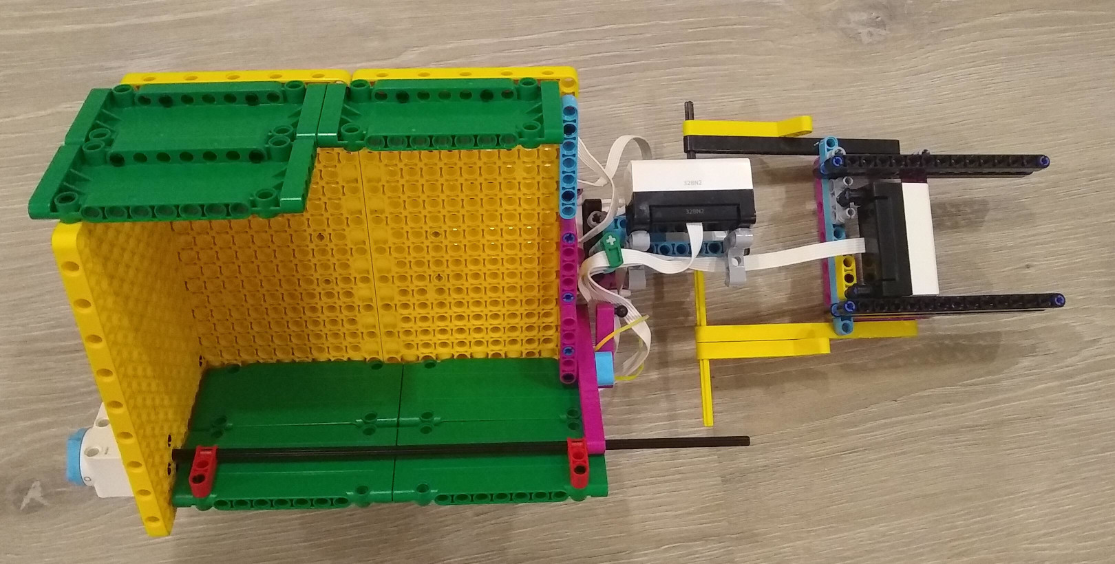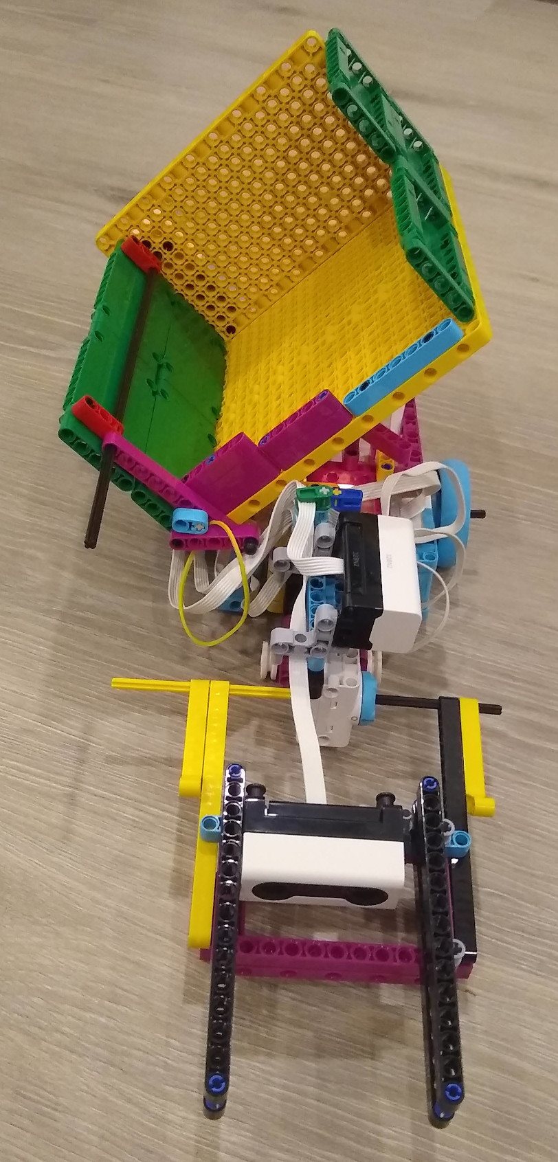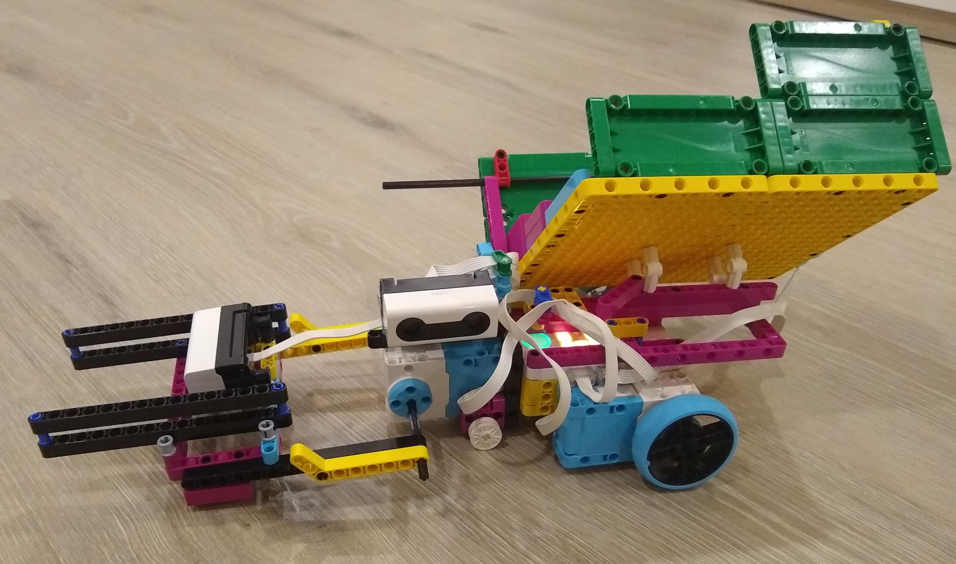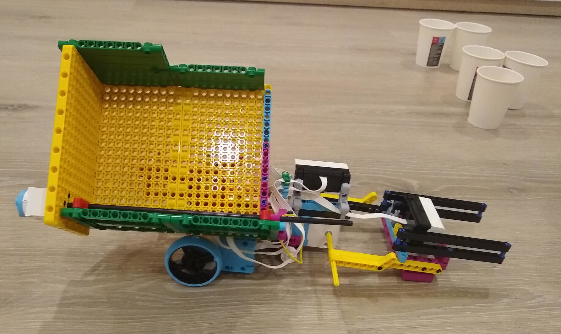 konštrukcia:Náš robot sa skladá z hlavnej kocky, štyroch motorov a dvoch ultrazvukových senzorov. Ďalej možno vidieť vidlicu, ktorou naberá poháre a odkladaciu nádobu, ktorá slúži na uskladnenie súčiastok, ktoré ,,vypije". Dva motory slúžia na poháňanie kolies, ďalší na vysypávanie zbernej nádoby a štvrtý na ovládanie vidly. Jeden ultrazvukový senzor je určený na hľadanie pohárov. Druhý neplní žiadnu funkciu.