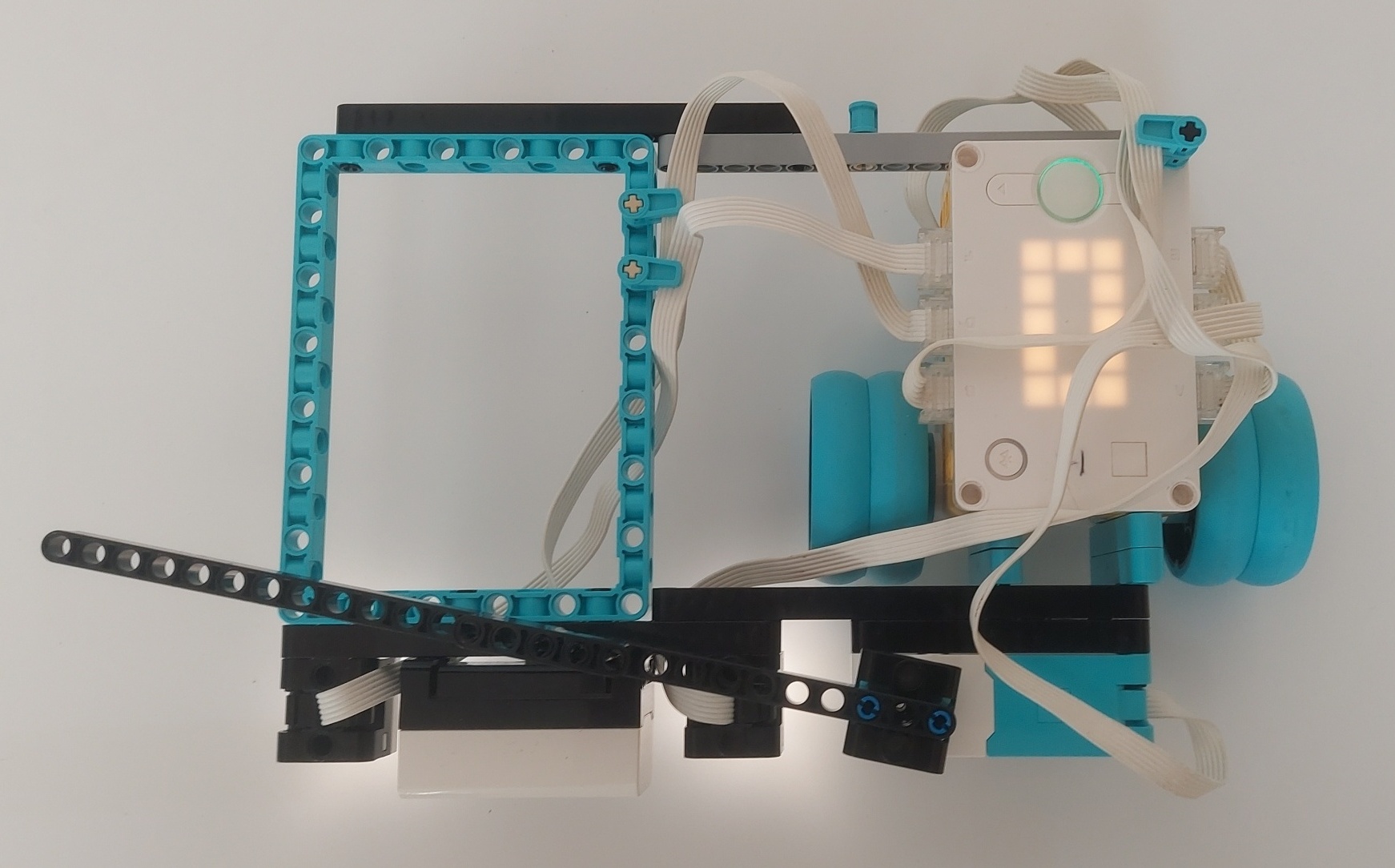 Snažil som sa naprogramovať pohyb tak, aby robot vyriešil križovatku v dráhe, keby bola dráha celá čierna, ale to sa mi nepodarilo (program č.1), tak som vložil do križovatky modrú kocku.