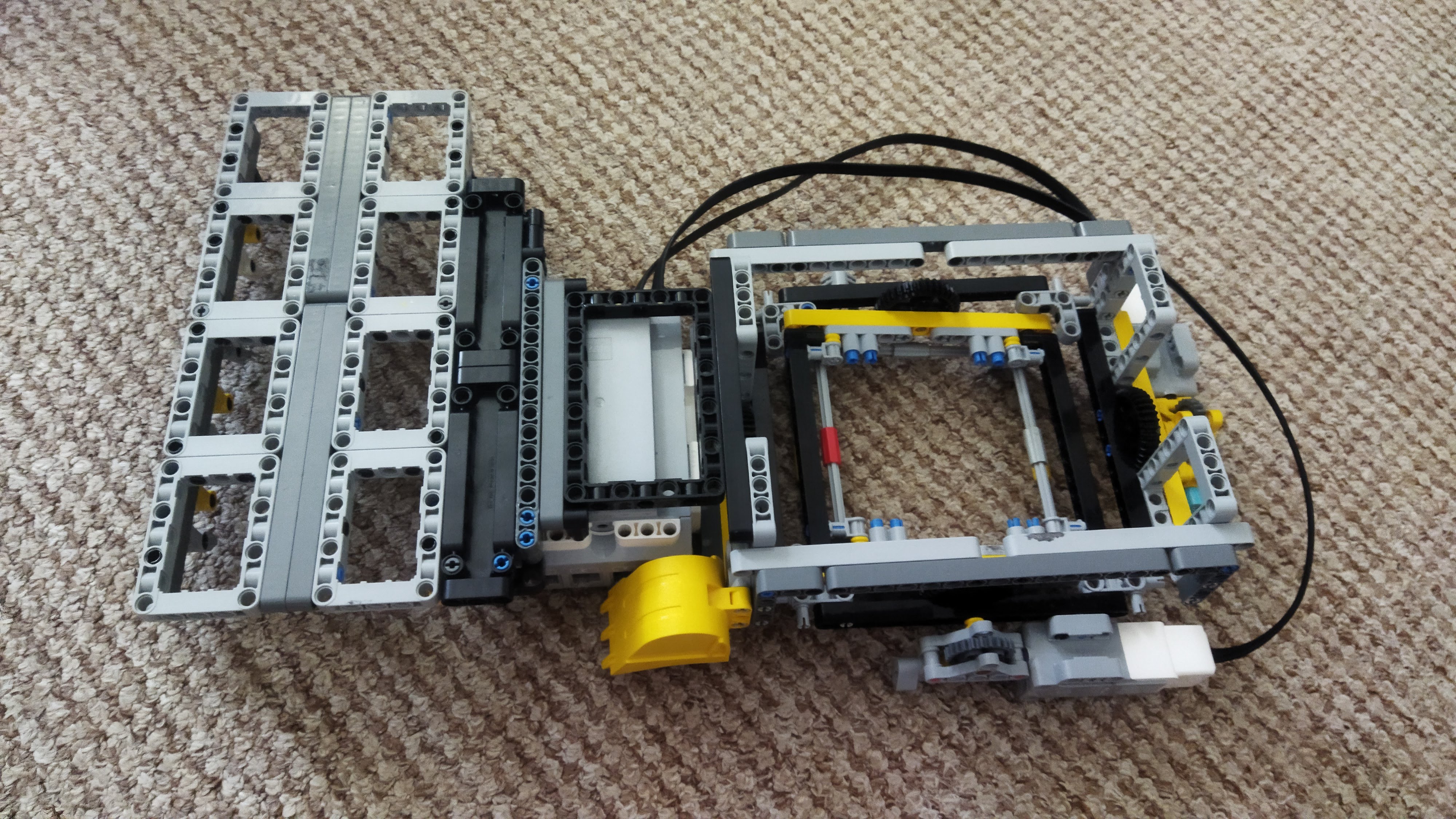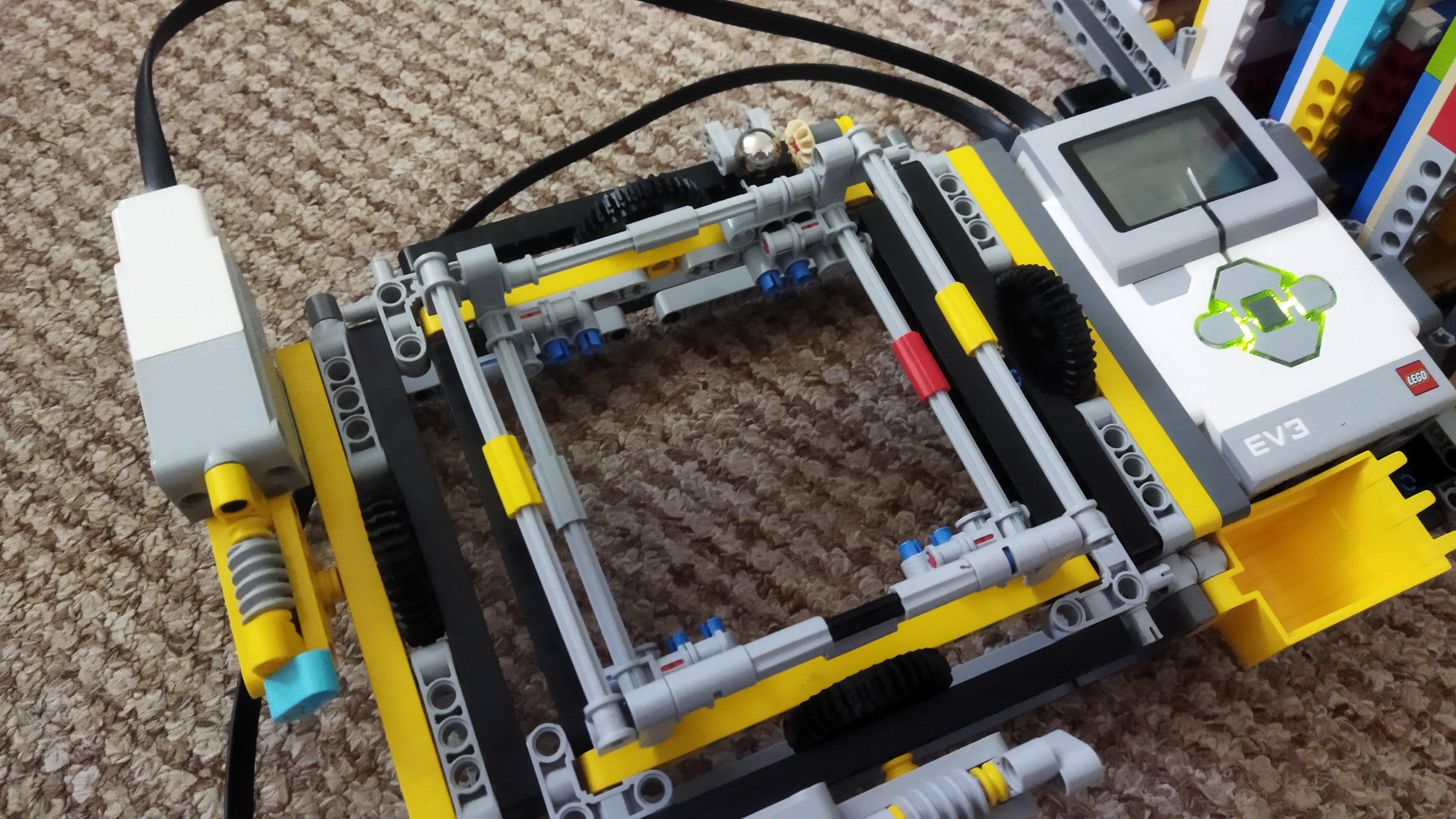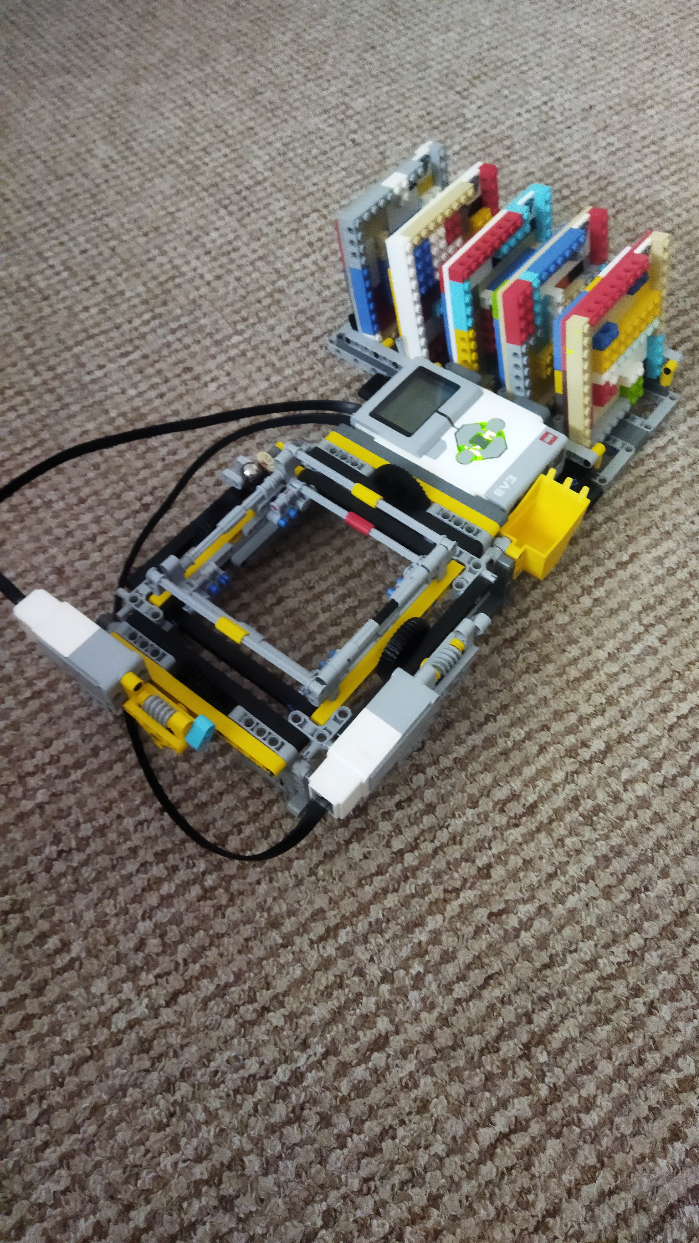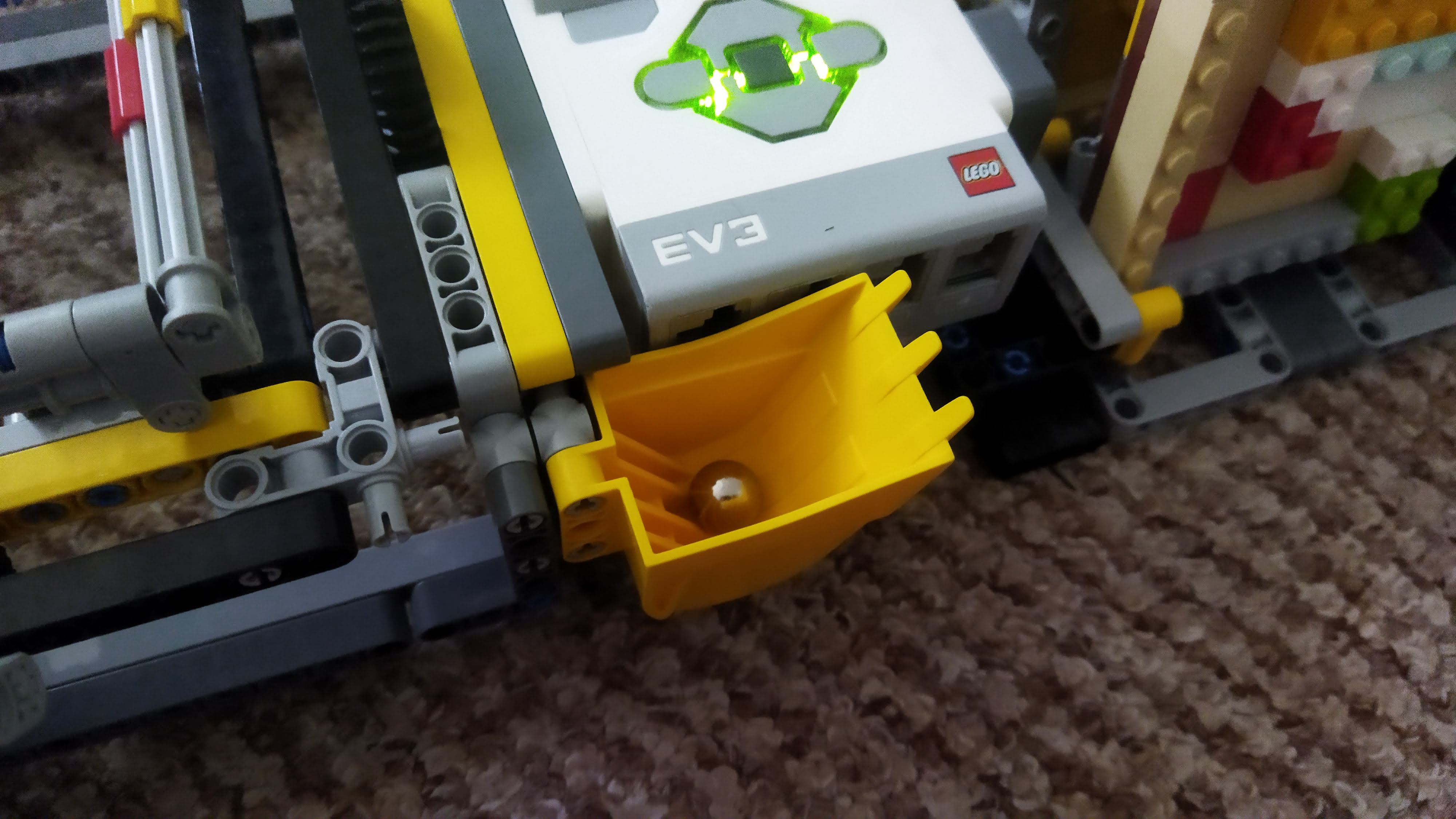 Na robotovi je držiak na bludisko, do ktorého sa bludisko vkladá. Držiak sa dokáže nakláňať do každej strany, pomocou dvoch motorov z ktorých každý ovláda inú os nakláňania. Tým pádom sa držiak dá nakloniť do akéhokoľvek smeru. Motory neotáčajú držiakom na bludisko priamo, otáčajú ním cez 24x spomalený špirálový prevod, kvôli väčšej presnosti otáčania. Na robotovi máme aj držiaky na všetkých päť bludísk a guličku, aby sme mali miesto, kam môžeme všetky bludiská a guličku odložiť.