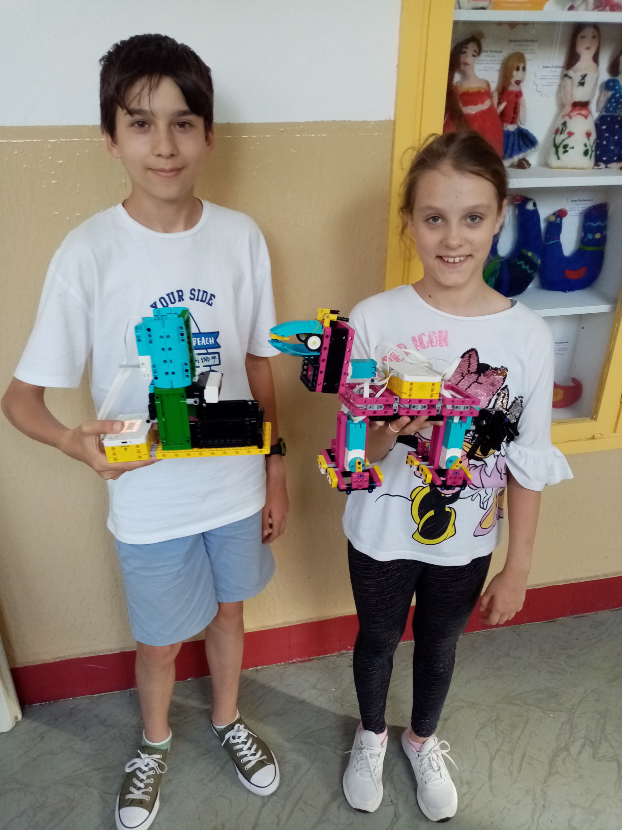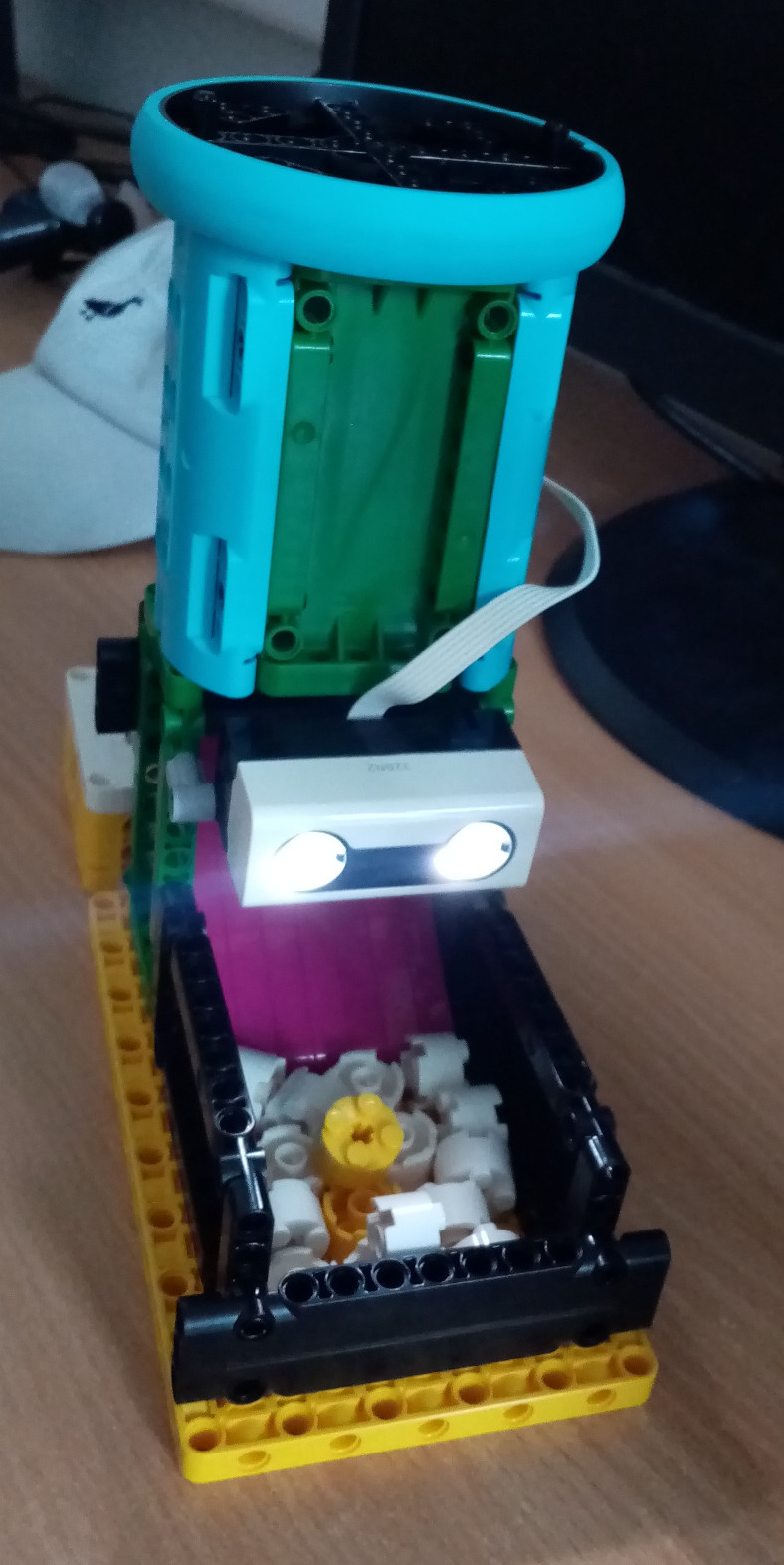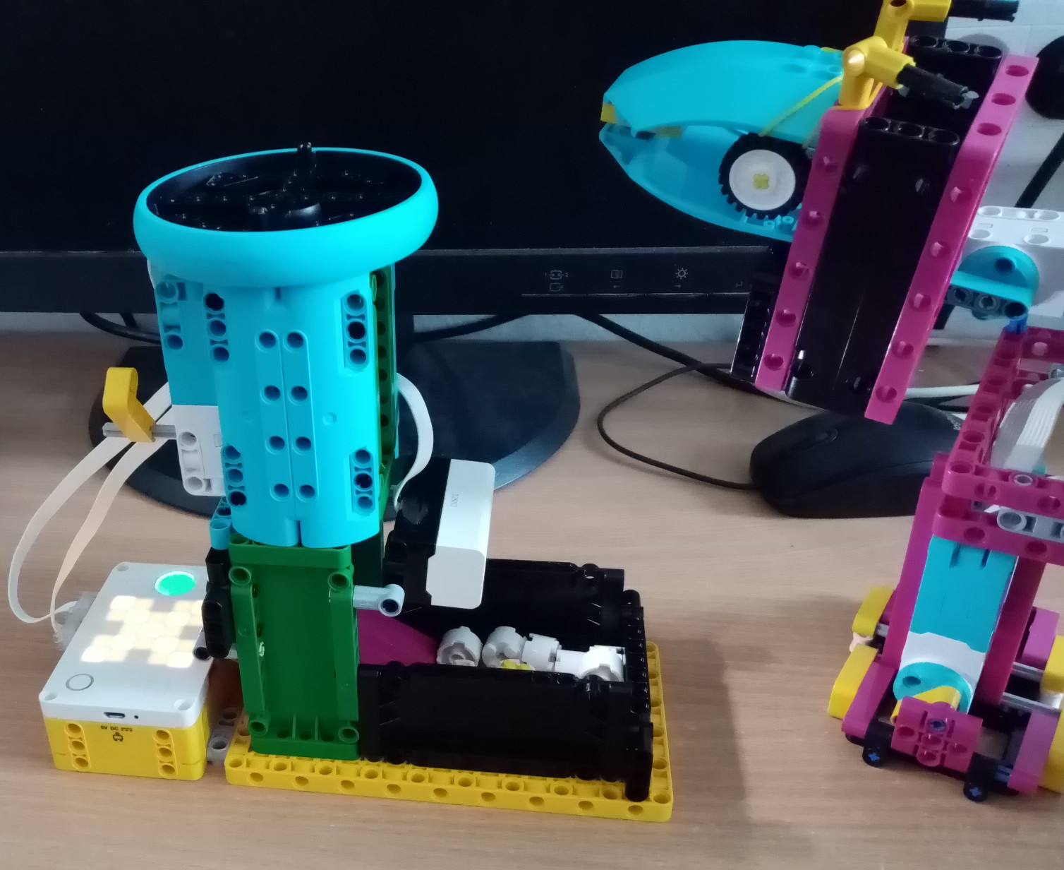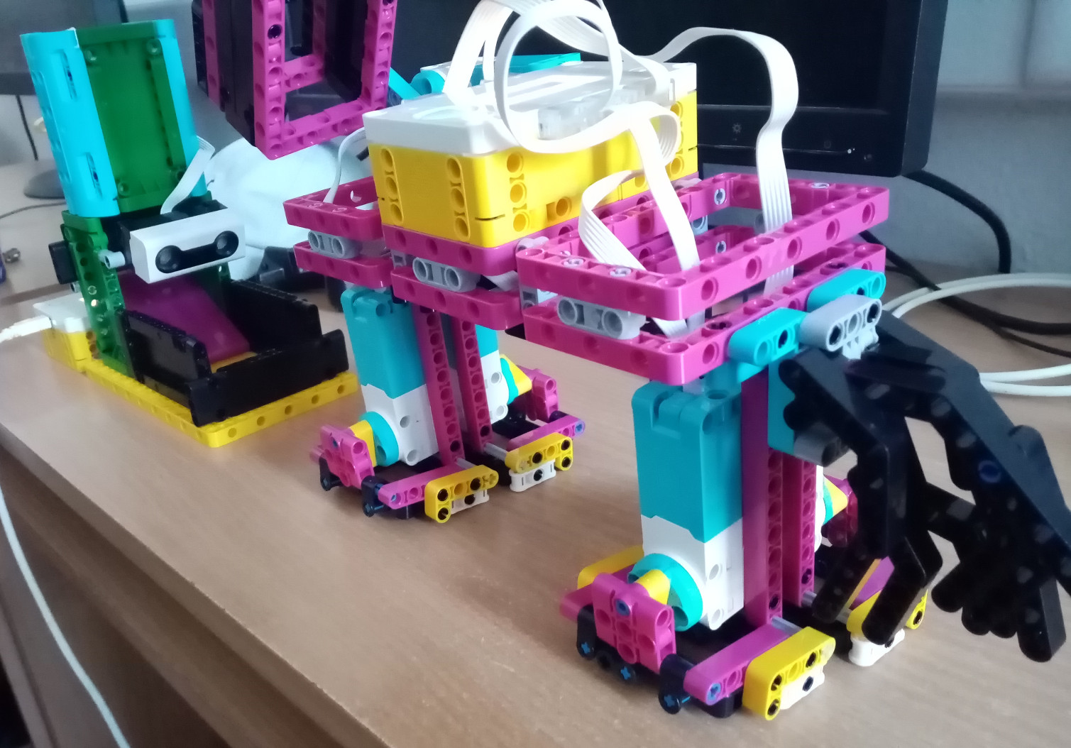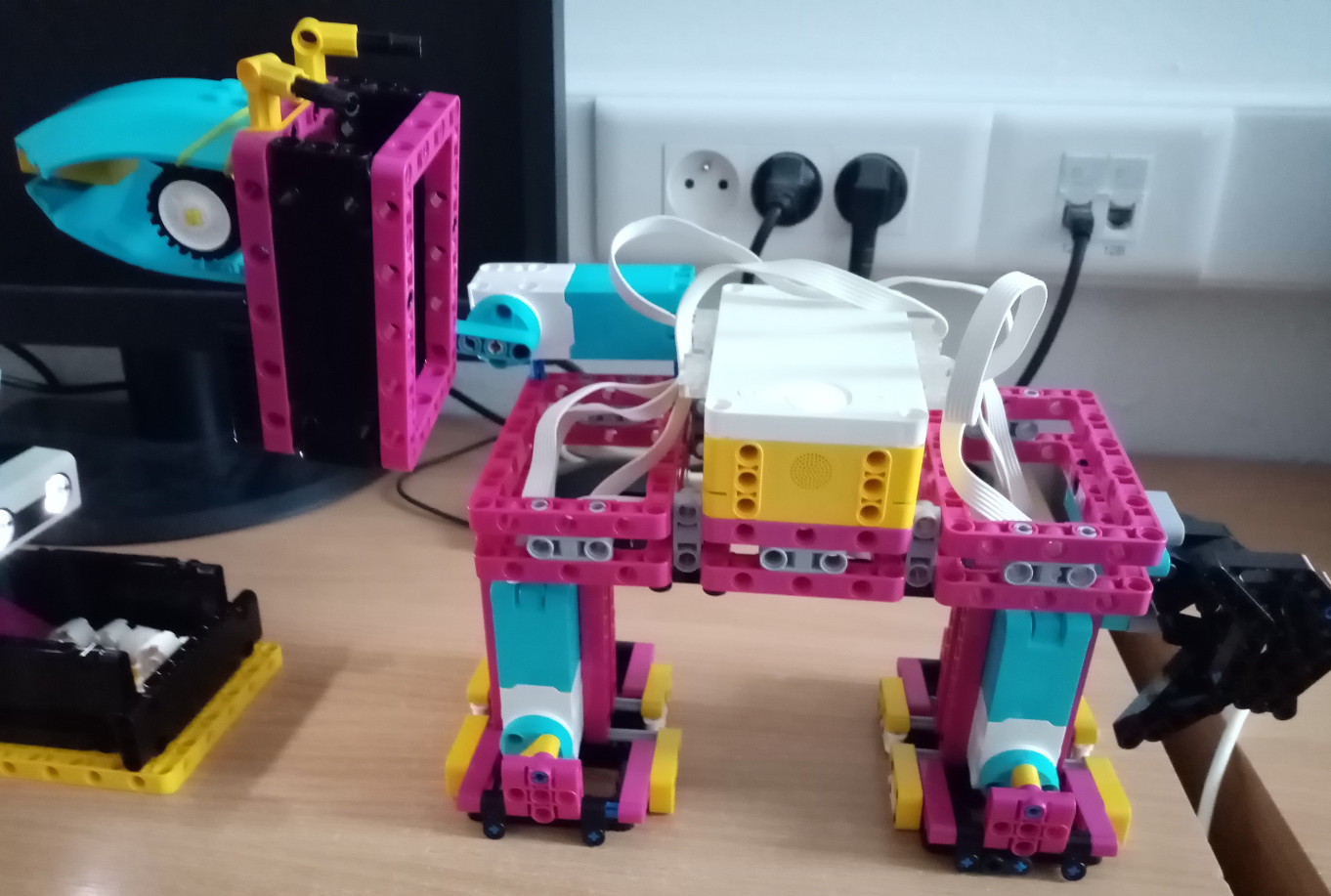 Spravili sme dávkovač krmiva a koníka. Program funguje takto: ultrazvukový senzor zistí prítomnosť koníka a na chvíľu potočí motorom (ktorý je napojený na vidlicu čím posúva krmivo) aby sa mu dostala dávka krmiva. Ak sa krmivo zasekne, motor sa otočí dopredu a dozadu, aby sa krmivo odblokovalo. Dávkovač krmiva sa skladá zo základnej kocky, ultrazvukového senzoru a motora. Koník sa skladá z piatich motorov a základnej kocky. Motory na pohyb koníka fungujú na princípe piestov.