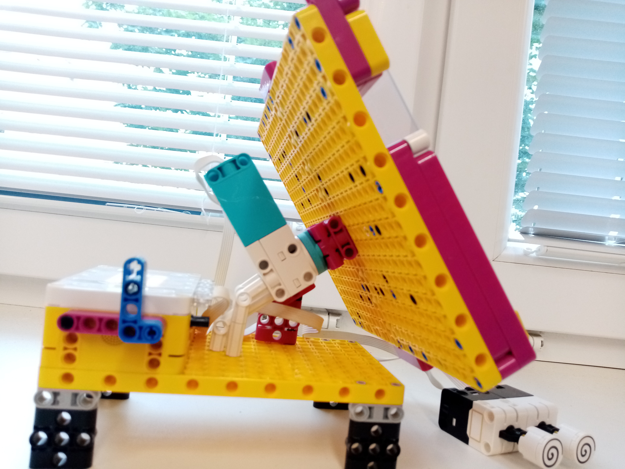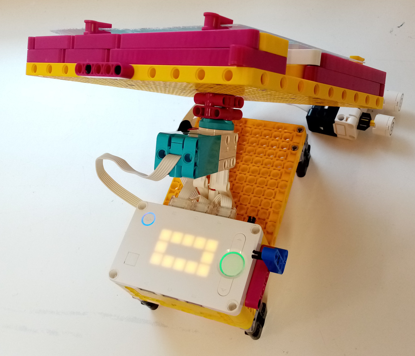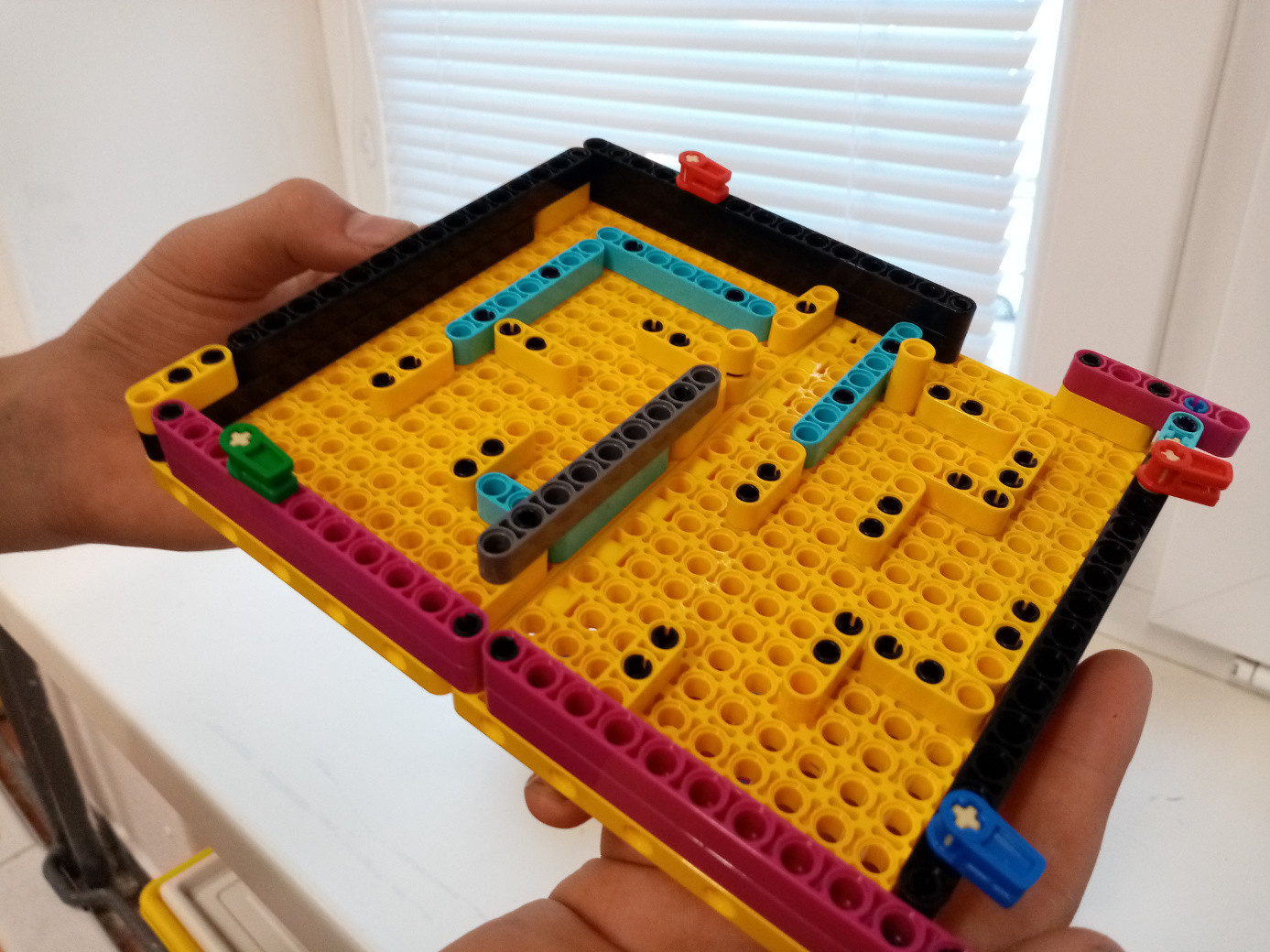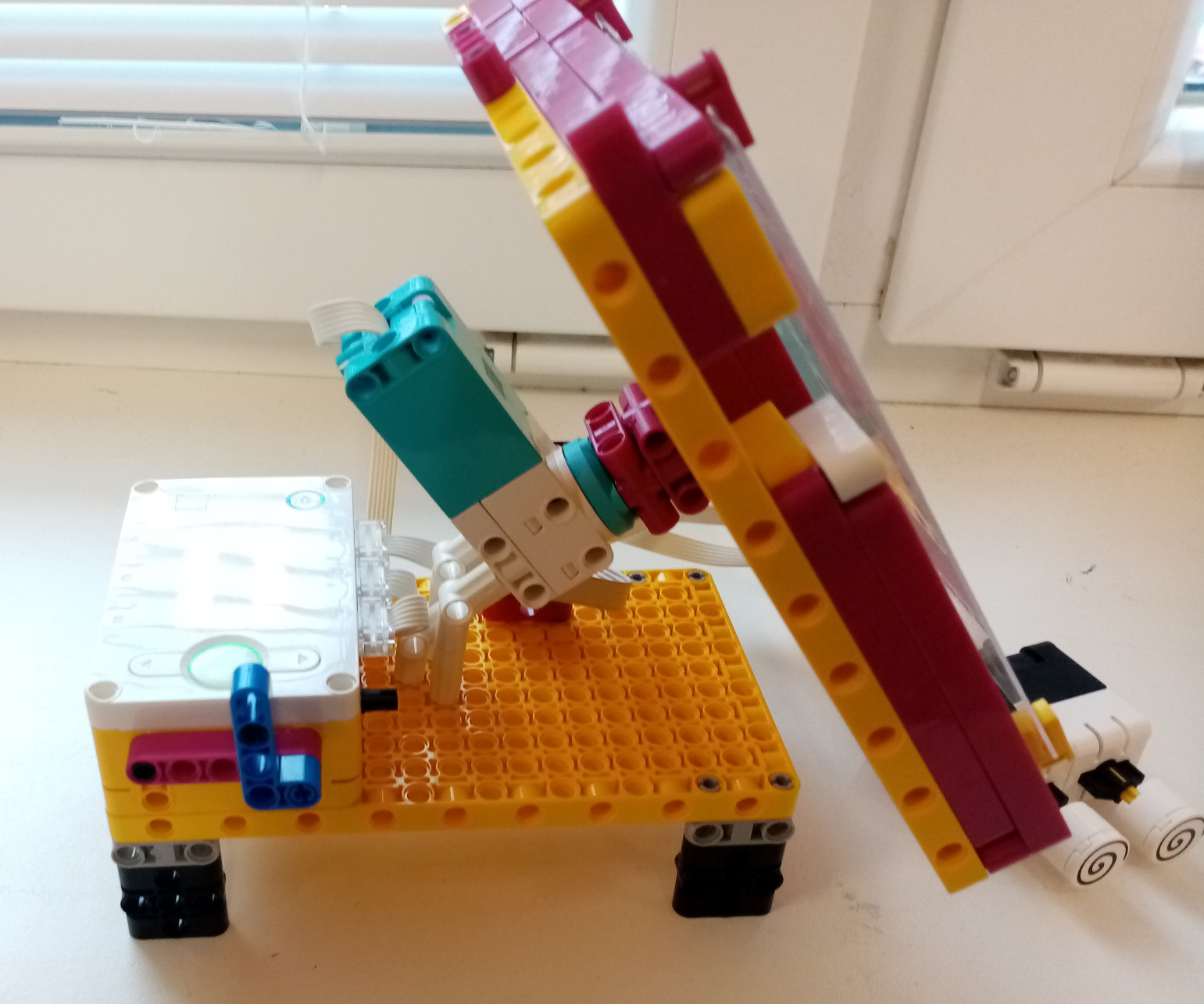 KONŠTRUKCIA:Náš robot sa skladá z hlavnej kocky, jedného otáčkového motora, dvoch dotykových senzorov a ostatných súčiastok. Motor je požívaný na otáčanie bludiska, dotykové senzory využívame na riadenie otáčania.