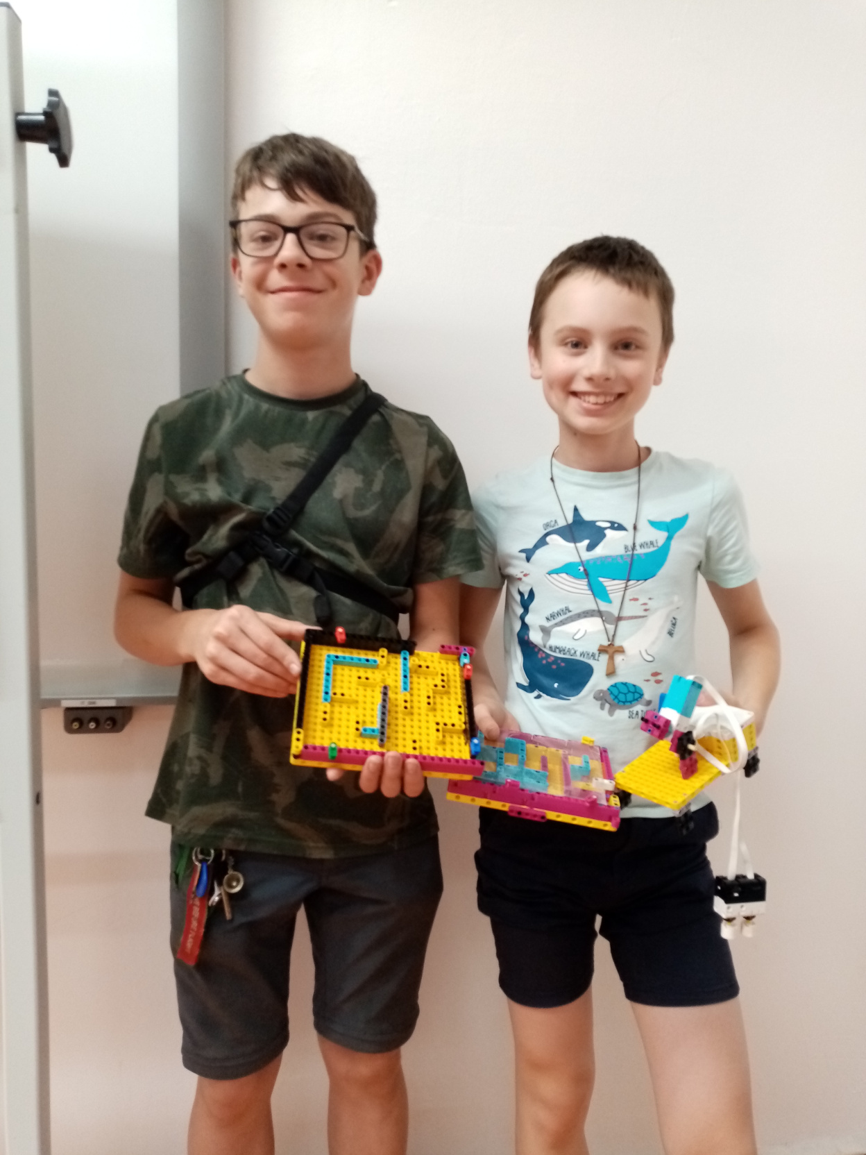 1. Mašina funguje a zostrojili ste pekné bludiská. Vynašli ste sa, zdá sa, že aj takýmto jednoduchým spôsobom sa dá väčšina bludísk vyriešiť. 2. Fiha, to mi teda nenapadlo, že by na to stačil jeden jediný motorček, to ste ma fakt prekvapili. A aj bludiská máte super. 3. Za úlohu Guľôčkové bludisko získavate 3b. Zostrojili ste zaujímavé riešenie úlohy. 4. Super nápad s tým sklom, resp. plastom, čo ste tam primontovali. Potom sa veru stačilo otáčať len do dvoch strán. Kreatívne! Dokonca ste mali rôzne bludiská navrhnuté. Všetko natočili, nemám čo vytknúť. Len, pekné prázdniny majte a zapojte sa aj o rok :)