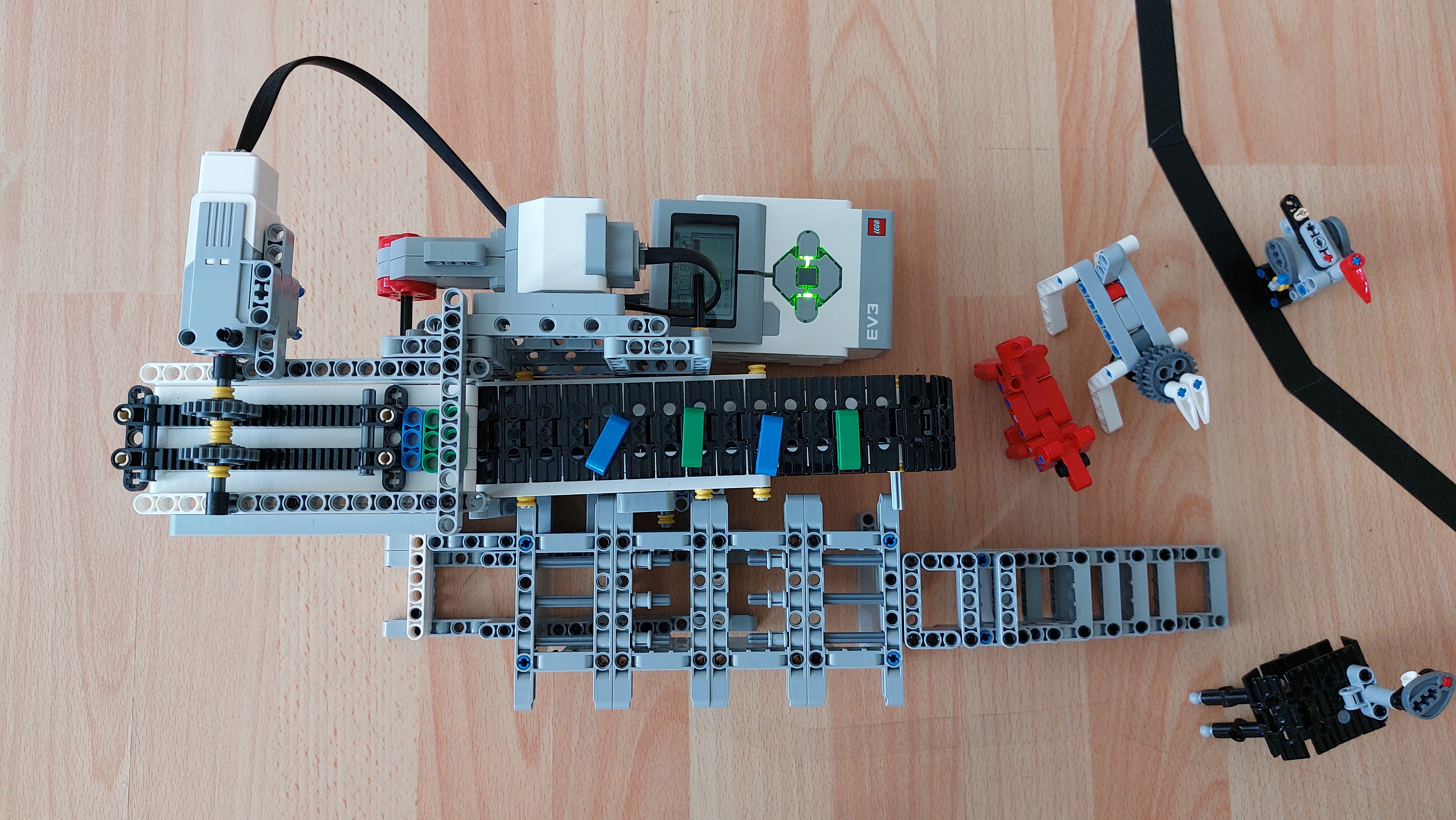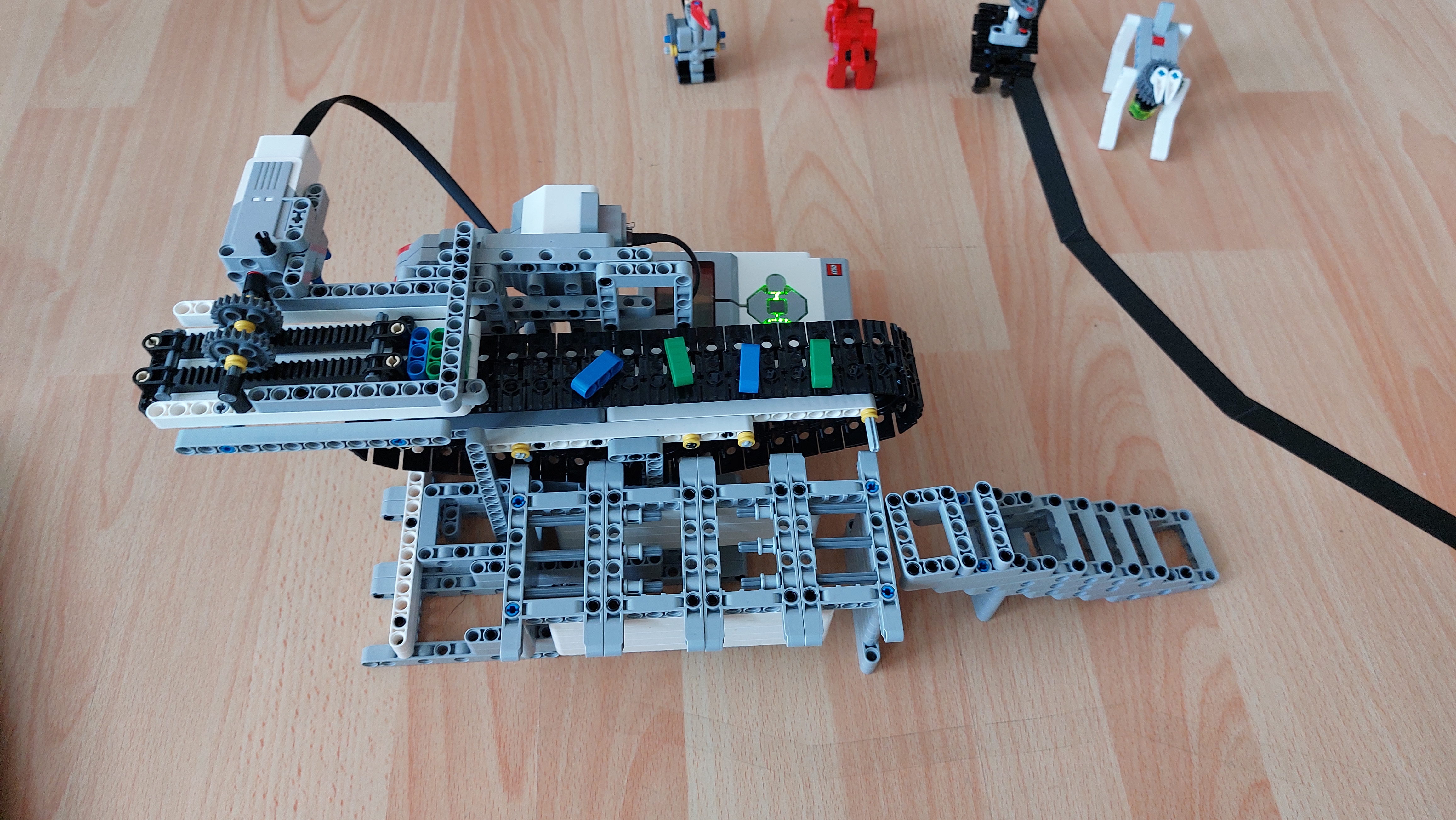Robot sa skladá z dopravníkového pása pripojeného k motoru, dávkovača potravi pripojeného k malému motoru, priestoru pre zvieratá odkiiaľ sa kŕmia a schodíkov, ktorími sa zvieratá dostanú do priestoru kŕmenia. Z lego kociek sme taktiež postavili zvieratá.