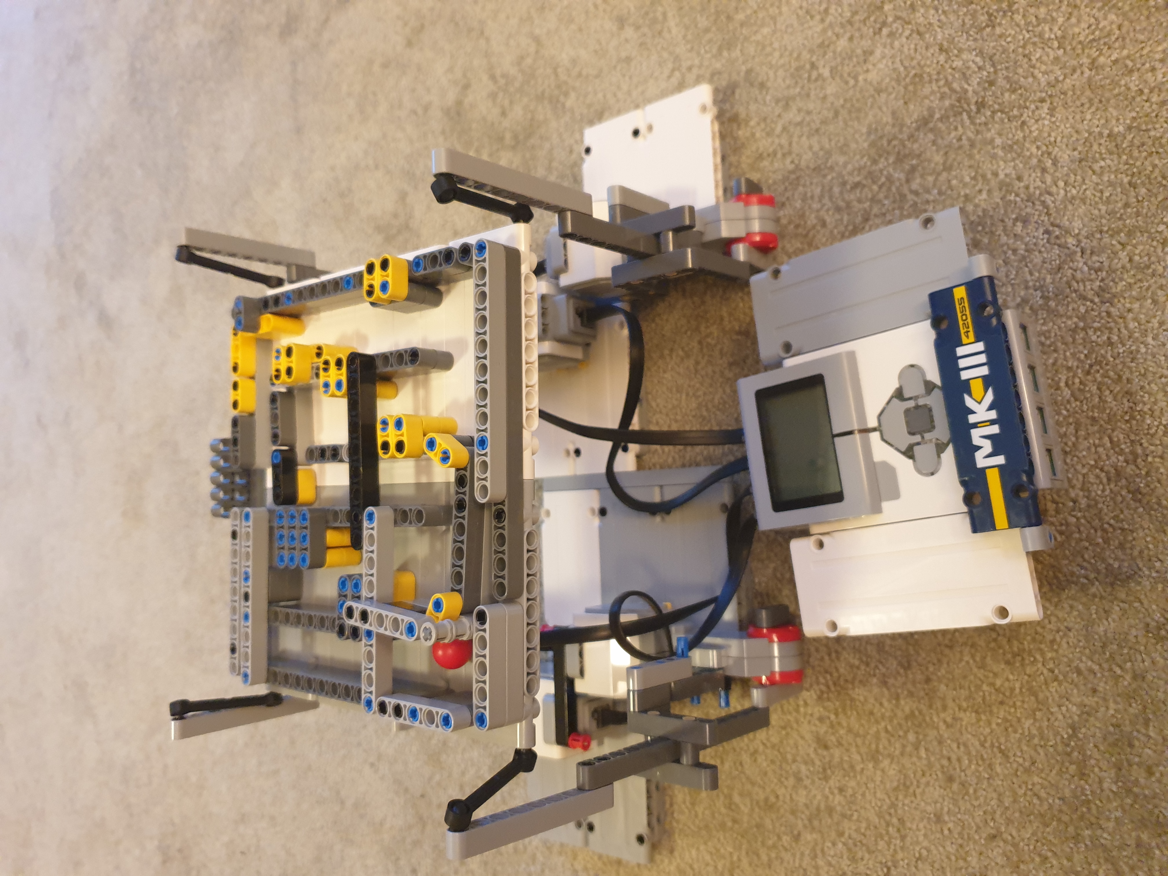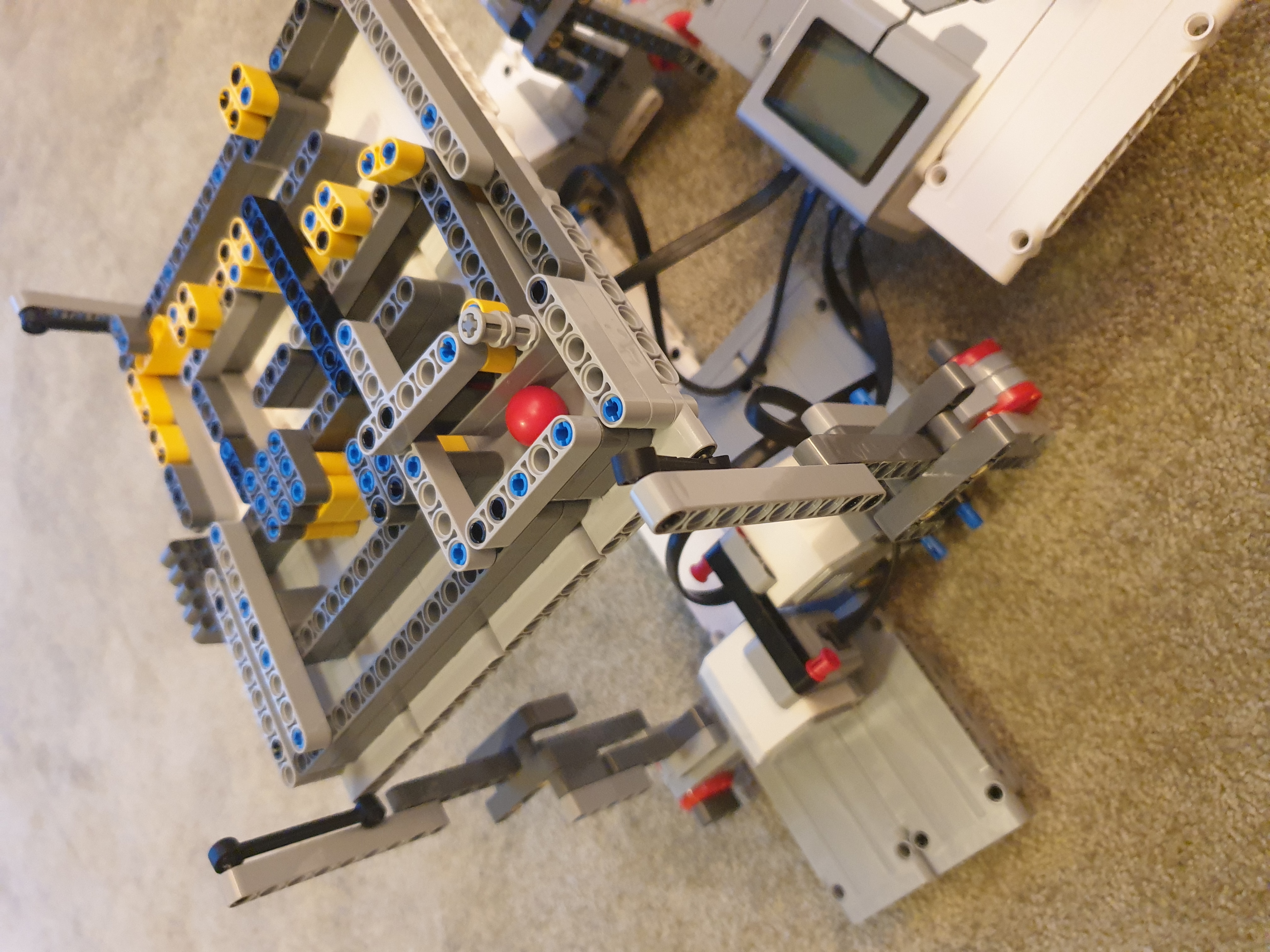 Naše MK3 bludisko sa skladá z 4 veľkých motorov a jednej EV3 kocky. Po spustení programu robot začne otáčať motormi a nakláňaním plochy do rôznych smerov vyblúdi bludisko. Na konci sa nachádza malá priehradka pre vyblúdenú guličku. Keď sme si vybrali úlohu bludisko, najprv sme postavili dosku s labyrintom. Potom sme začali riešiť ako dosiahnúť nakláňanie bludiska. Prvé riešenie sa nepodarilo, lebo ramená na motorch boli príliš prátke a bludisko sa málo nakláňalo. Na druhý pokus sme predĺžili ramená a bludisko sa začalo nakláňať dostatočne. Do programu sme dali bloky s otáčaním jednotlivých motorov aby ich nakláňanie vyblúdilo guličku.