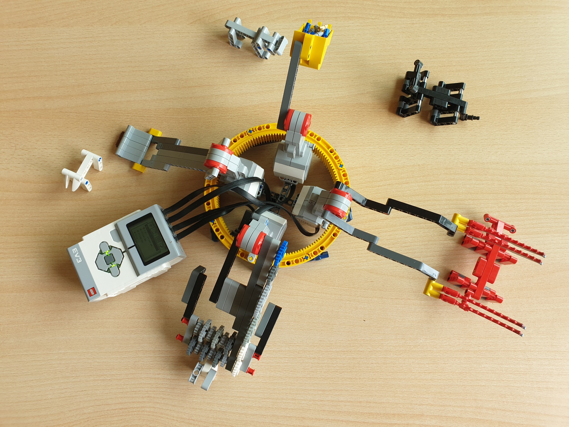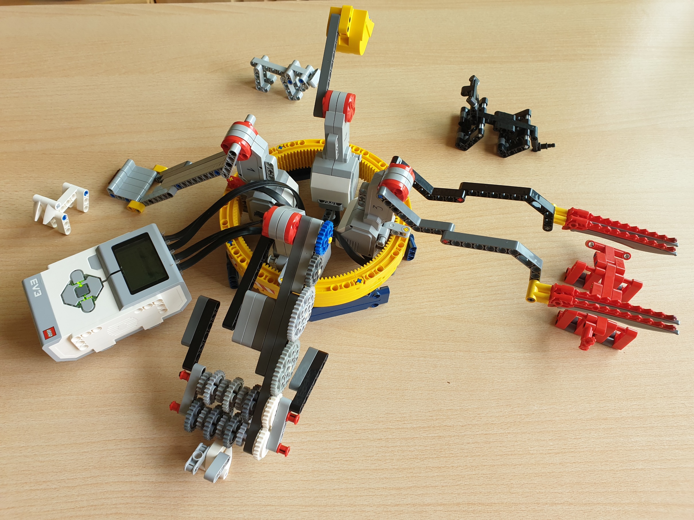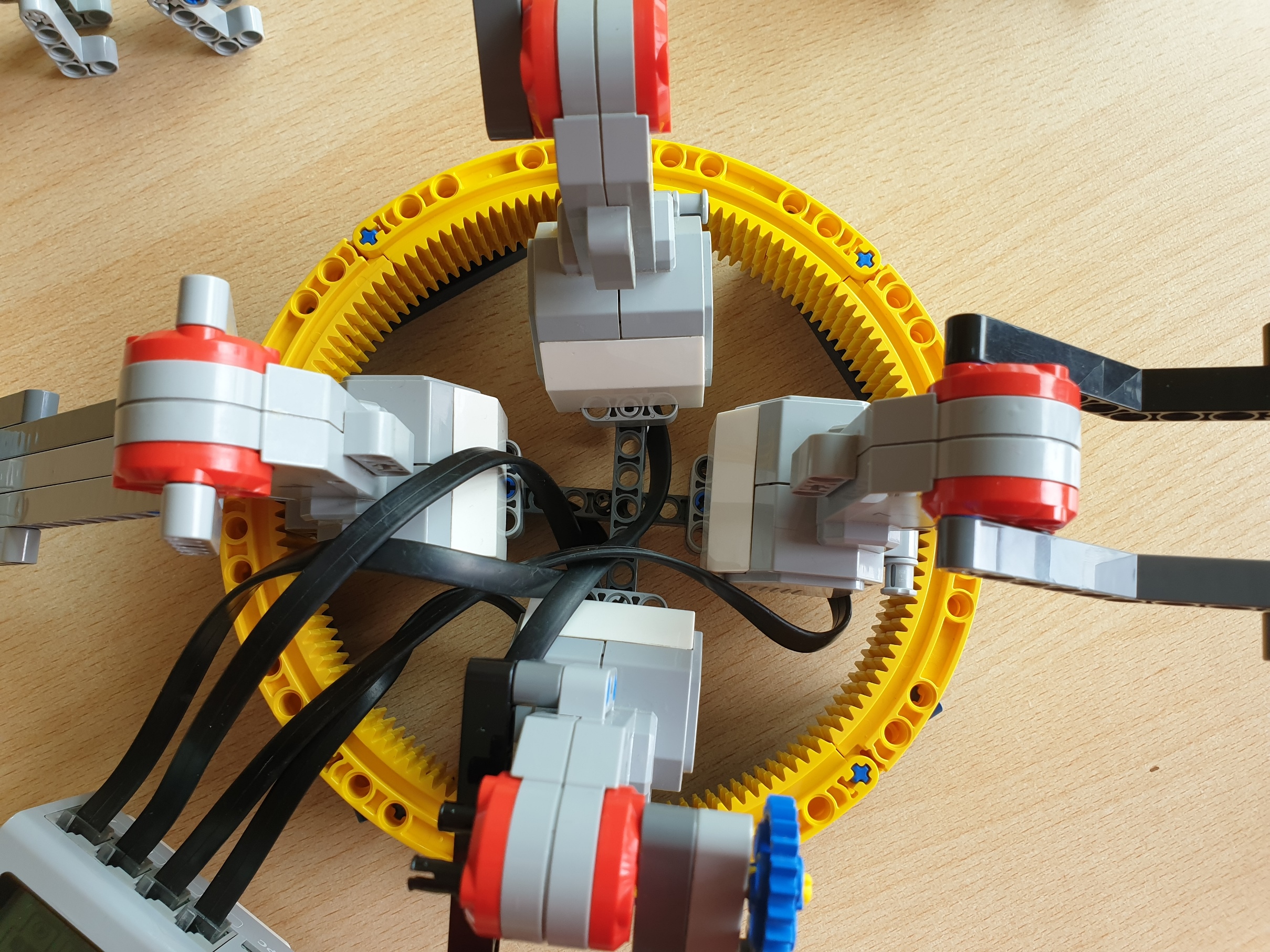 Náš hospodársky robot sa skladá zo 4 veľkých motorov a jednej EV3 kocky (a veľa ďalších kociek).