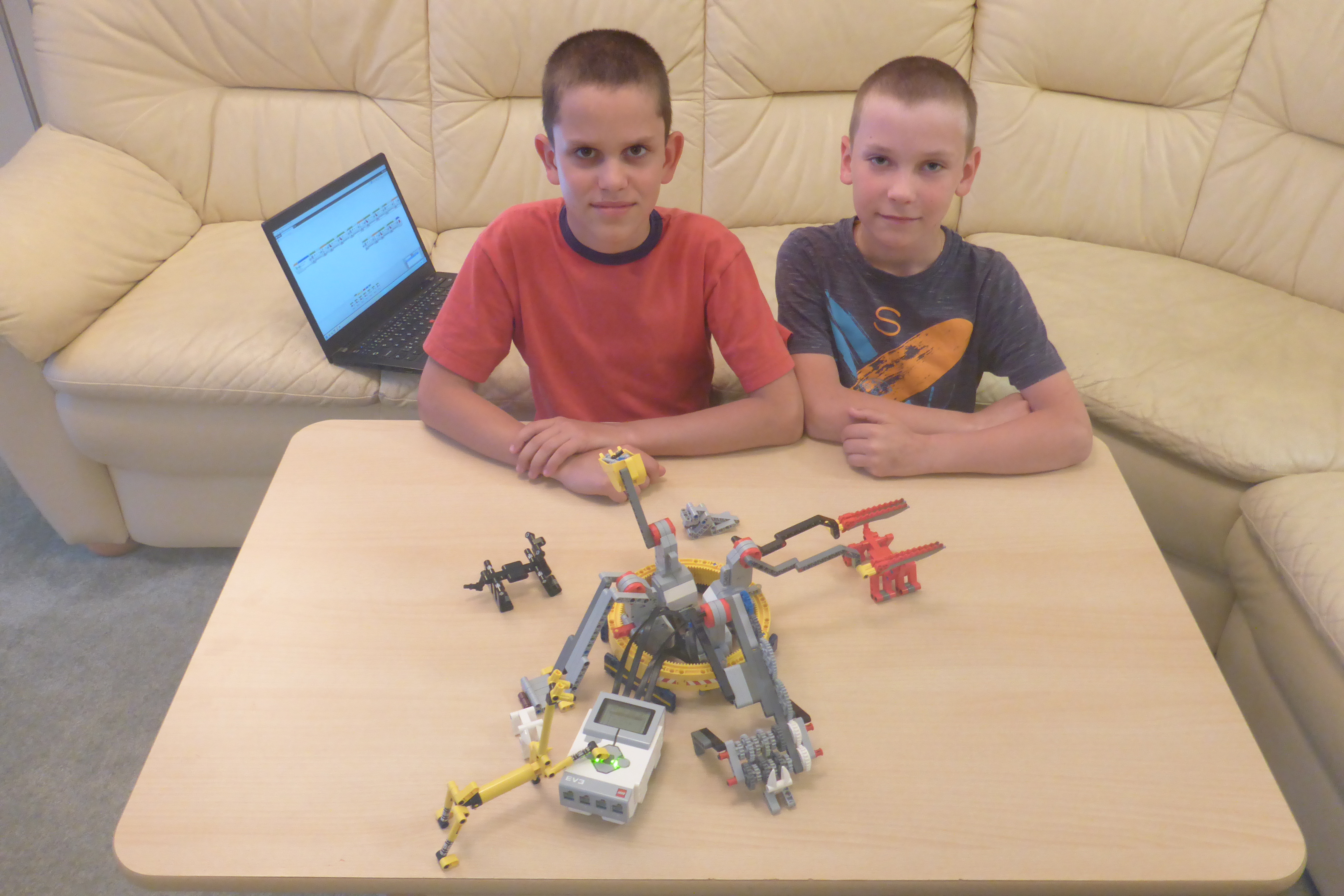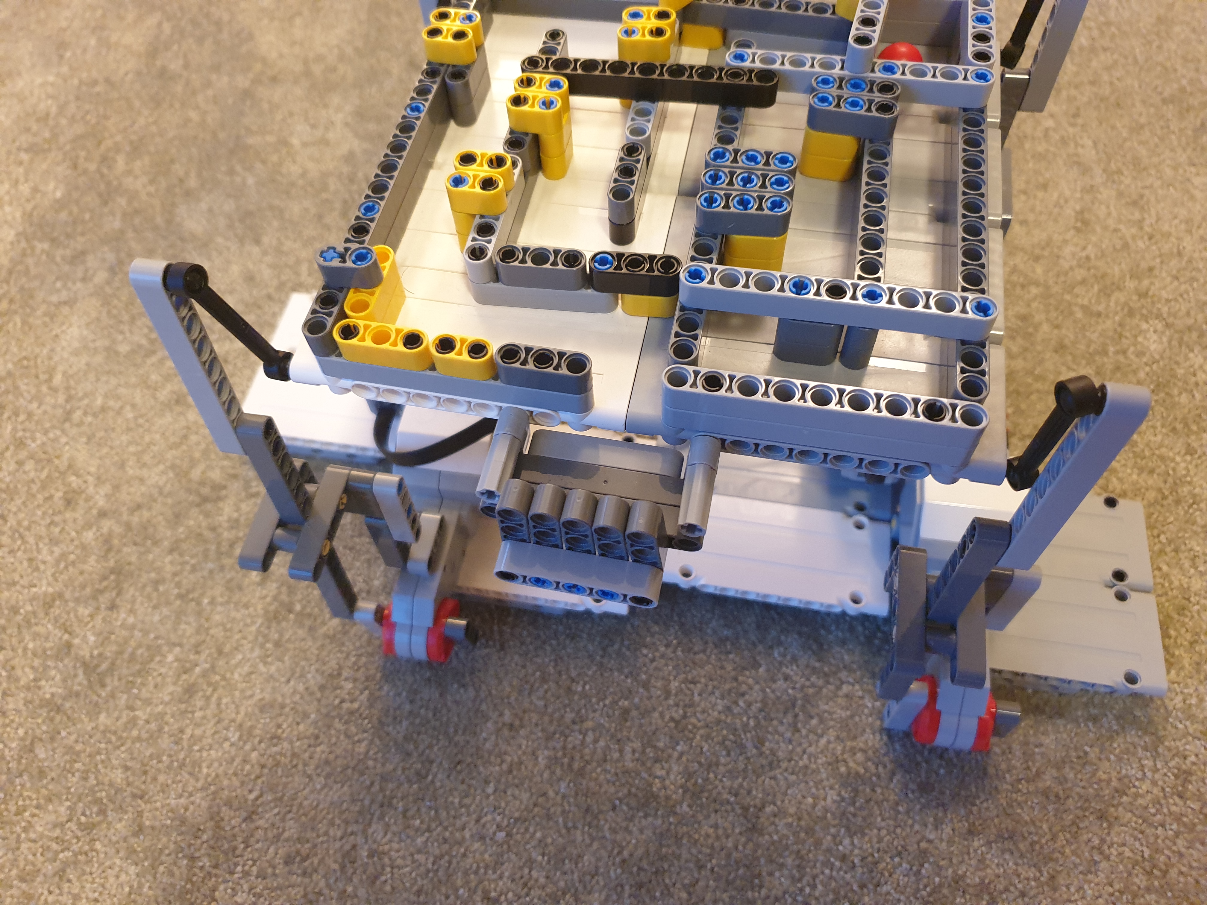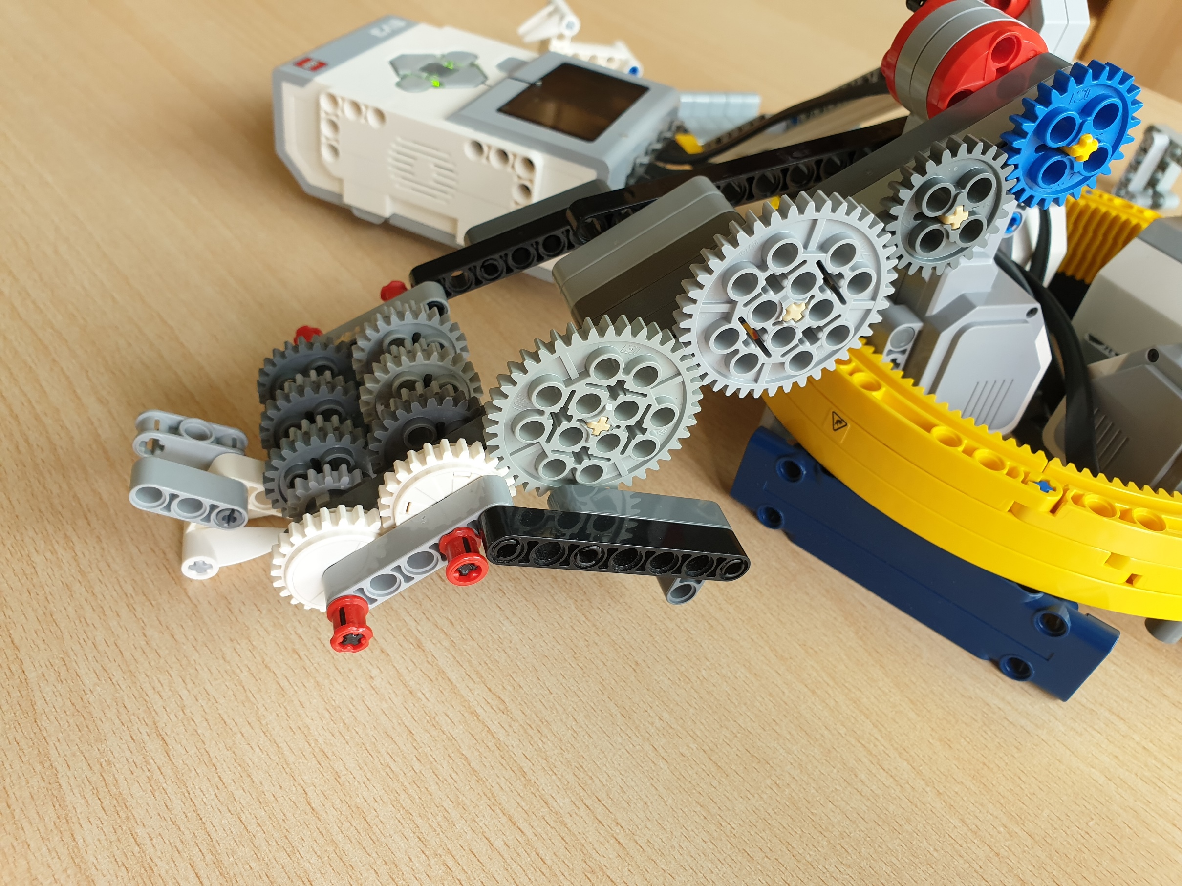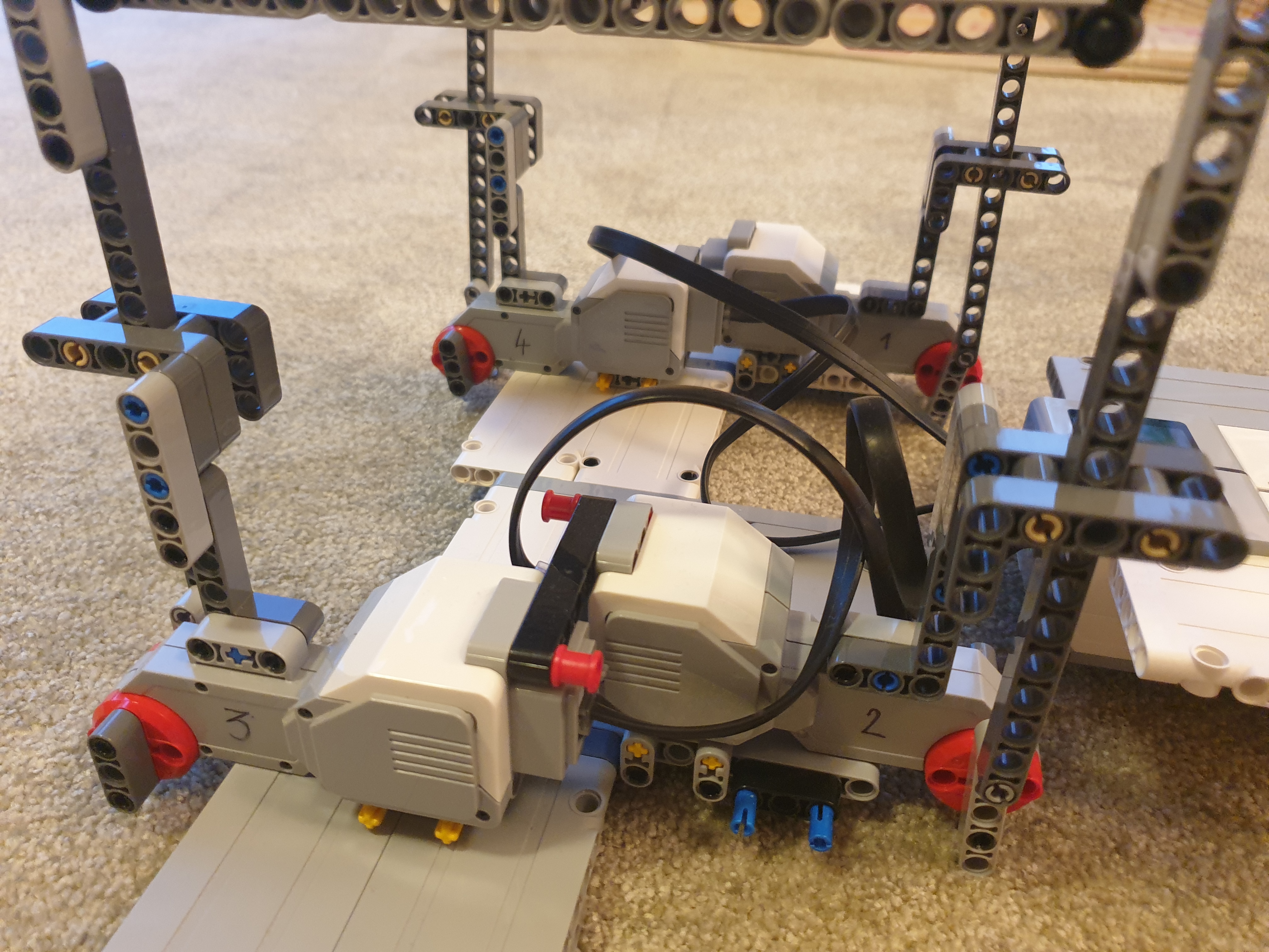 Náš hospodársky robot sa skladá zo 4 veľkých motorov a jednej EV3 kocky (a veľa ďalších kociek).