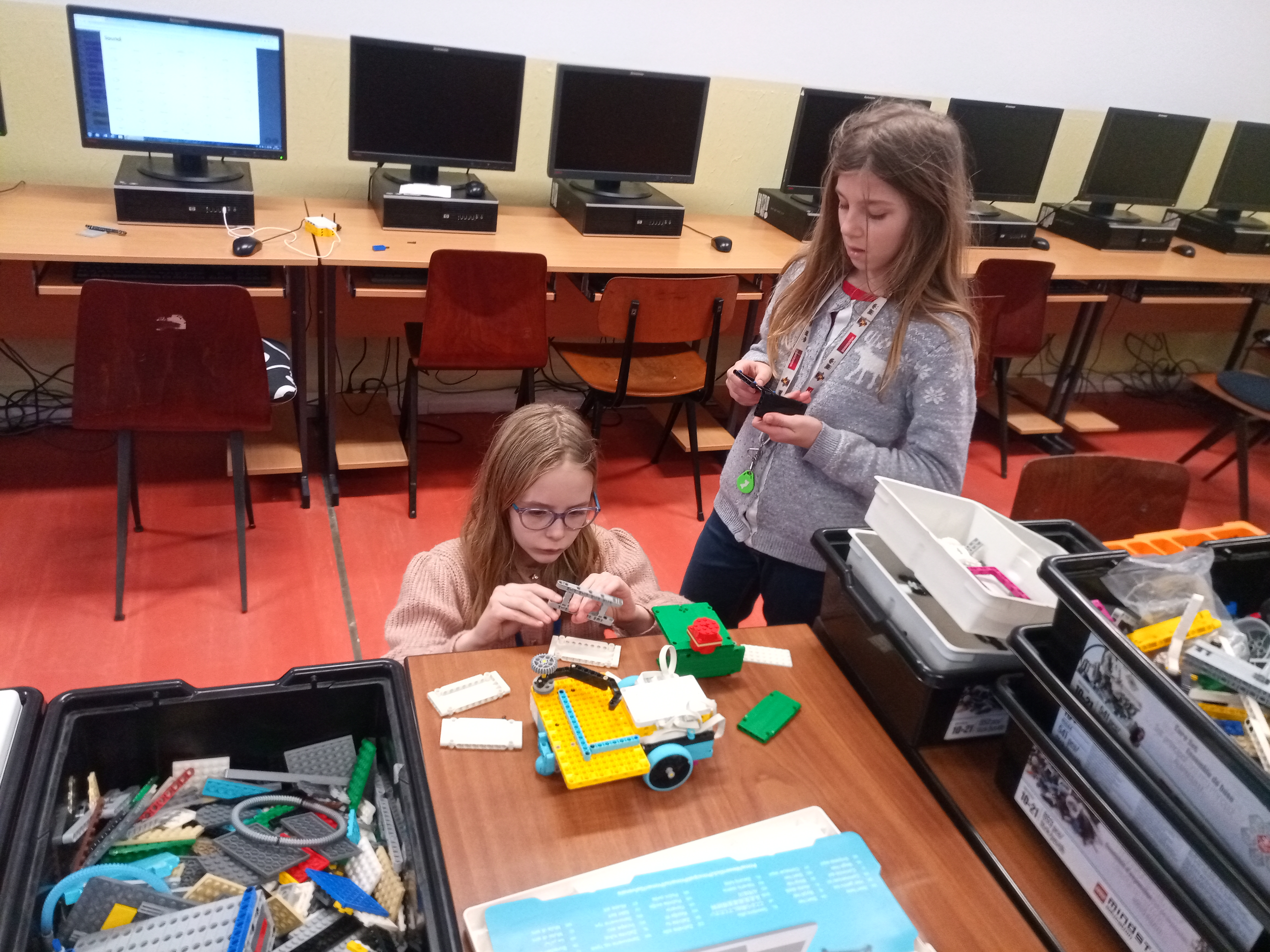 Náš robot sa skladá z kocky SPIKE. Má dva motory na hýbanie s veľkými modrými kolesami a opiera sa o bielu guličku. ešte má motor na hýbanie nakladacím ramenom a ešte jeden motor dolu, ktorý sme nakoniec ale nepoužili a ostal len ako záloha, ak by sme potrebovali doplniť ďaľšie rameno. Robot má ešte nakladaciu plochu, z ktorej dokáže vykladať, aj nakladať. Robot má dolu senzor, aby vedel chodiť po čiare a ešte jeden senzor, aby rozoznal farbu regálu. s tým bol trochu problém, lebo bielu, šedú a bledomodrú pri teste rozoznával dobre, ale pri jazdení skoro vždy domotal a išel na zelenú, alebo čiernu. Keď už sme nechápali, čo sa deje, tak sme ho nechali vypisovať akú farbu videl.