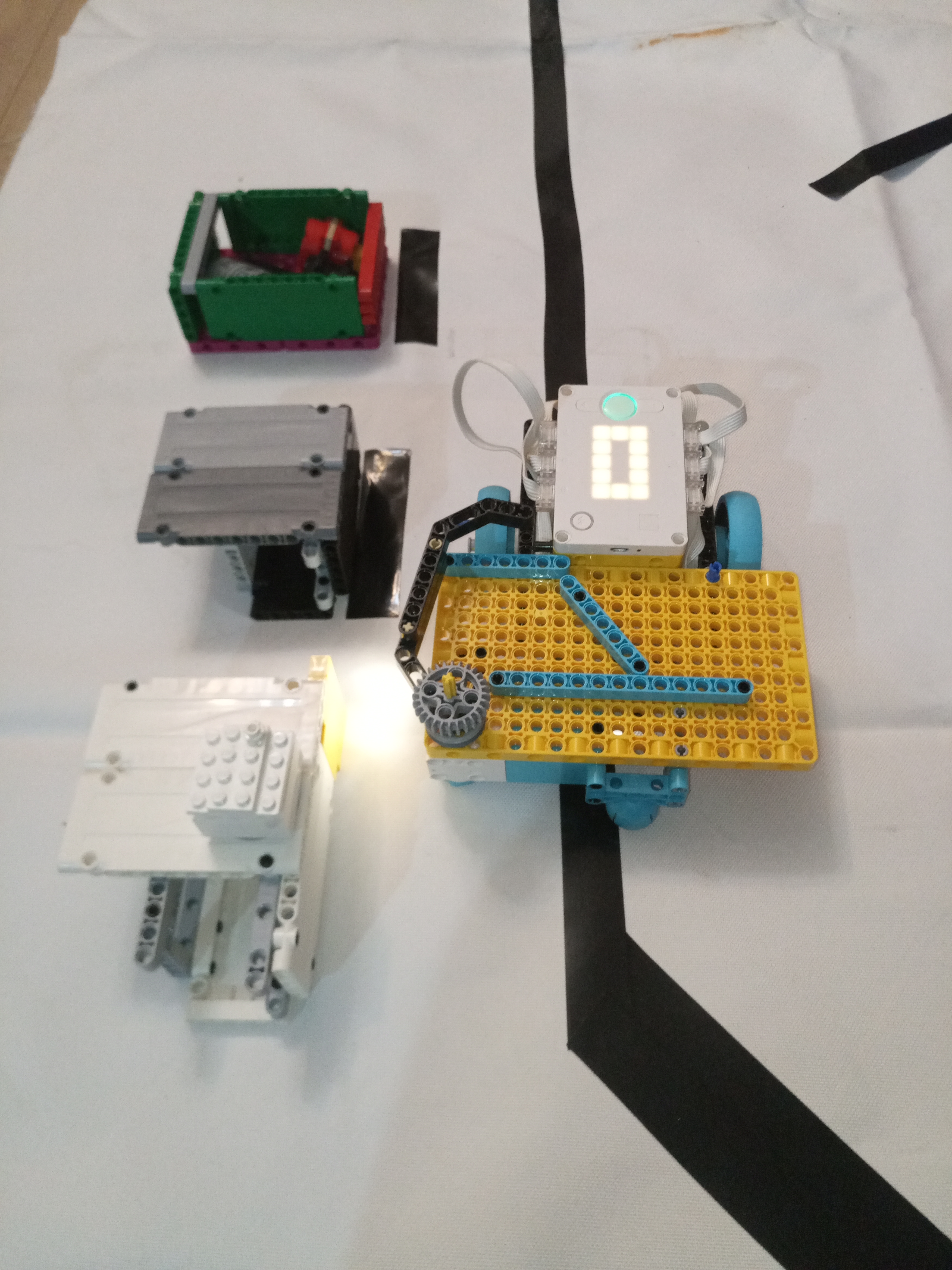 Nakoniec sme postavili bedničku s červenou stranou na vrátenie obalov, zelený stôl na jablká, biely (so žltým pásom) na mlieko a čiernu na chlieb. A ešte červenú značku (stlpik), že už je robot doma. Aby sme ukázali, že náš robot si vie poradiť, urobili sme mu zákrutu aj v obchode. A aby bolo jasné, že vie priniesť, po čo ho pošleme, tak sme ho poslali postupne na tretiu poličku na prvú a na záver na prostrednú. (robotovi na poradí nezáleží. ide podľa farby.)