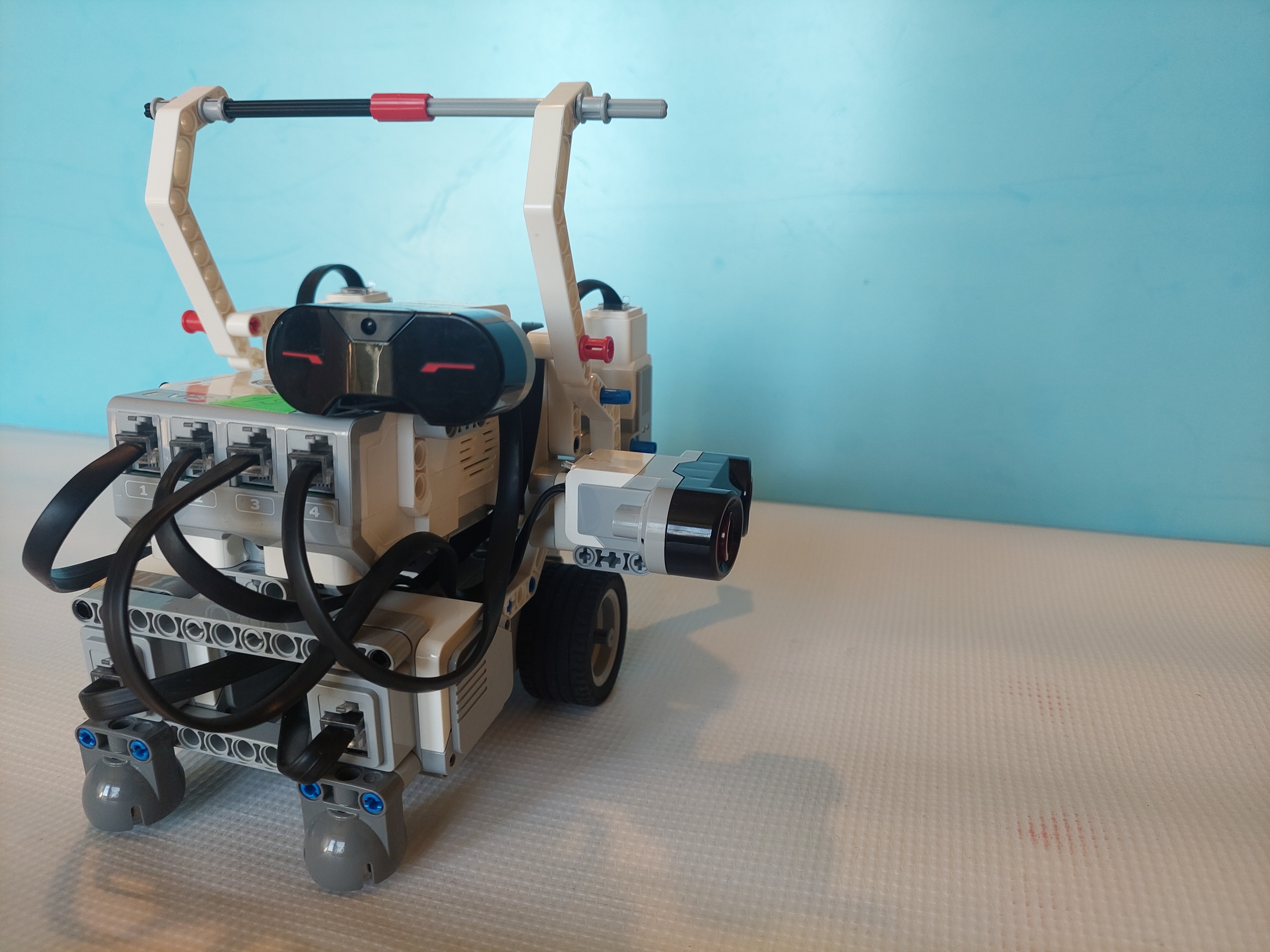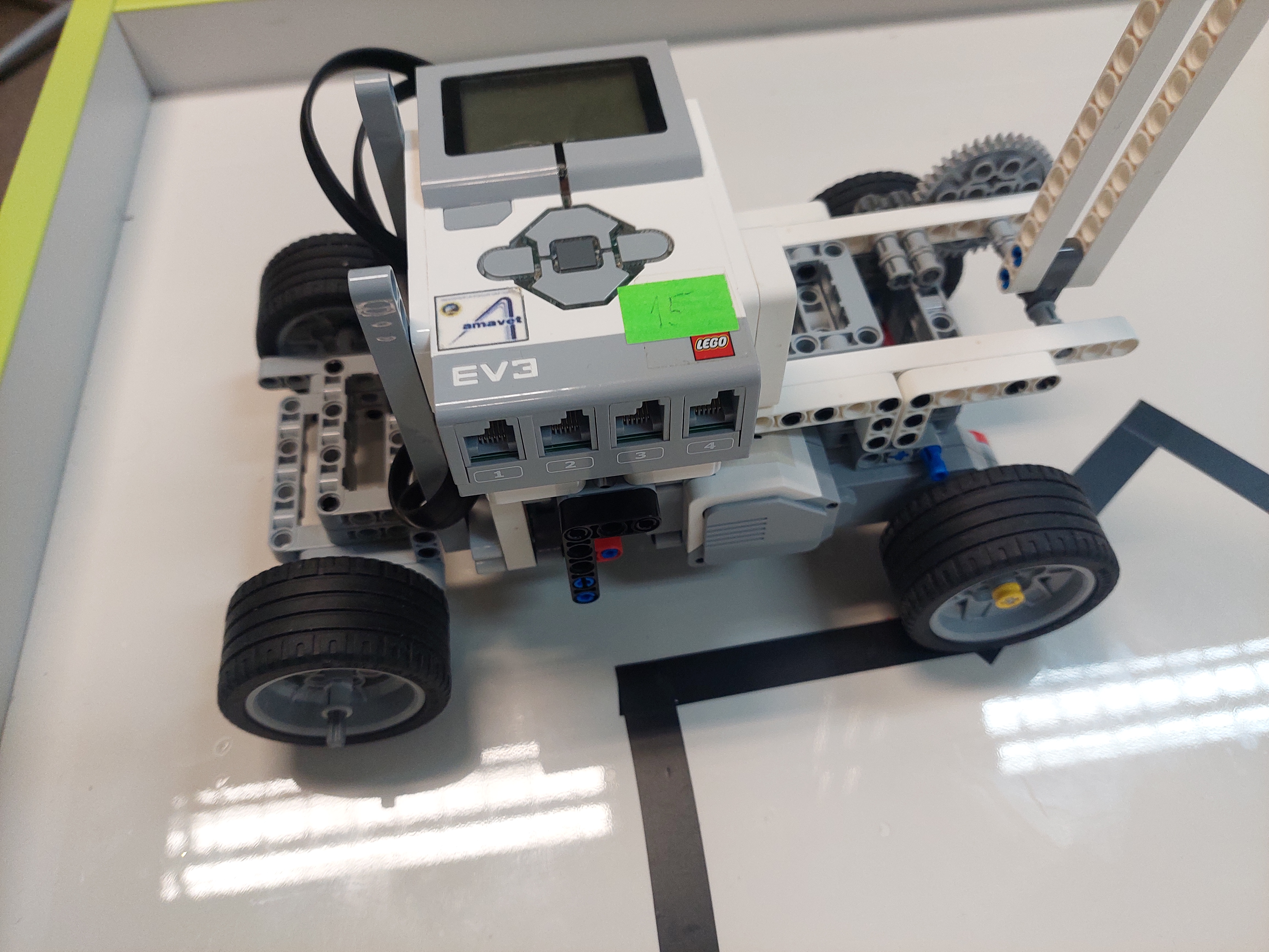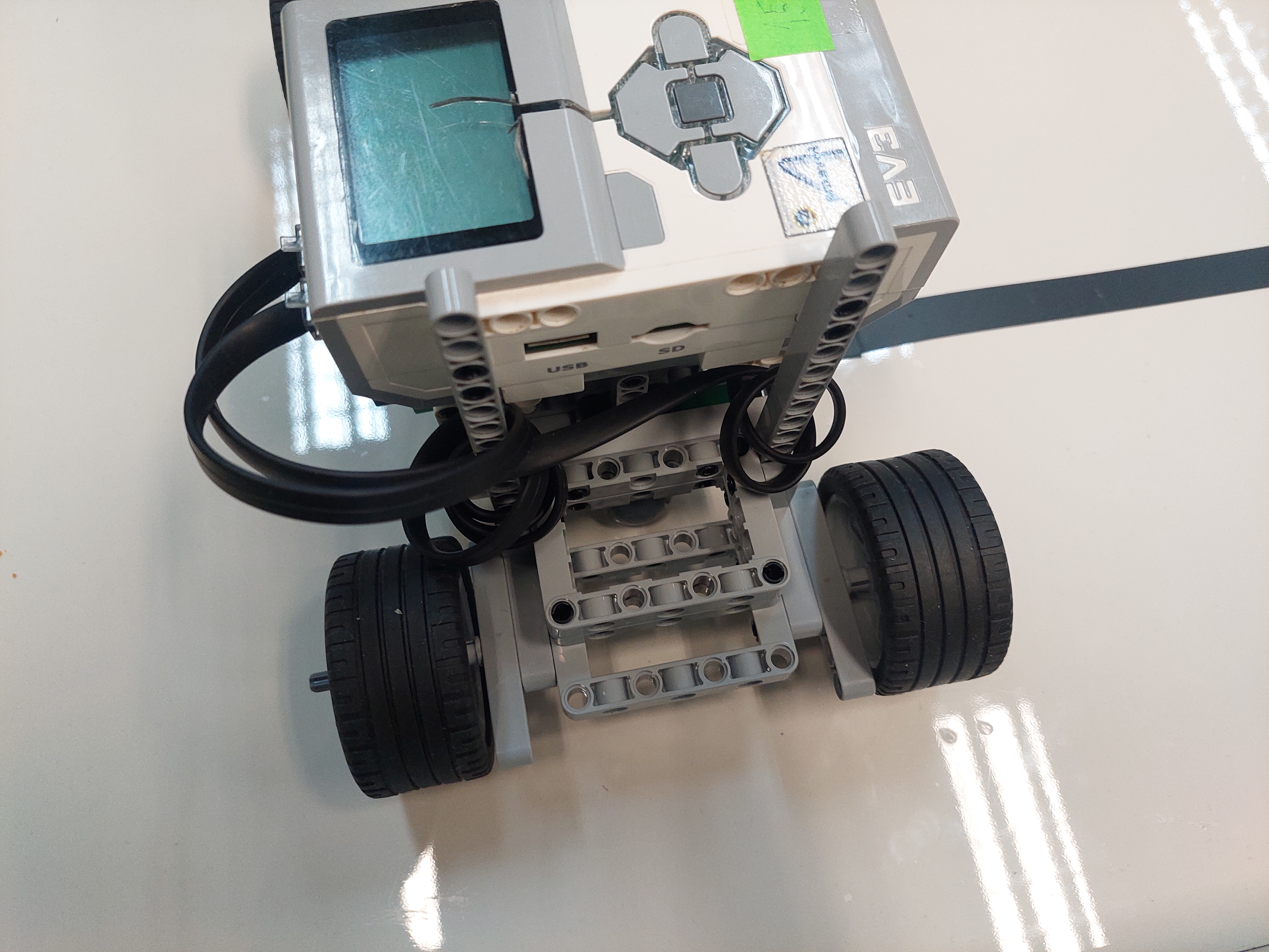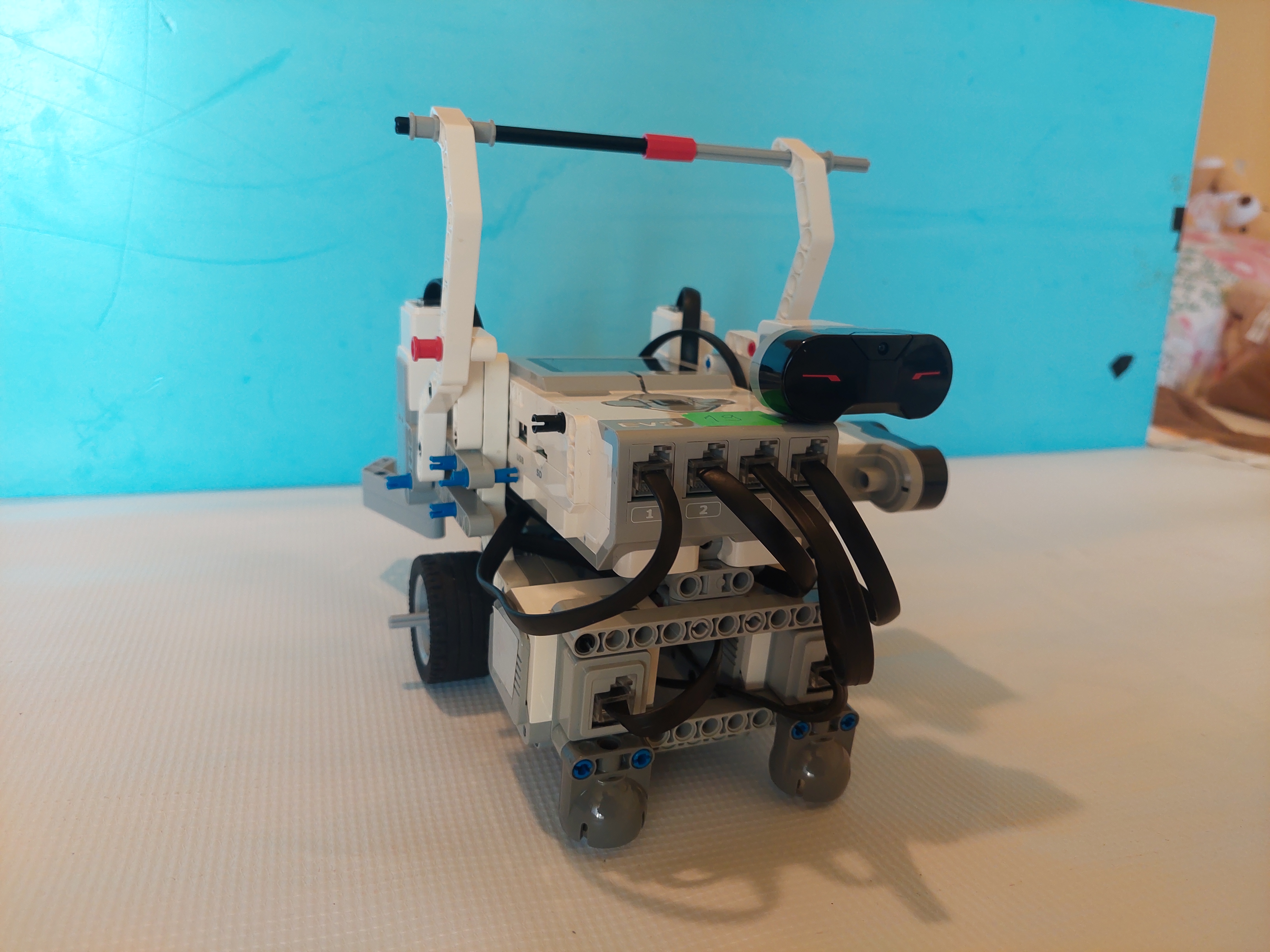 Stavba 1: na sledovanie čiary sme použili jeden farebný senzor. Druhý sme chceli použiť na rozlišovanie farieb. Robot sa po čiare veľmi kýval a tak sme nedokázali správne zamerať vzdialenosť. Pri opakovaných pokusoch nám ukázal rôzne vzdialenosti. Skúšali sme meniť hodnoty sledovania čiary ale nikdy to nešlo dobre. Preto sme tento pokus zamietli. Nedokázali sme dať o jeden senzor navyše.