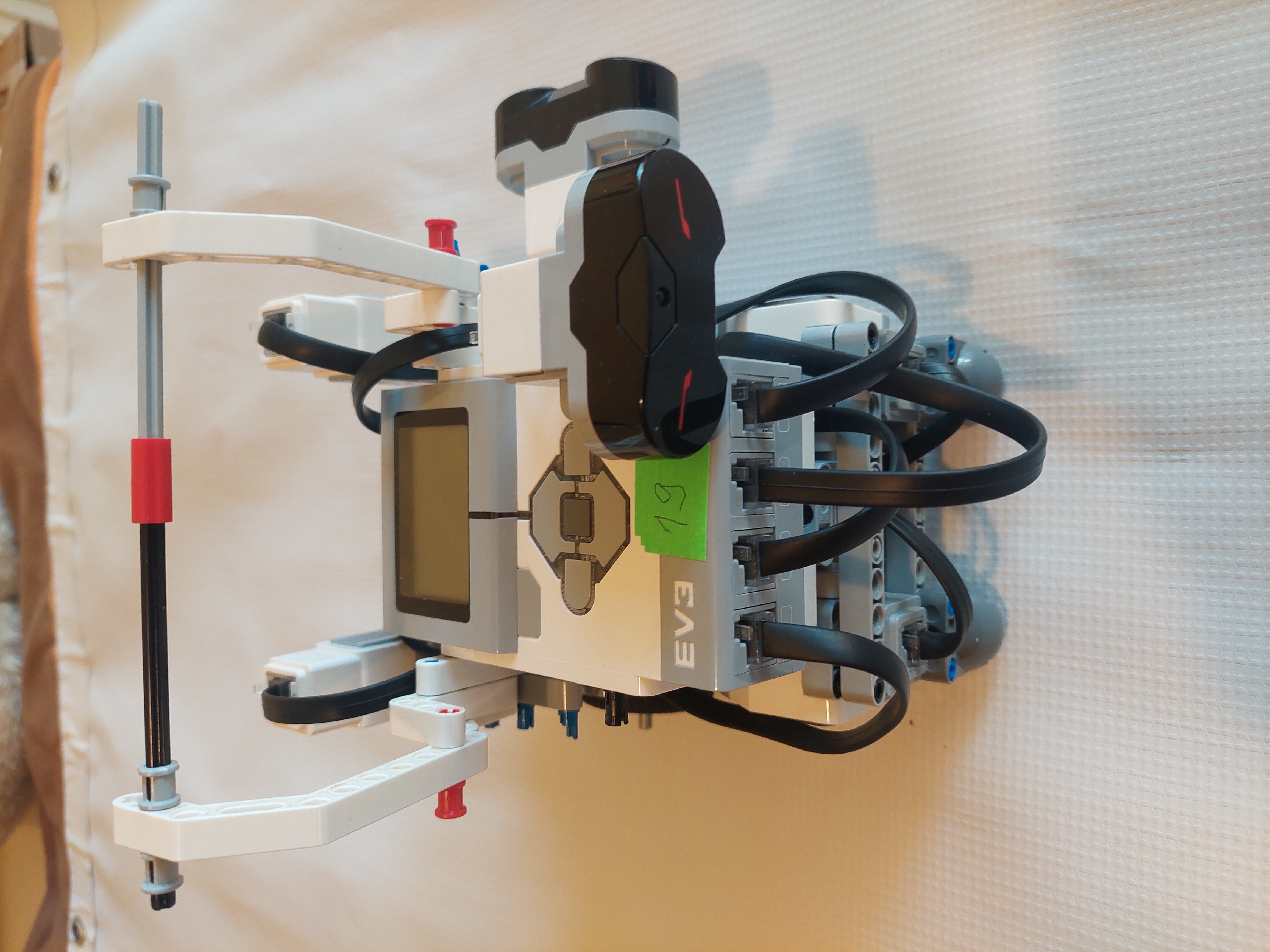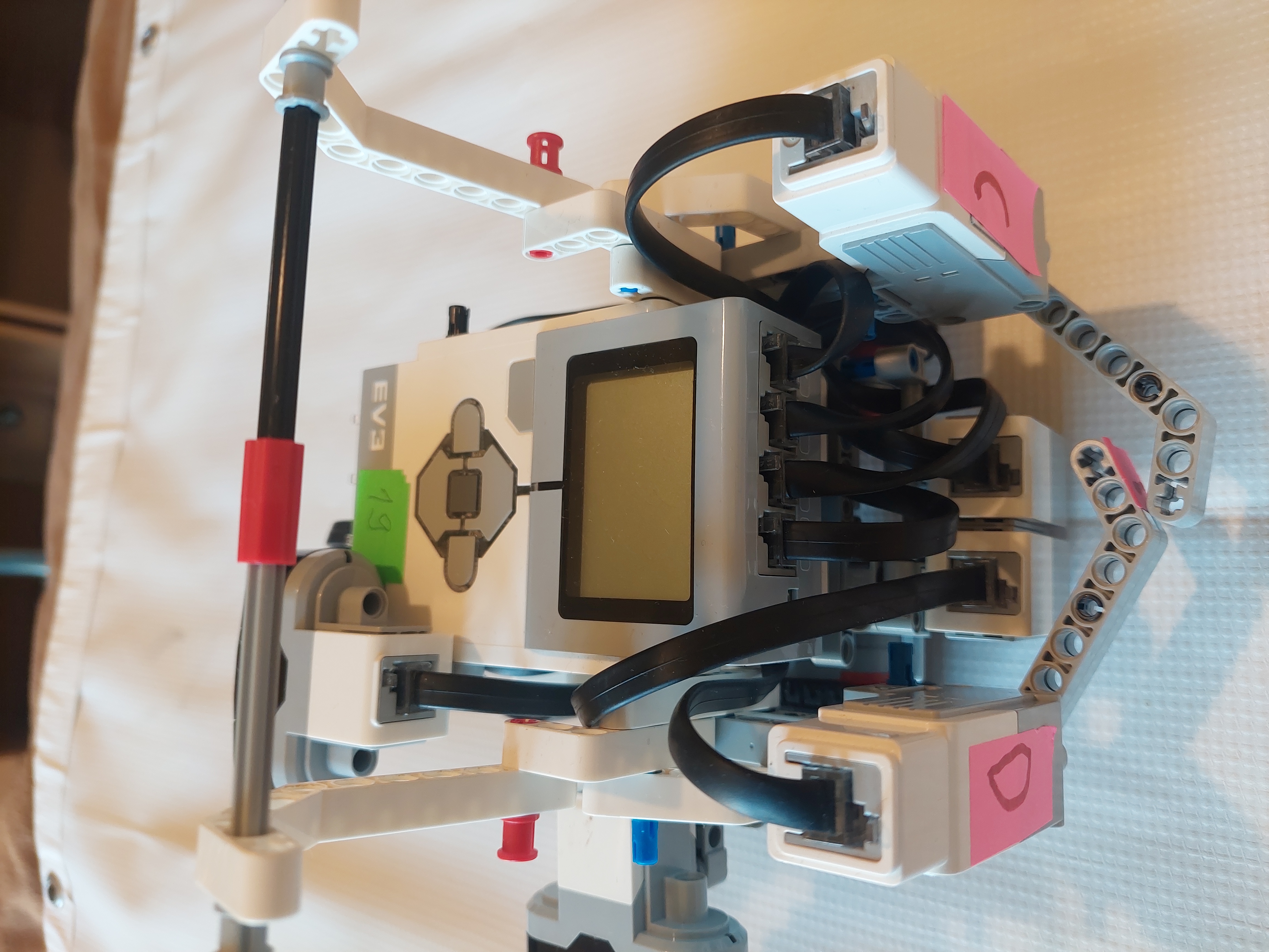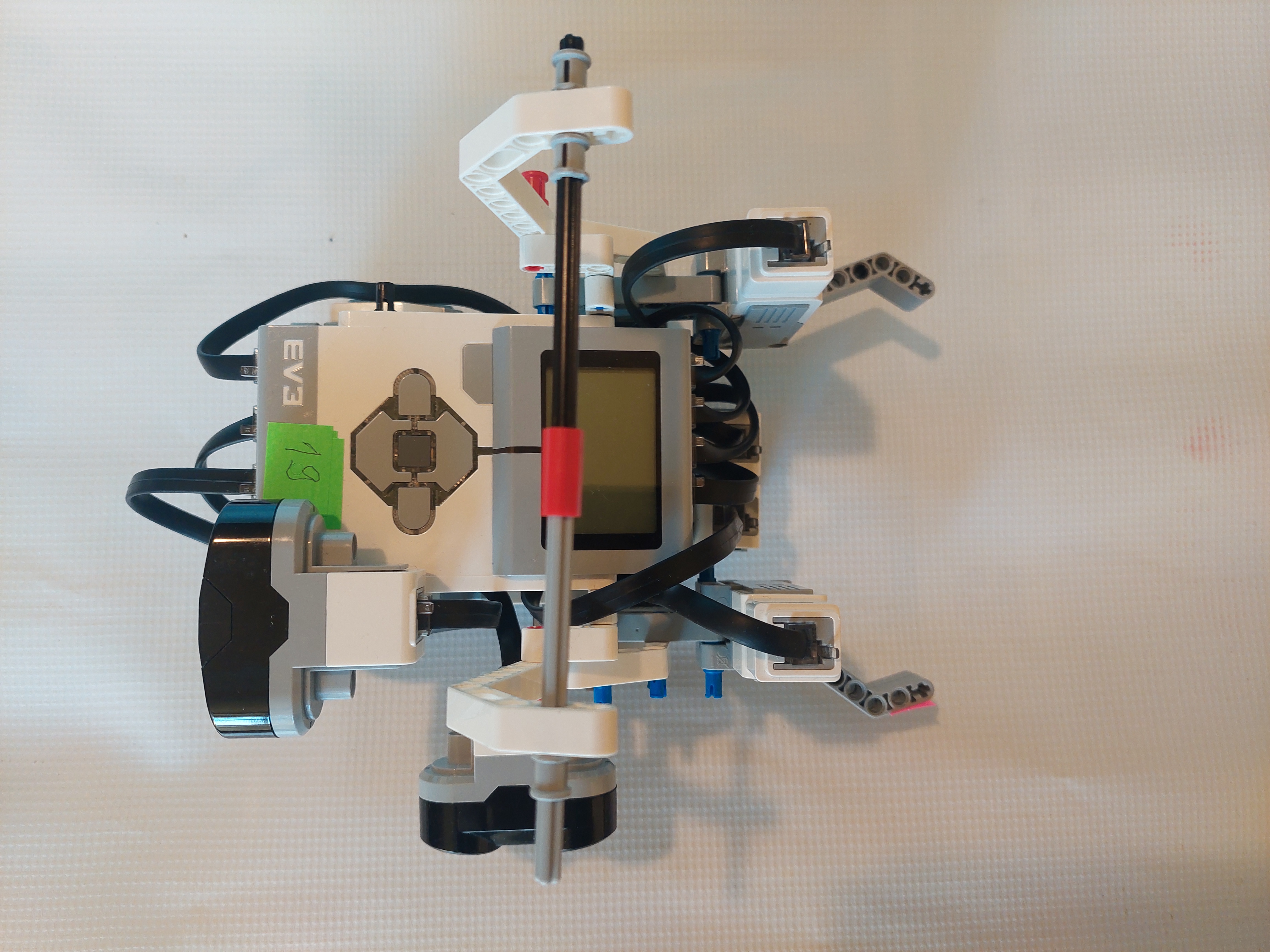 Krok3: začali sme meniť ťažisko a dĺžku paličky z Lego kociek. Toto sa nám ukázalo ako najvhodnejšie riešenie v kombinácii s nastavením trenia paličky o robota.
