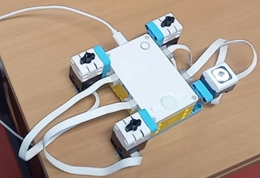 Náš robot sa skladá z jednej kocky SPIKE, dvoch veľkých a dvoch stredných motorov, ktoré ovláduajú ruky, na ktorých robot visí.