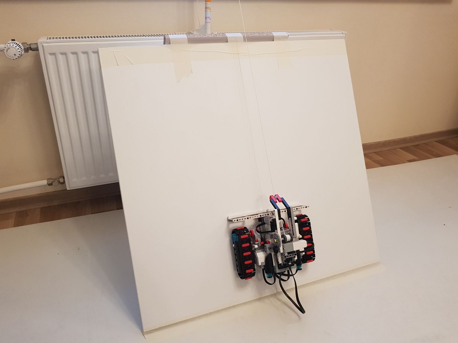 Svah so sklonom 60° po ktorom sa robot pohybuje je vytvorený z dvoch poličiek so šírkou 40 cm a dĺžkou 80 cm. Ratrak sme vytvorili úpravou základného modelu Tank Bot, na ktorý sme umiestnili navijak na otočnom ramene. Navijak je dostatočne silný na zdvihnutie celého robota. Koniec lanka je upevnený na tyčke rovnobežne so svahom. Na svahu so sklonom 60° otáčanie robota nebolo presné, lebo pásy sa veľmi šmýkali - ratrak skôr visel na lane ako stál na svahu.